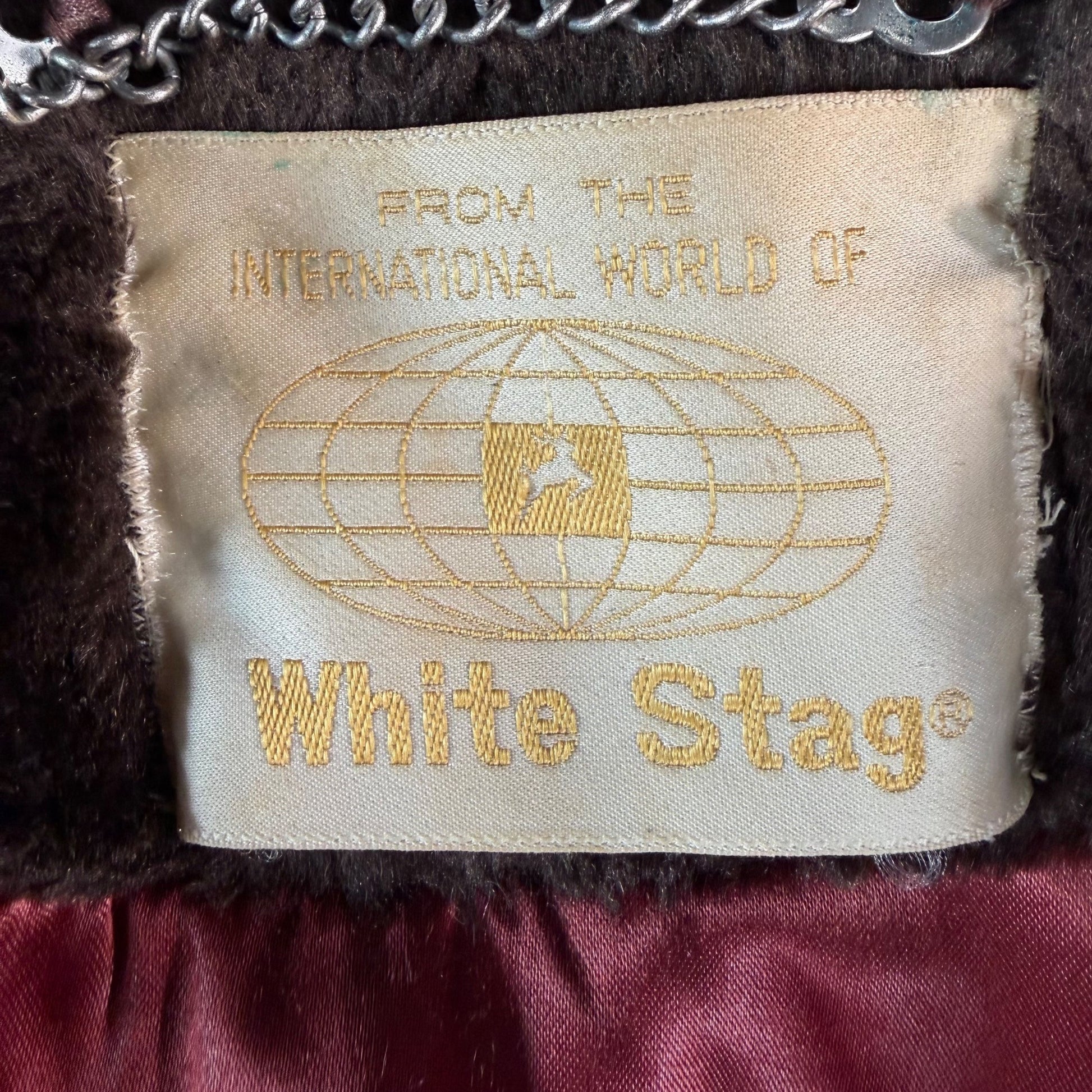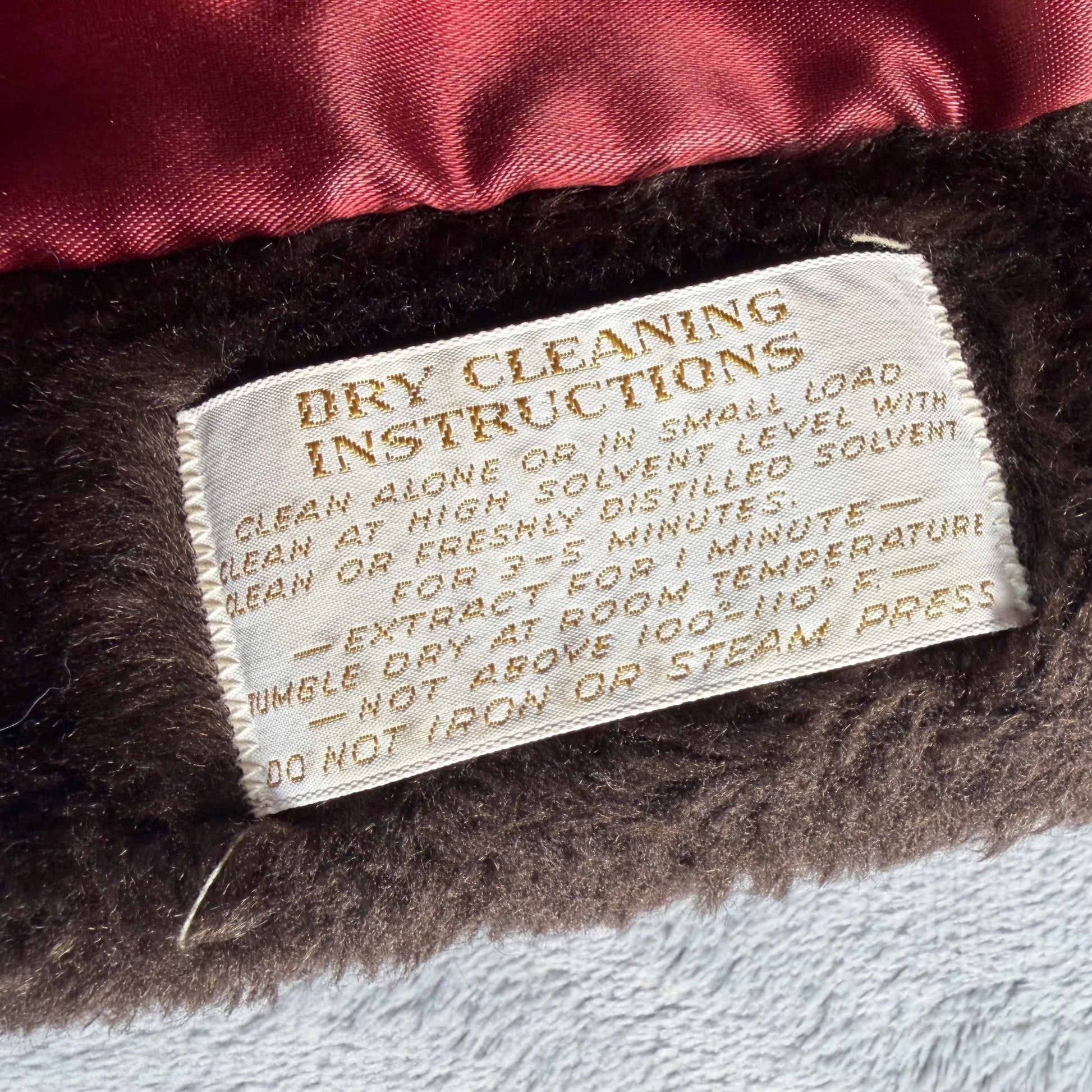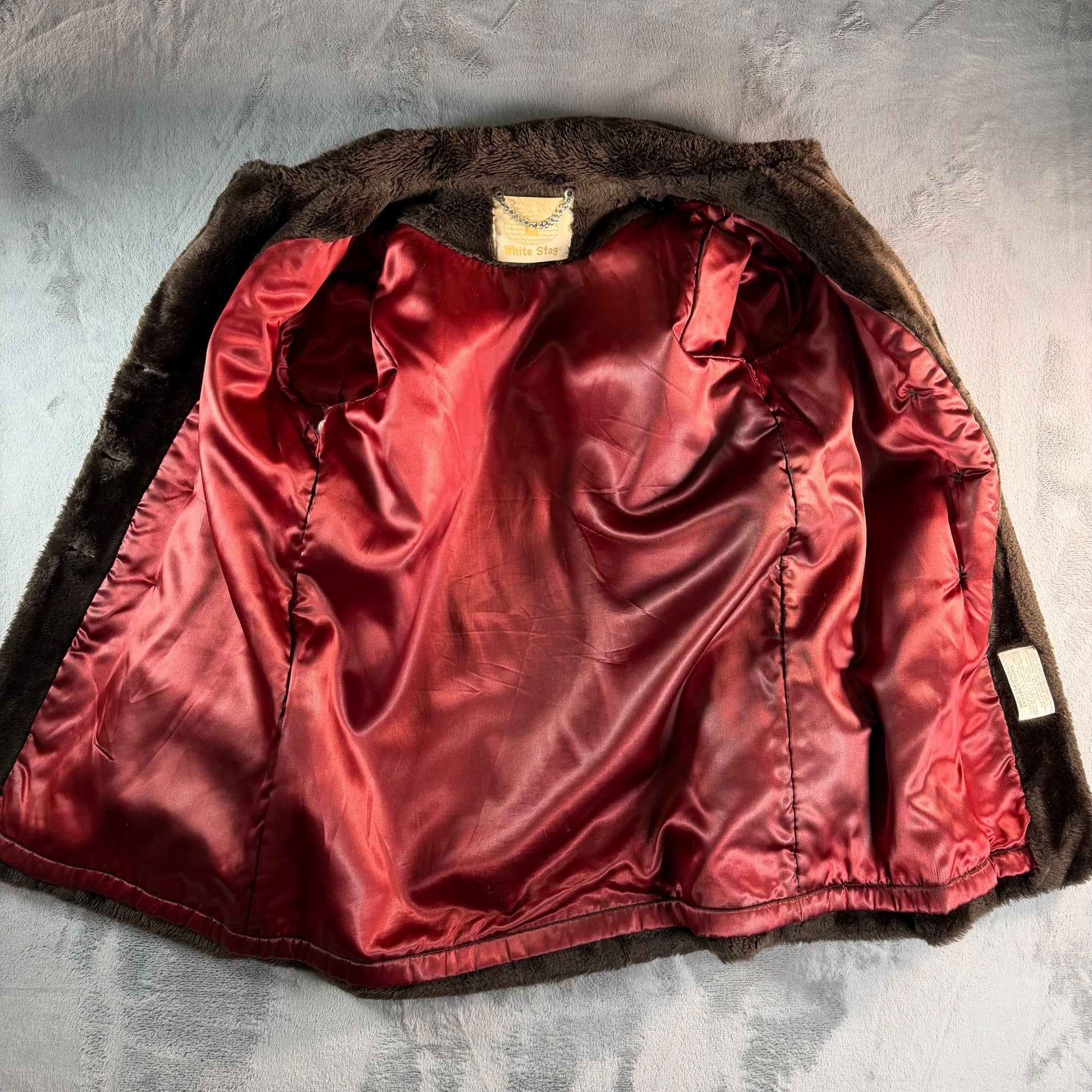 Good overall used vintage condition. Top left button is loose but still attached. Faux fur pile shows minor flattening and a few light rubs from age and storage. Inner lining has tears at both pits (not visible when coat is worn). Tears in lining of right patch pocket. Generally moderate wear throughout. See photos for details.