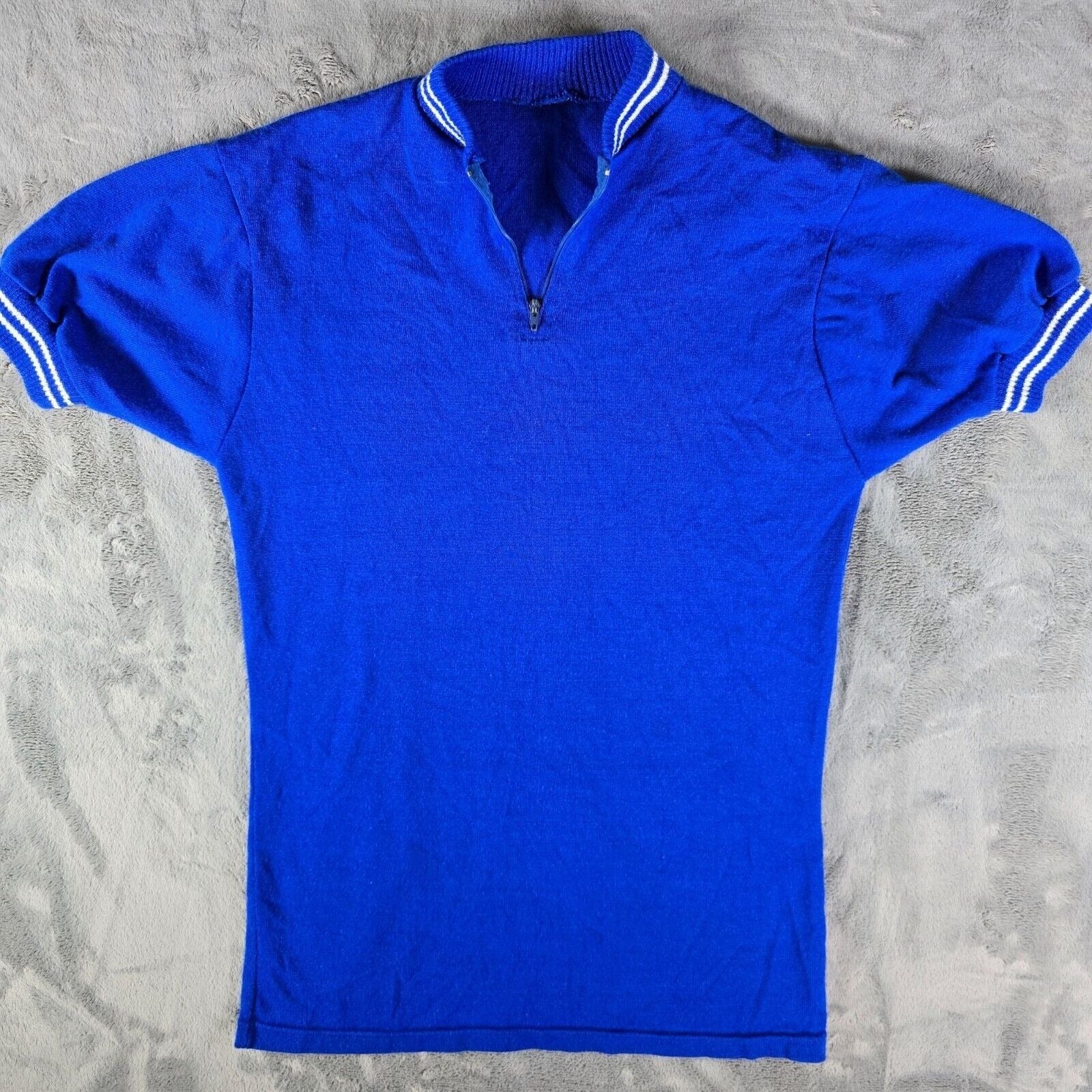 Vintage 1970s Au Tour De France Quarter Zip Knit Blue Cycling Jersey (Small)