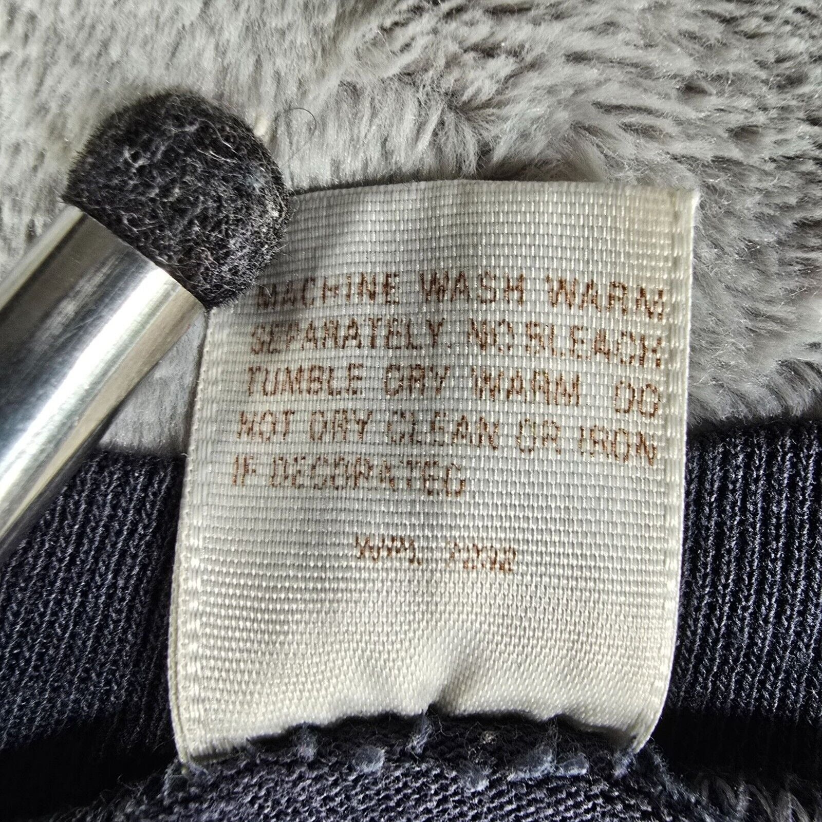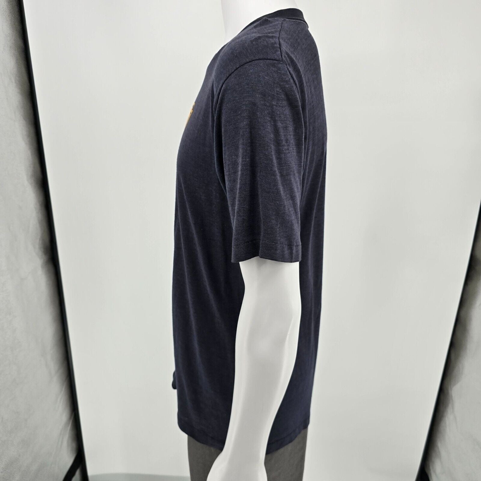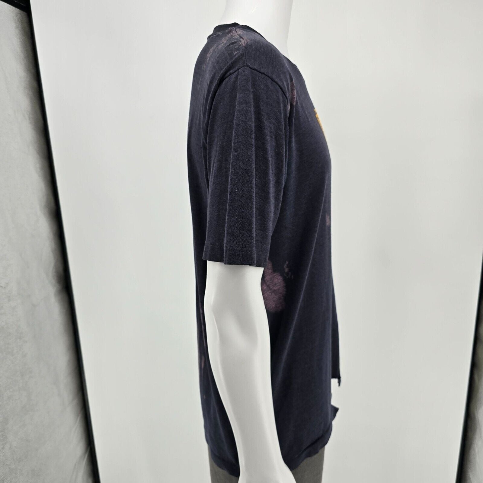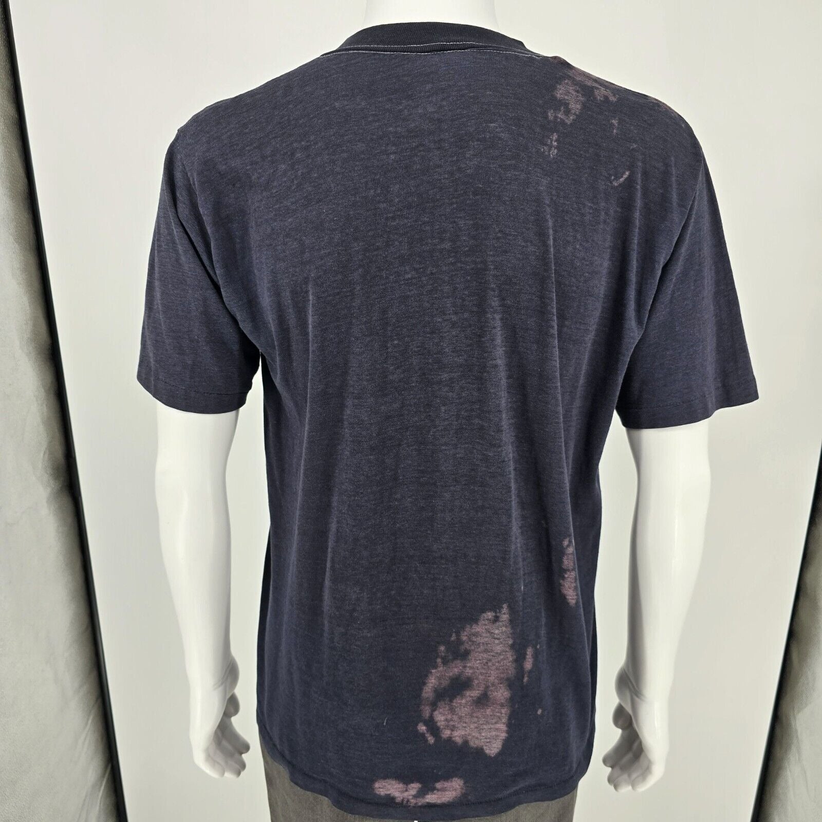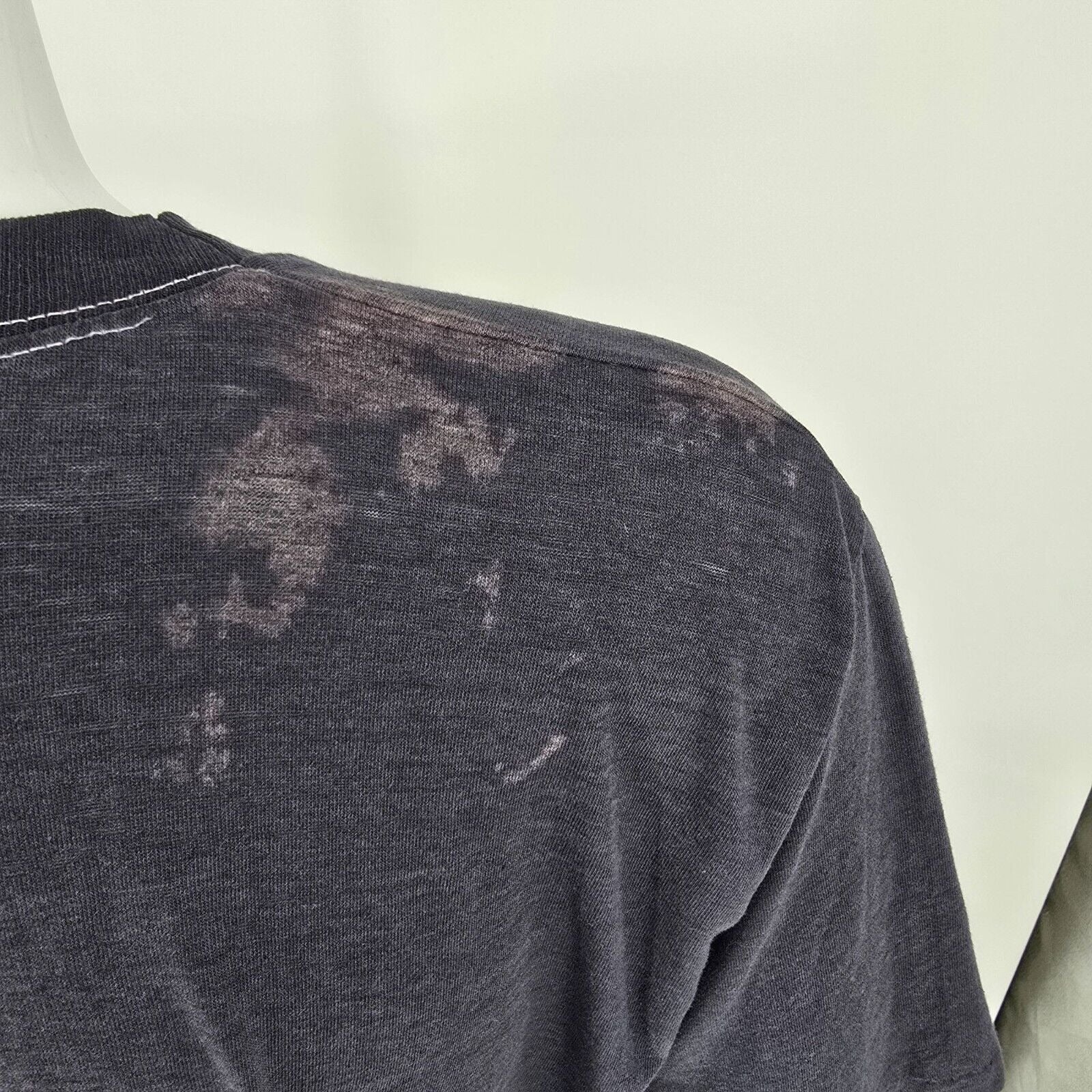 Large spots of bleach staining/discoloration at shoulder, near front logo, on right side, and along bottom half of back of t-shirt.
