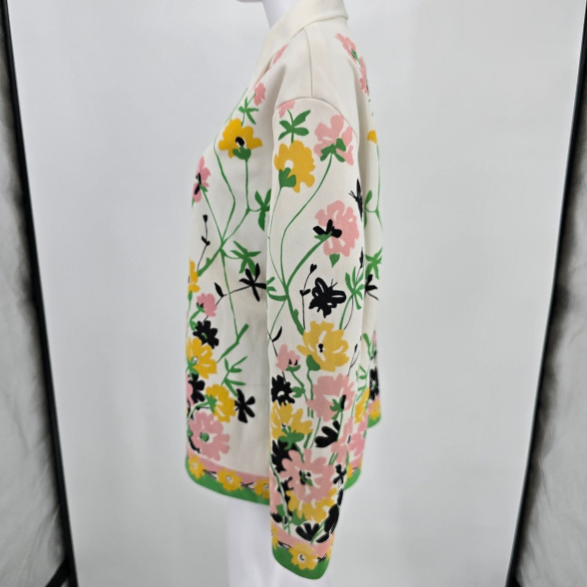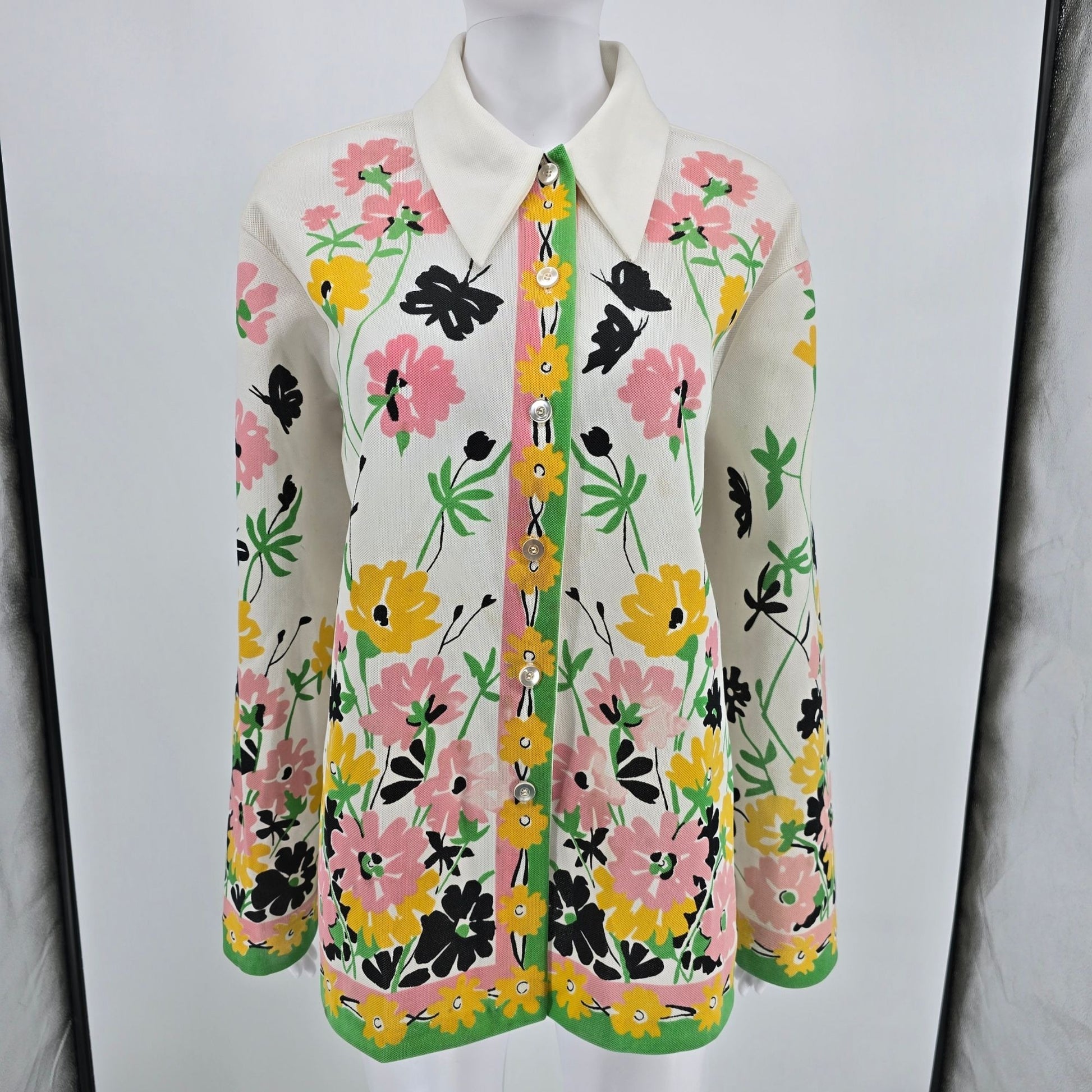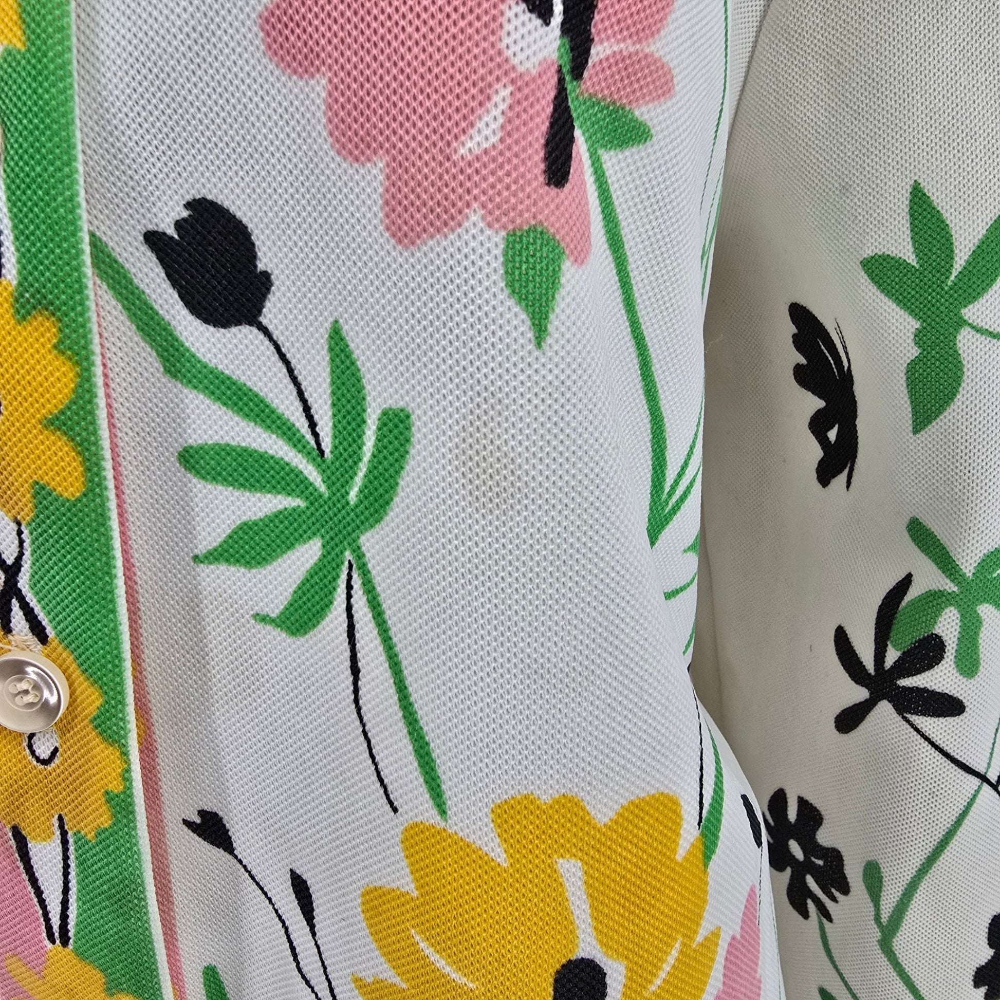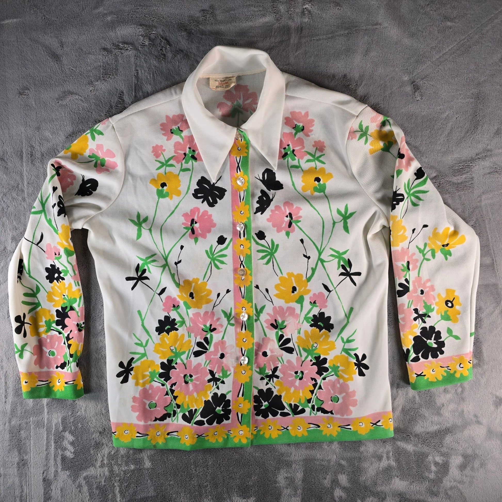 Vintage 1970s Floral Butterfly Polyester Double Knit Button-Up Top (XXL)