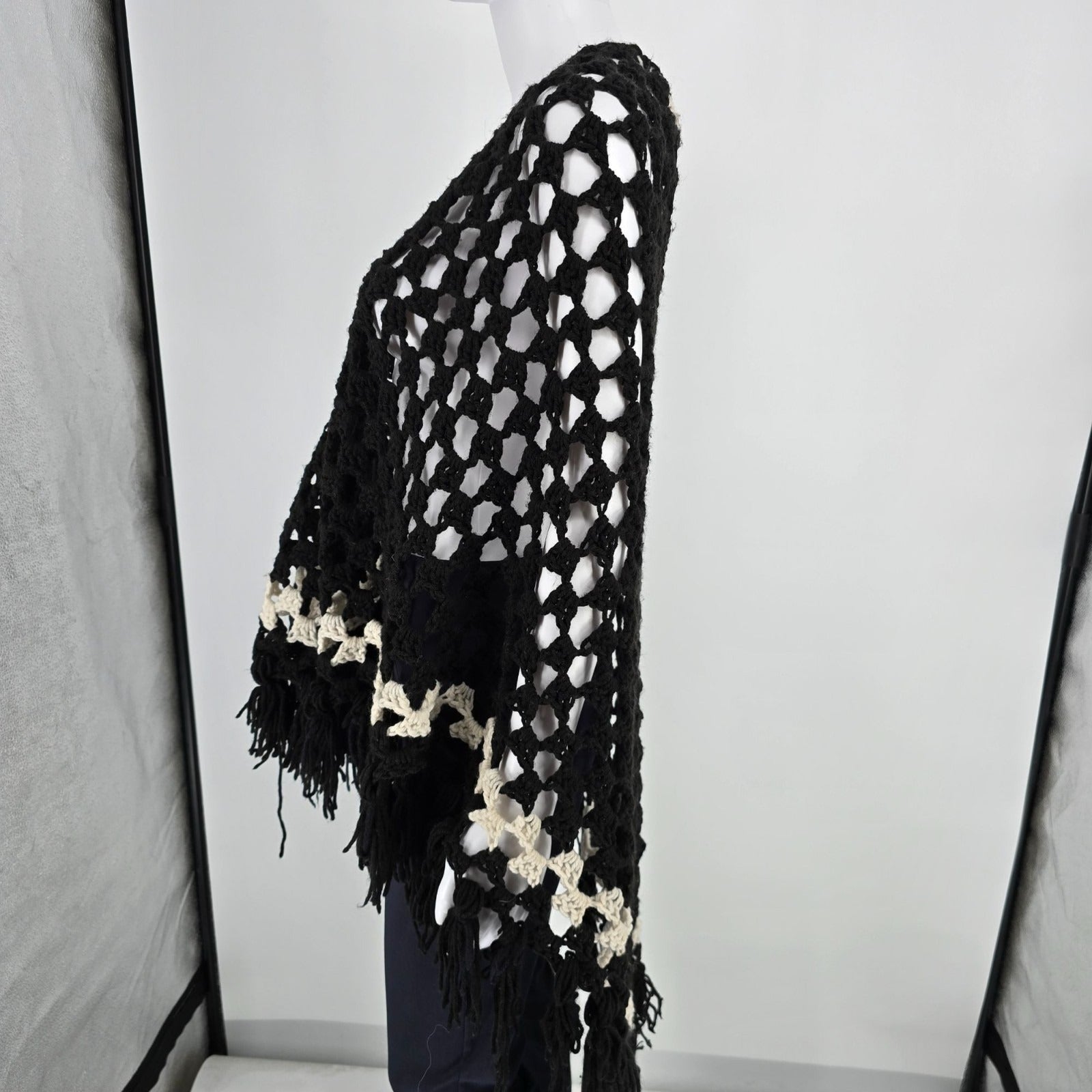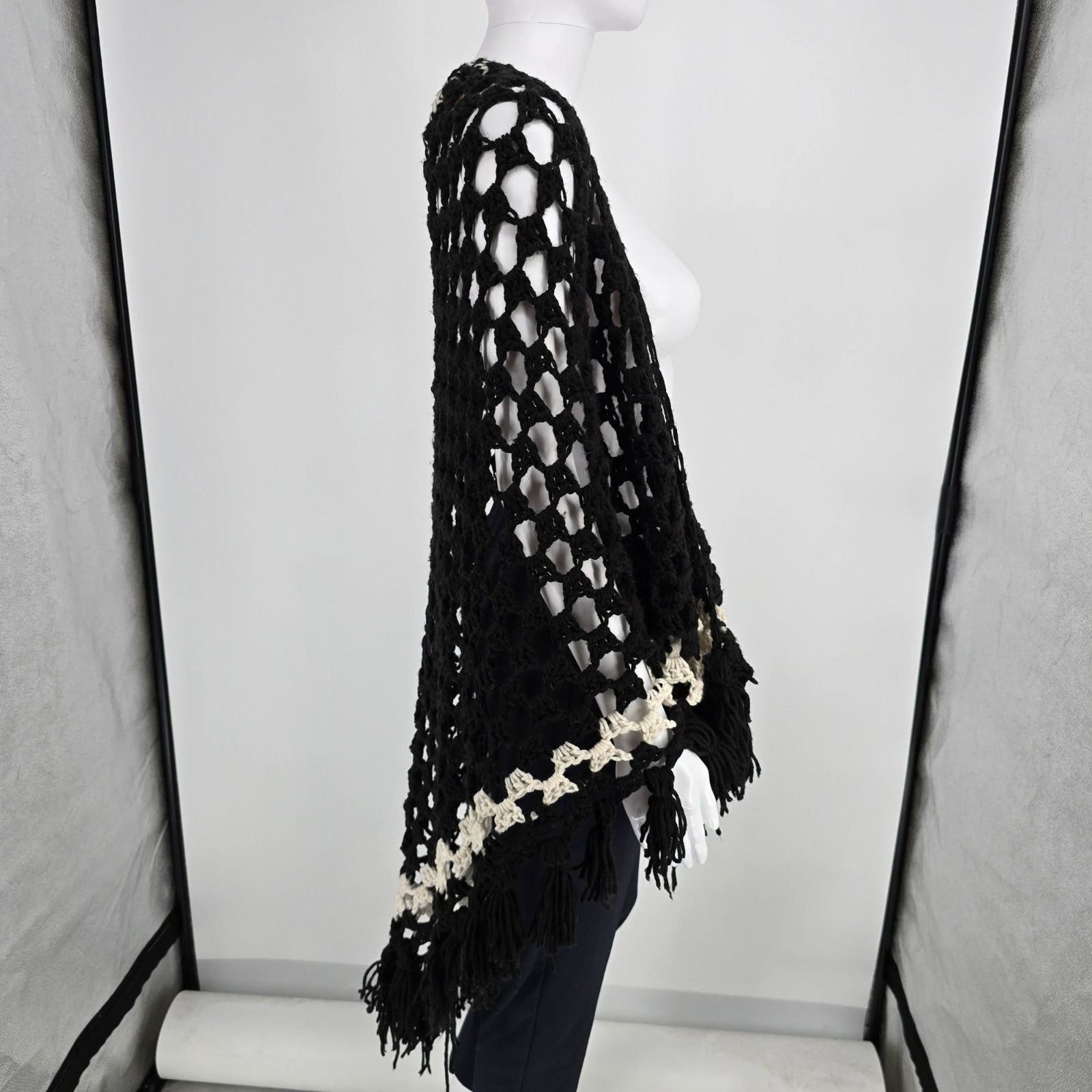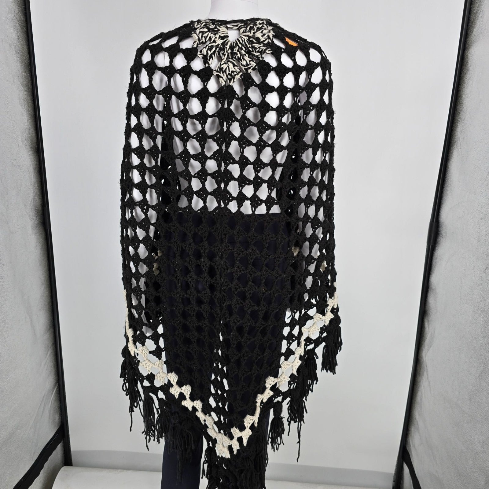 Vintage 1970s Handmade Black/Cream Boho Hippie Fringe Crochet Shawl (One Size)