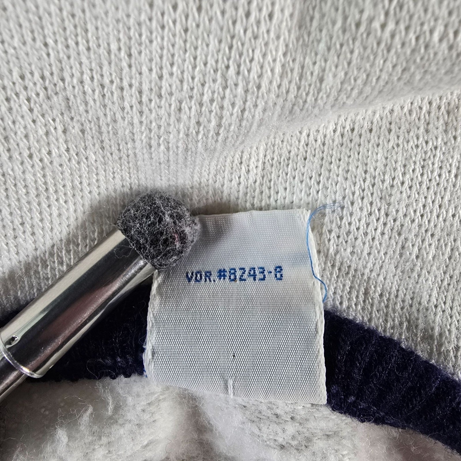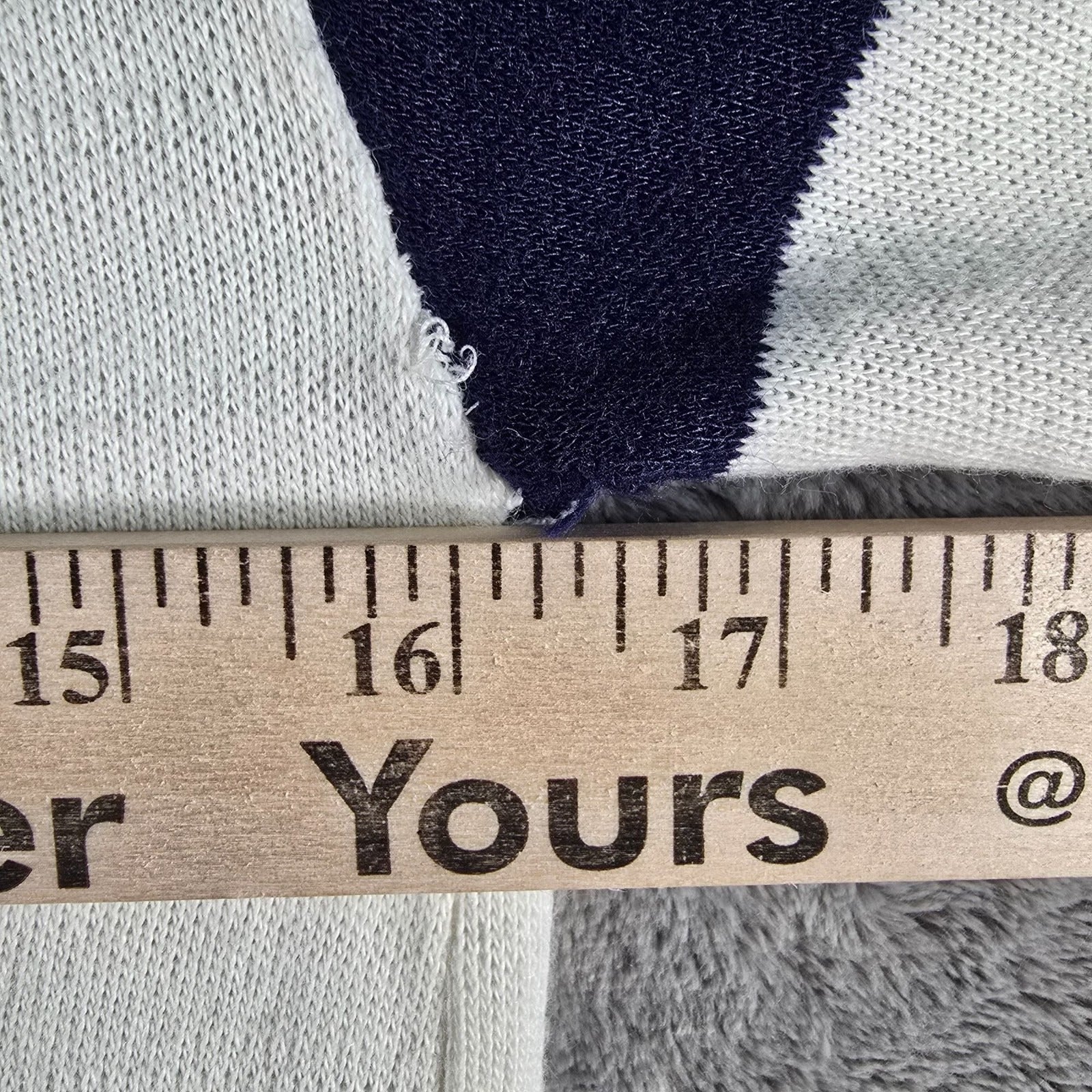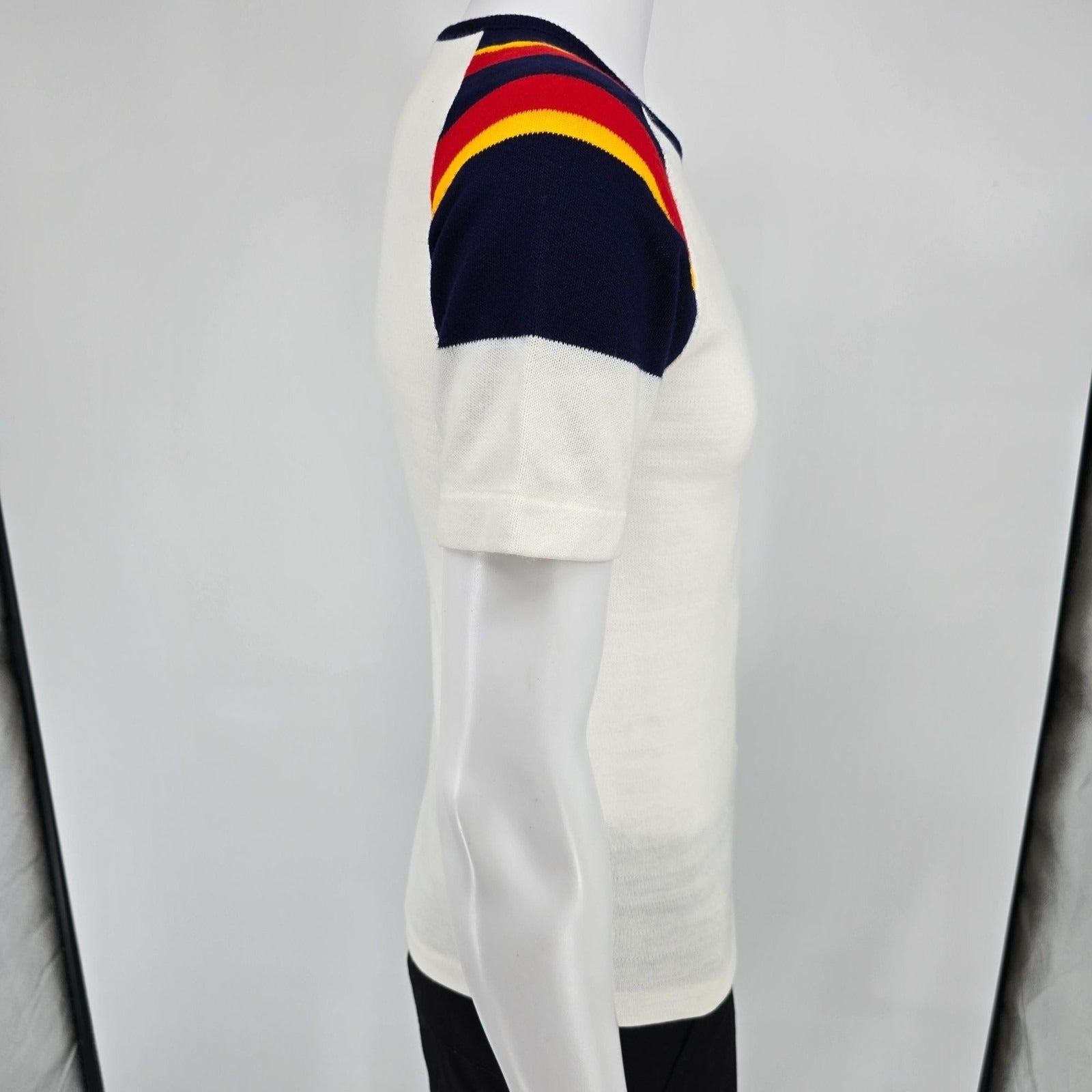 Notable Features: Single-stitch hem; triple rainbow shoulder stripes, lightweight acrylic knit