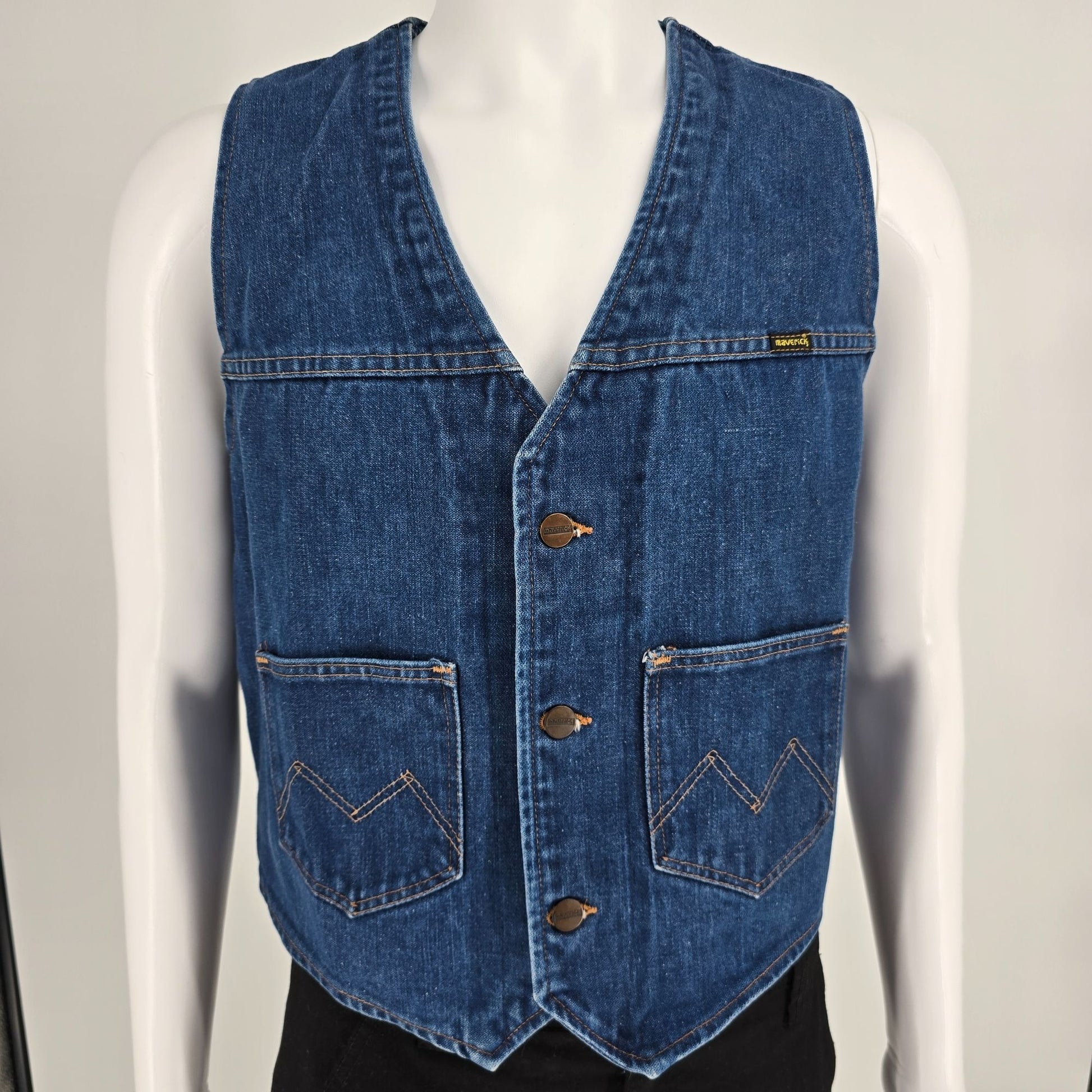 Vintage 1970s Maverick Automaticks Men's Western Blue Jean V-Neck Denim Vest (L)