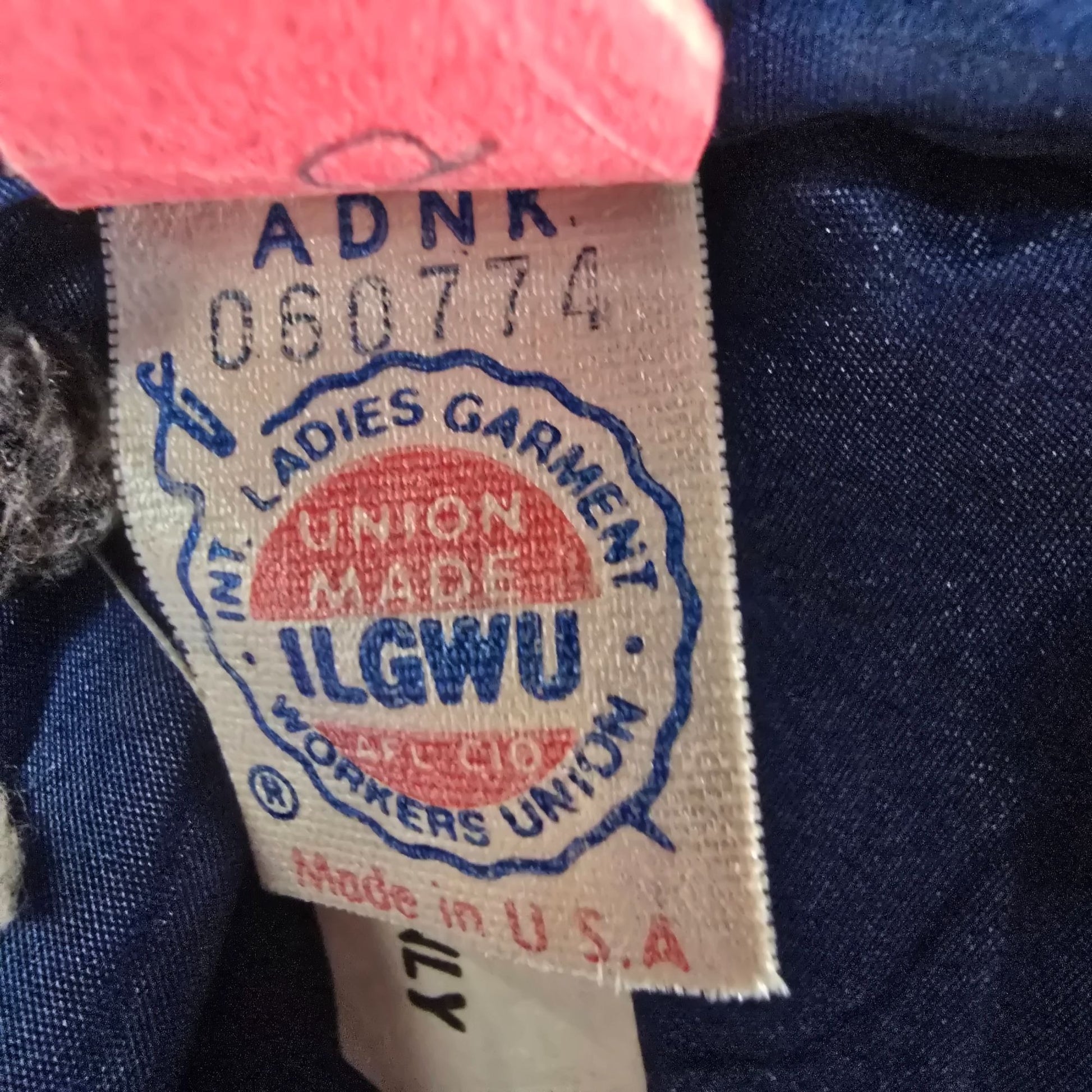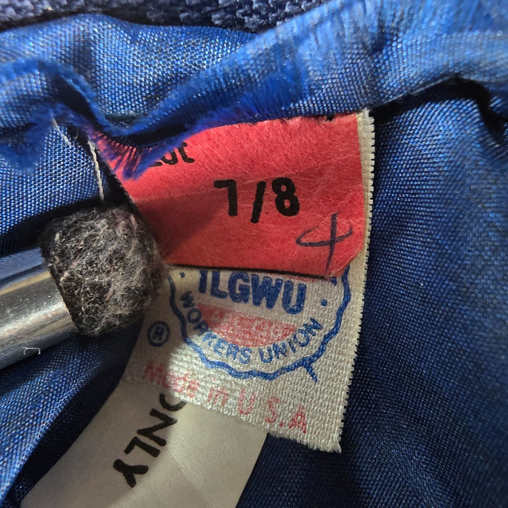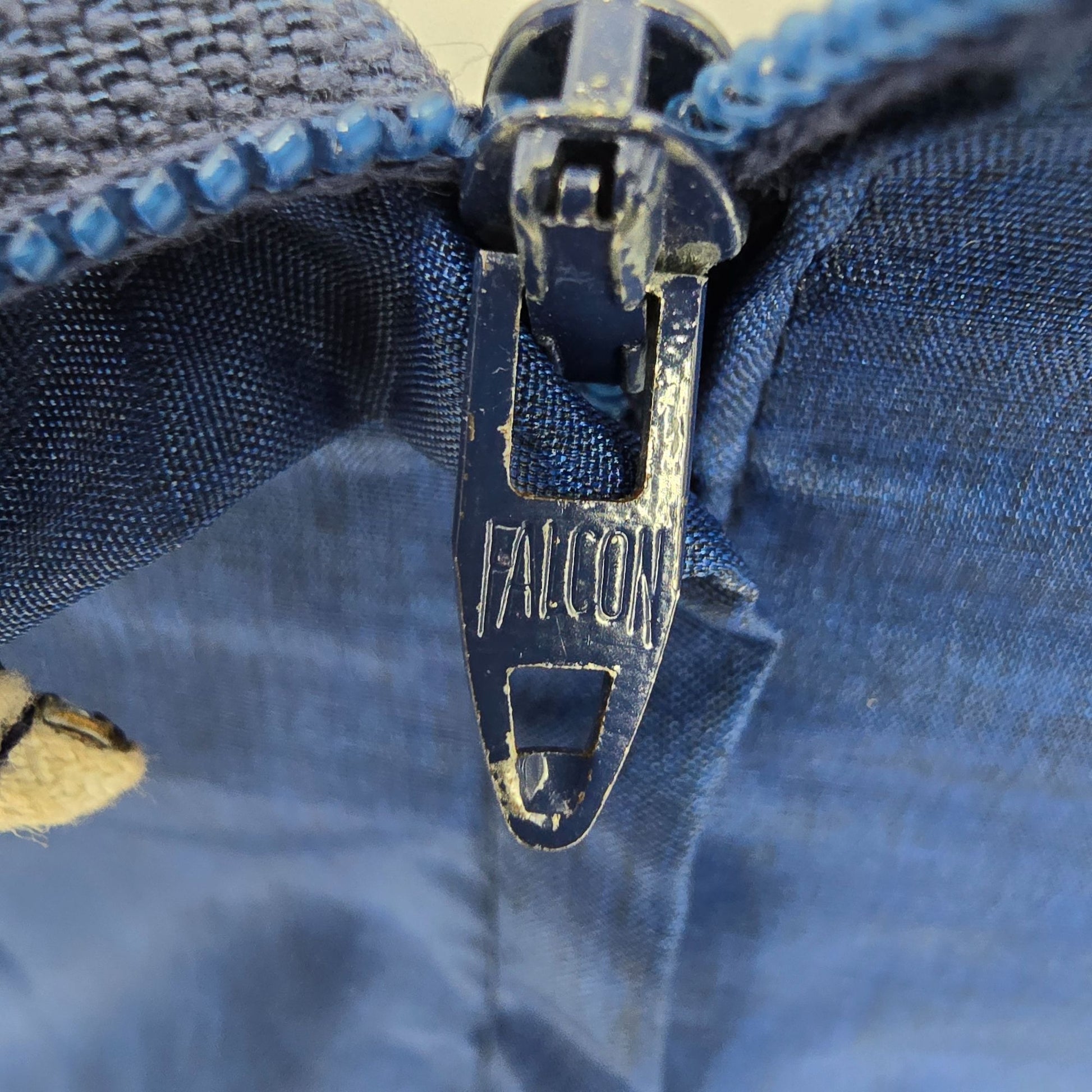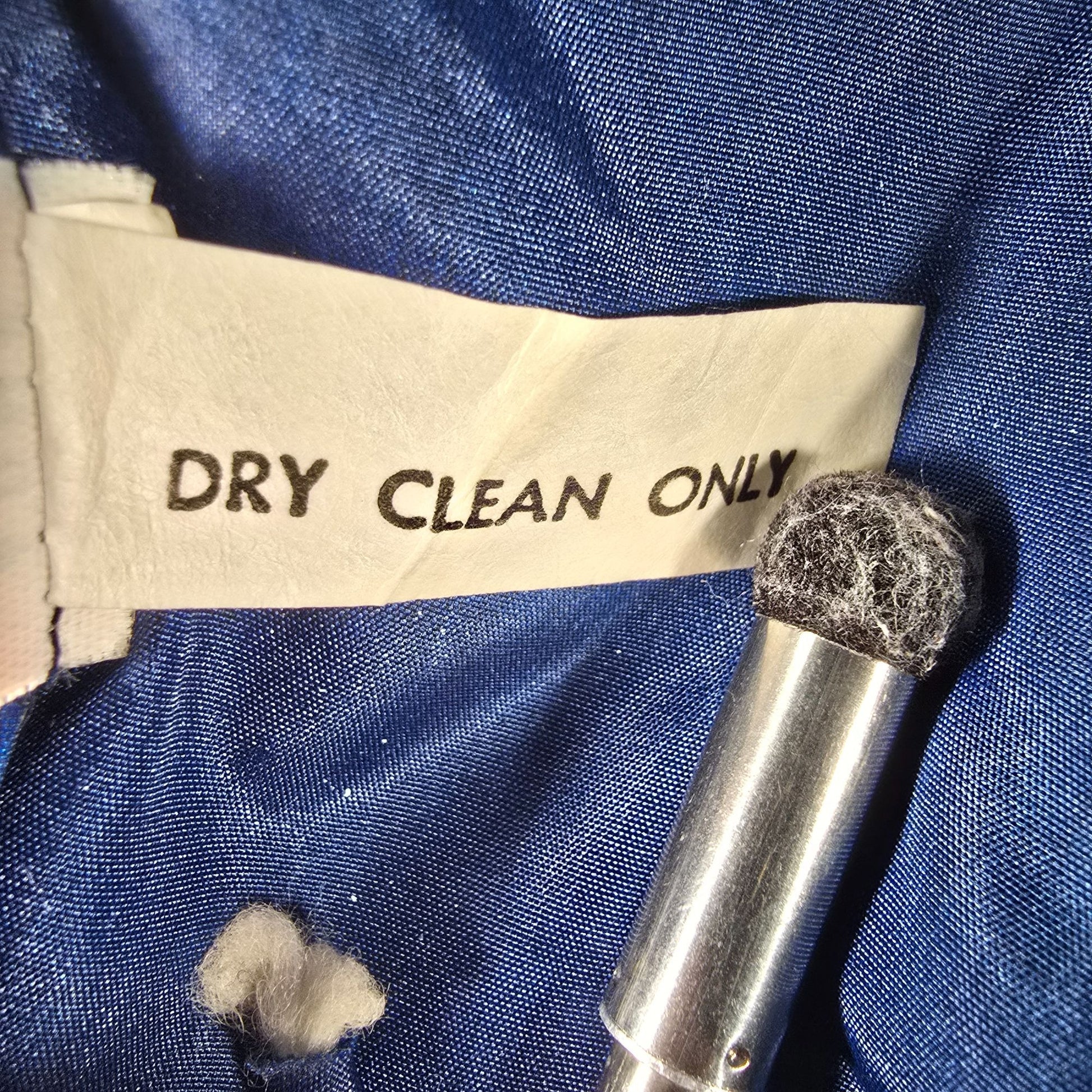 Good overall used vintage condition. Missing back hook at top of collar. Some scattered spots of dark discoloration on fabric. Some wrinkling/creasing from storage. Otherwise light wear throughout. See photos for details.