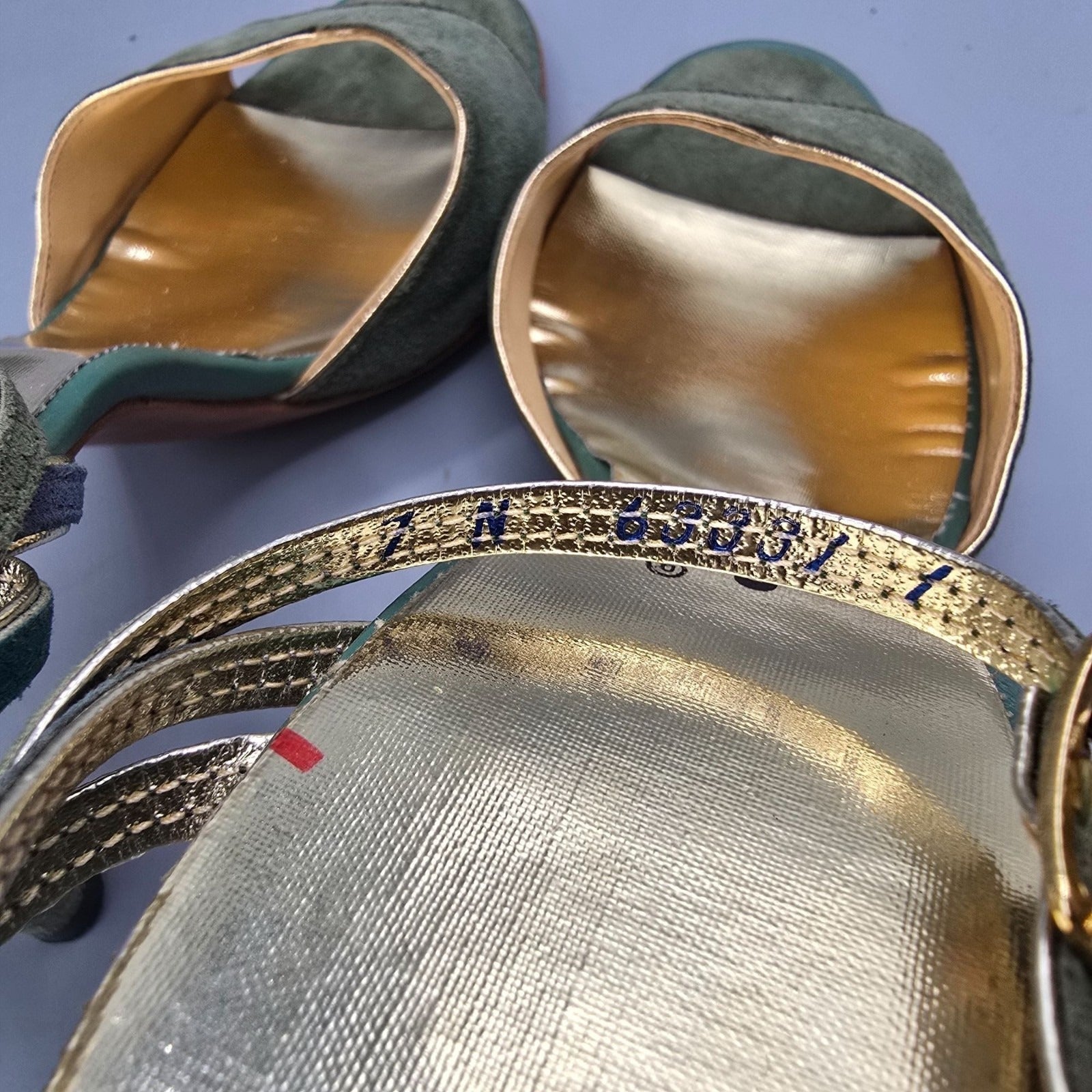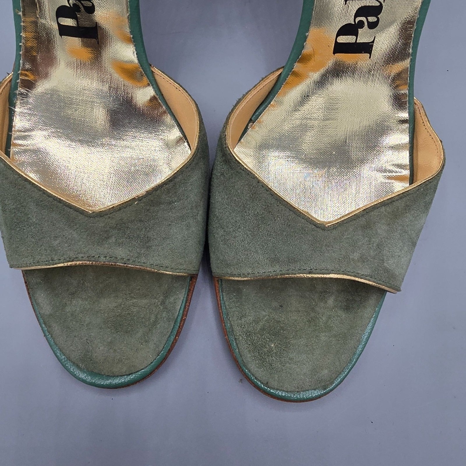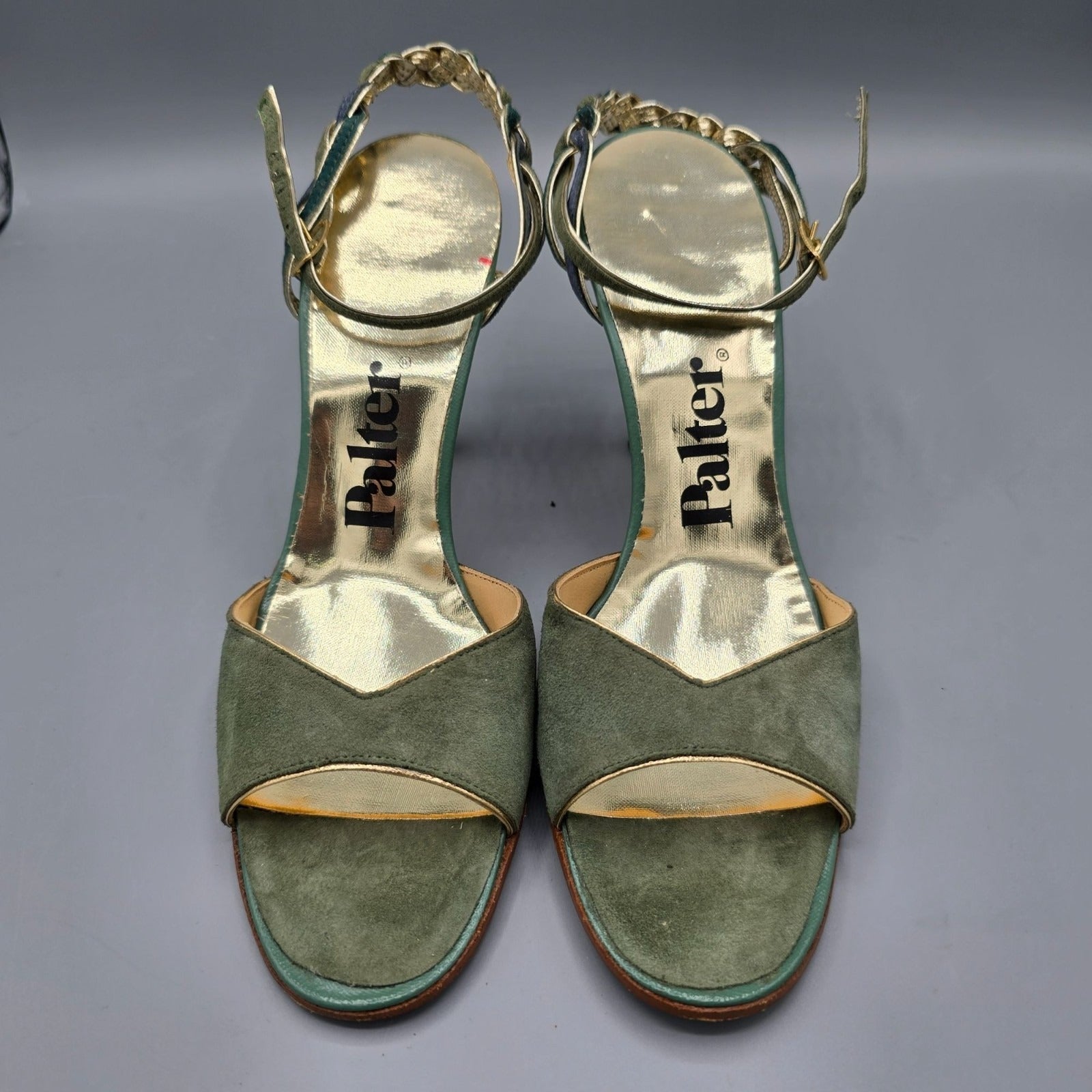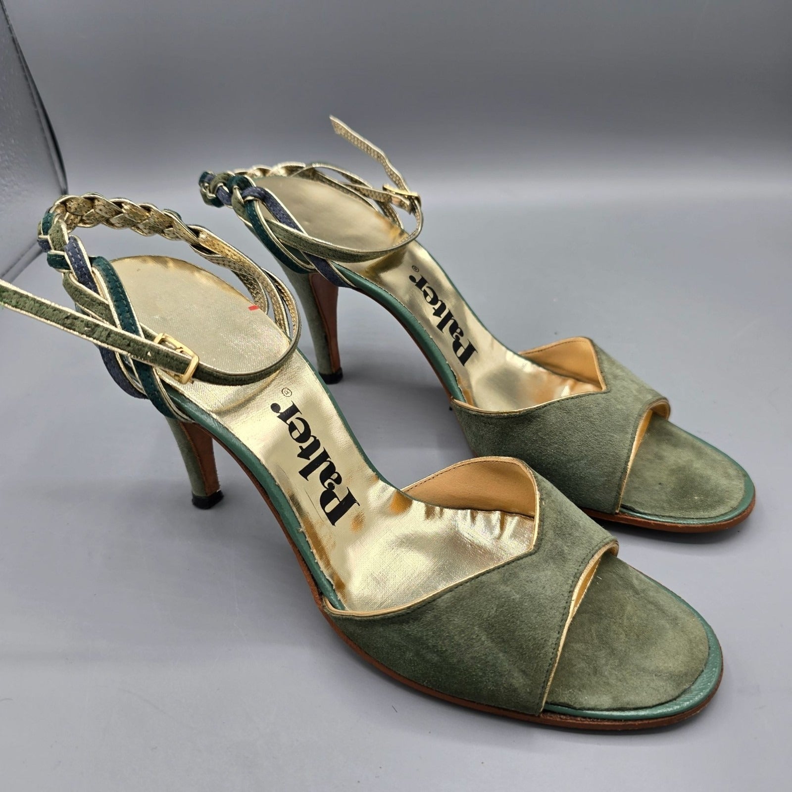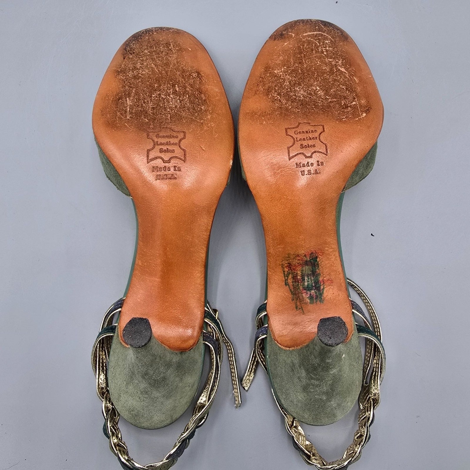 Vintage 1970s Palter Green & Gold Braided-Ankle Stiletto Disco Sandals (7N)