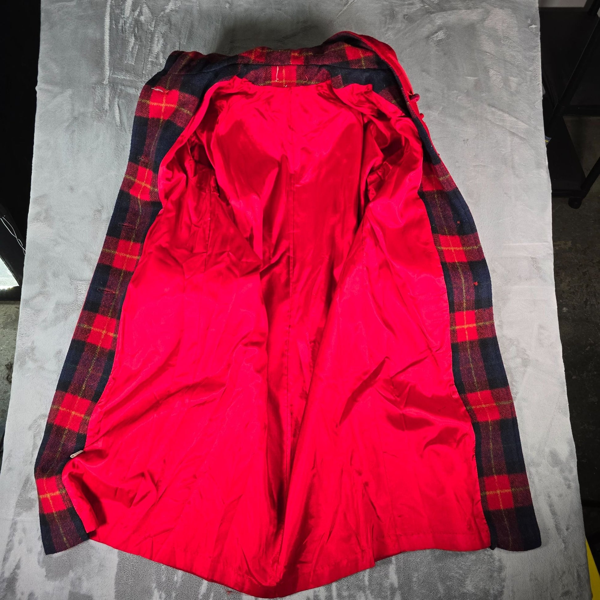 Notable Features: Hood with drawstring; toggle-style front buttons; oversized patch pockets; turn-back cuffs showing plaid; bright red lining; long midi/maxi length
