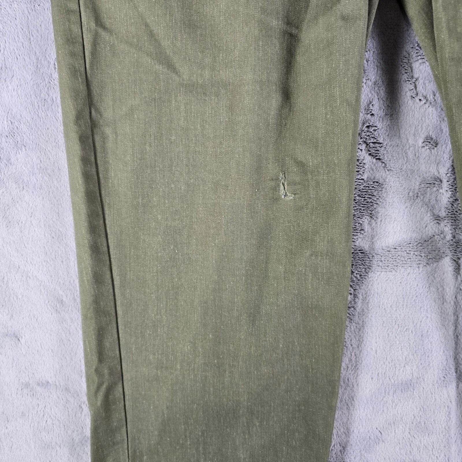 ---Fabric wear, fading, and holes on back of each leg at bottom near cuffs.