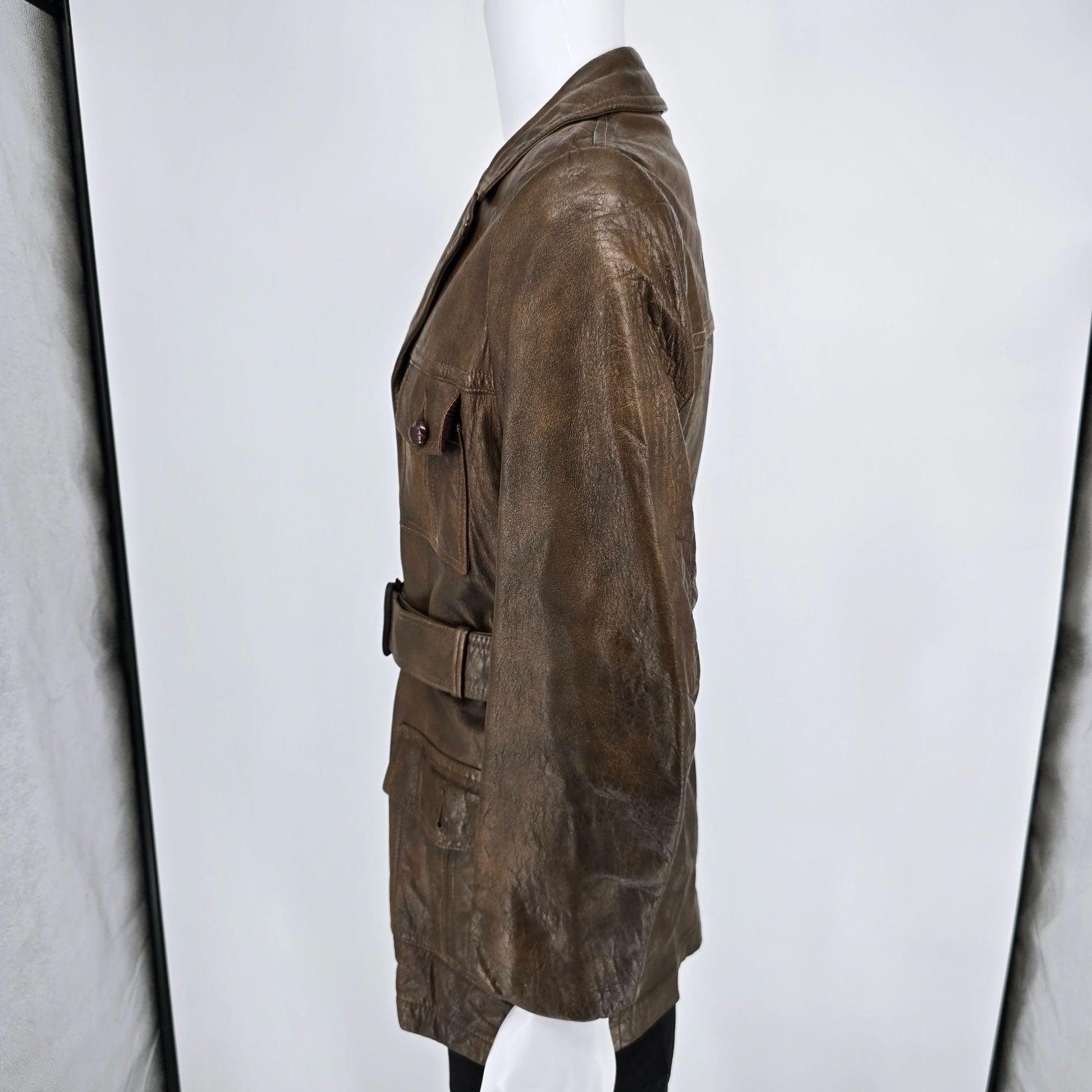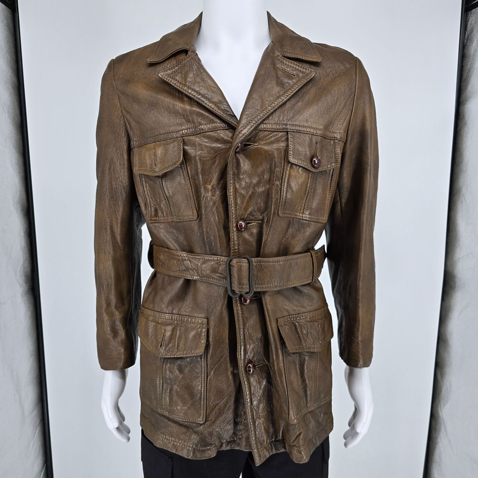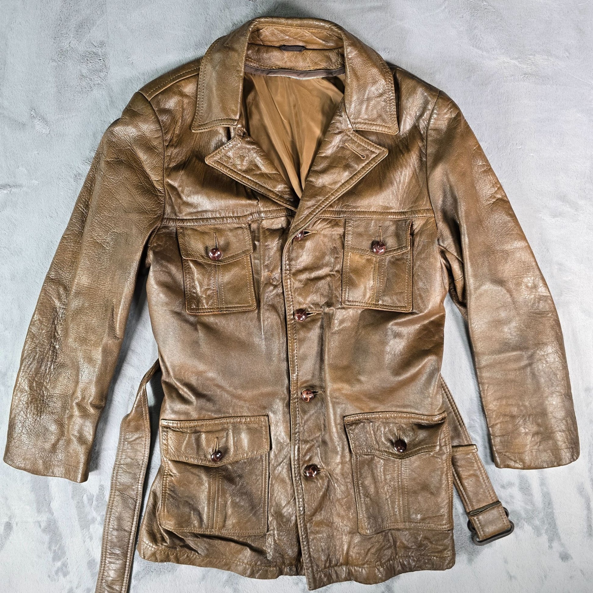 Vintage 1970s Unbranded Made in USA 4-Pocket Brown Leather Safari Jacket (Small)