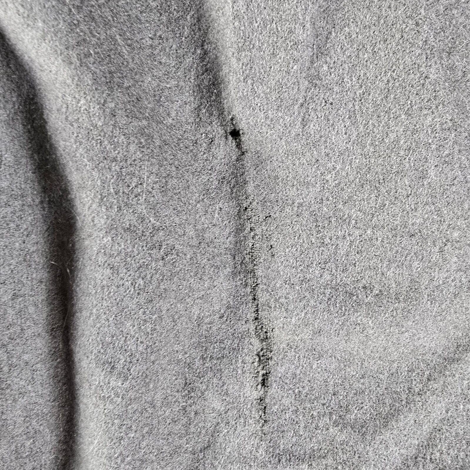 ---Fabric damage on both sides where pants were folded at pleats, including a hole in the left thigh.