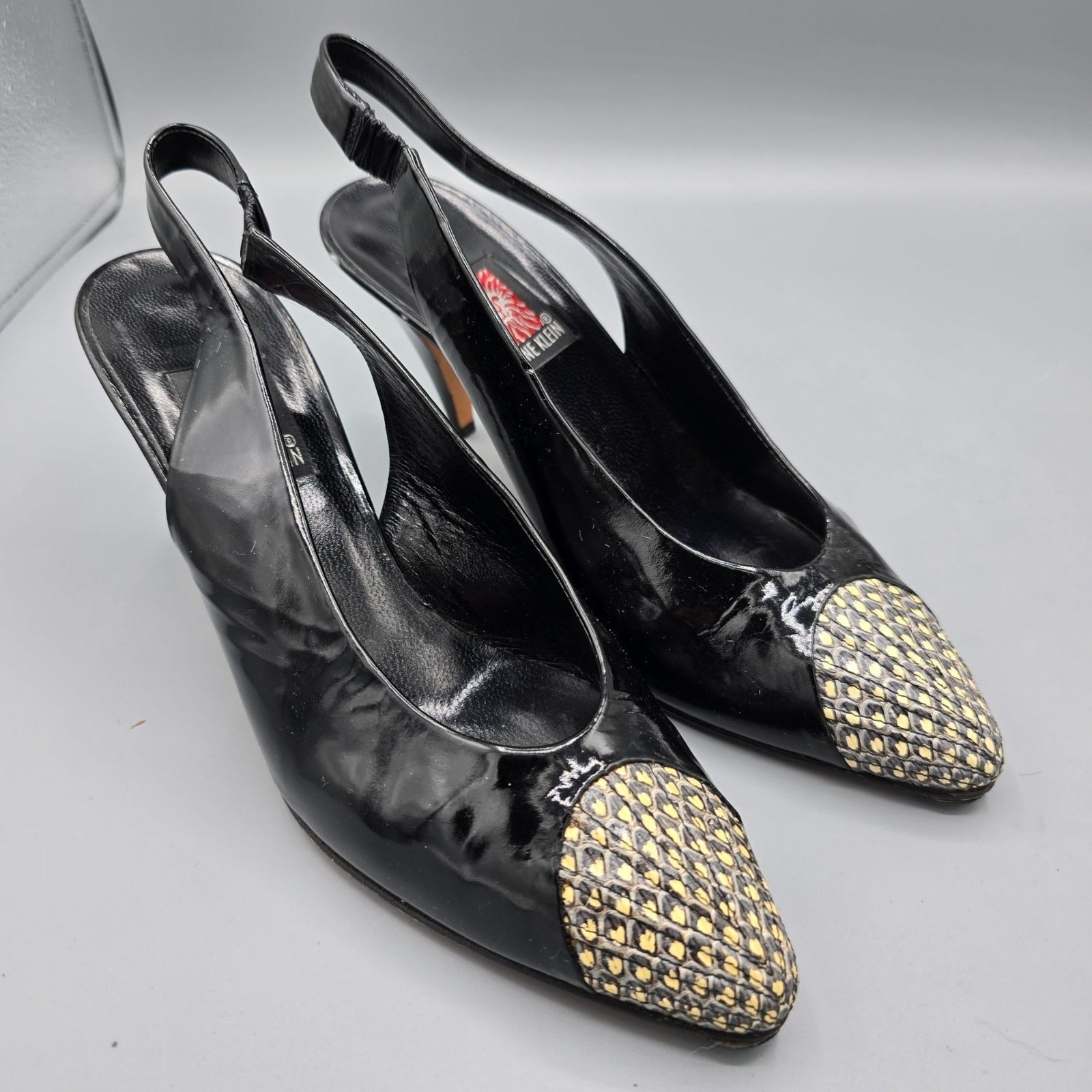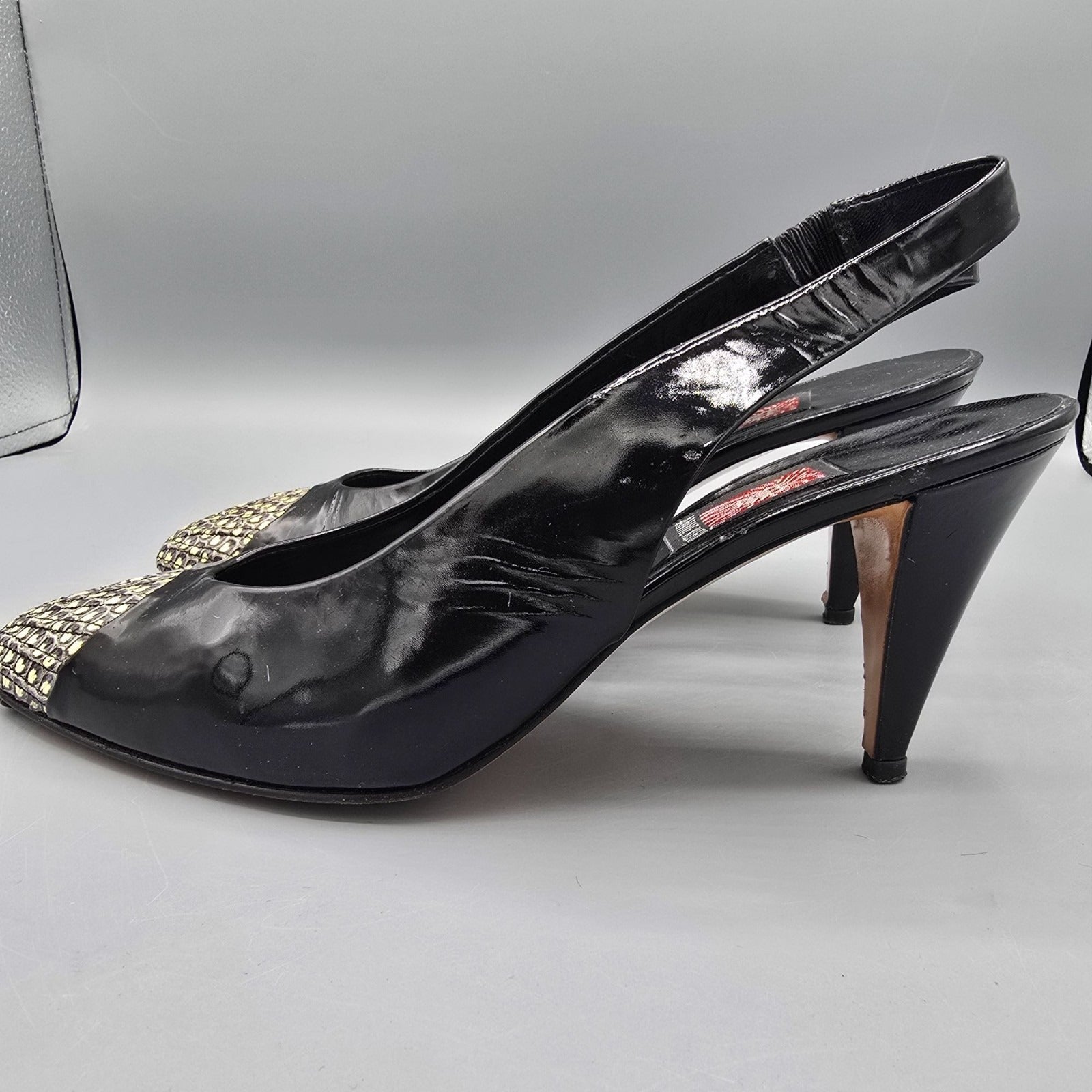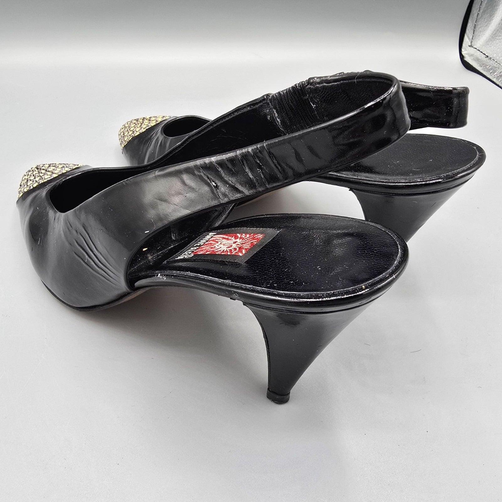Vintage 1980s Anne Klein Made in Italy Black Patent Cap-Toe Slingback Heels (7M)