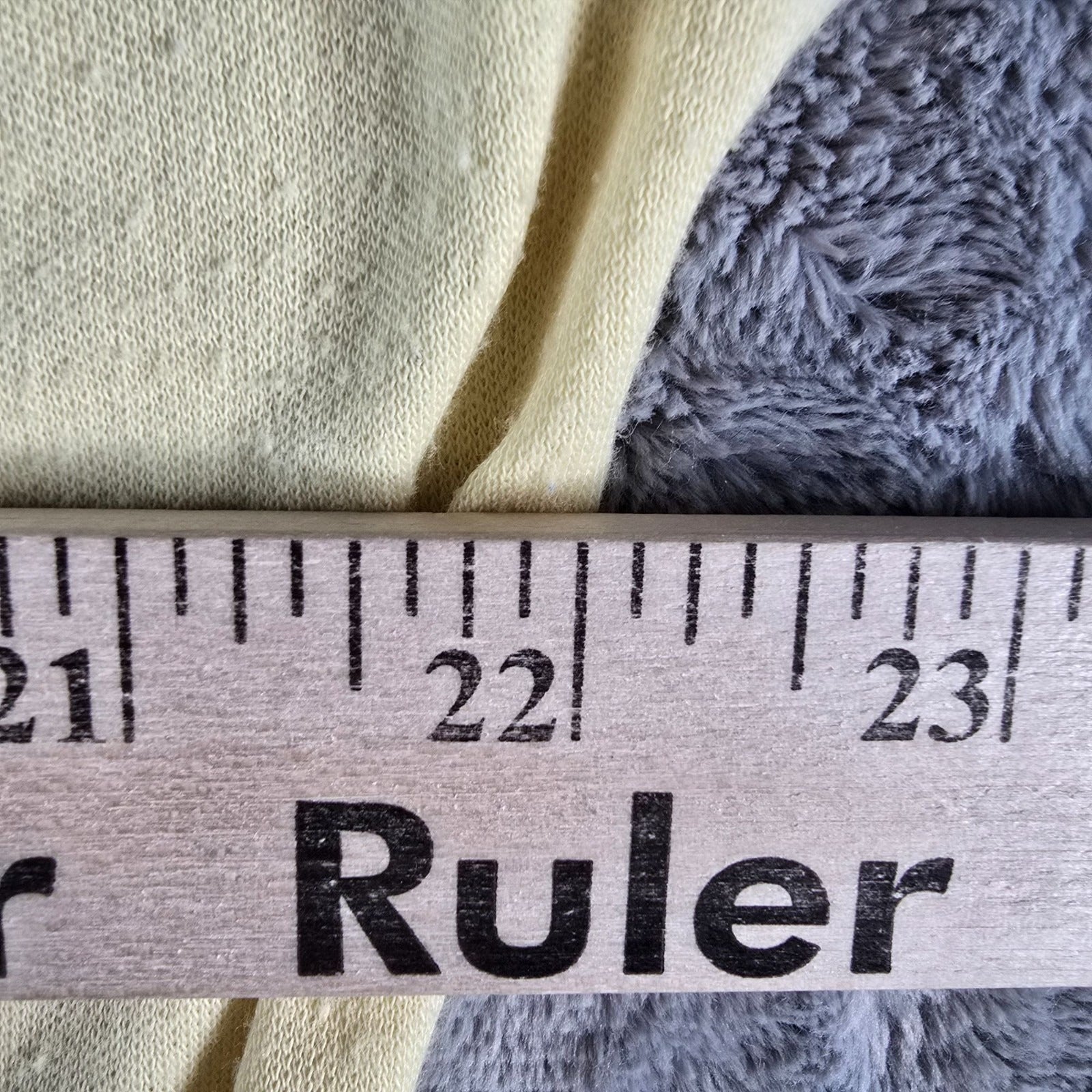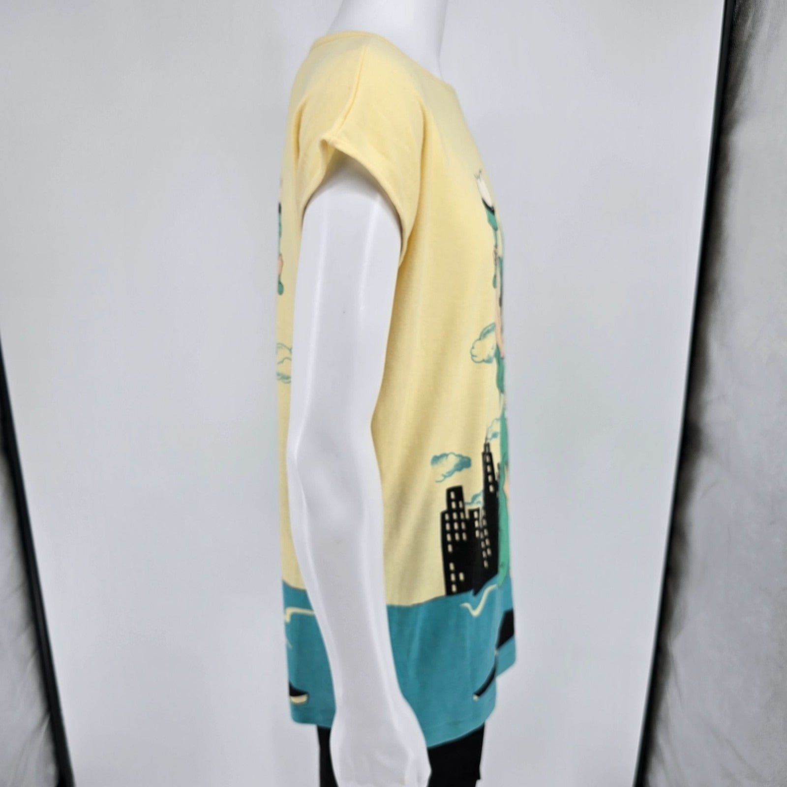 Color: Pastel yellow body with teal/black multicolor screen-print
