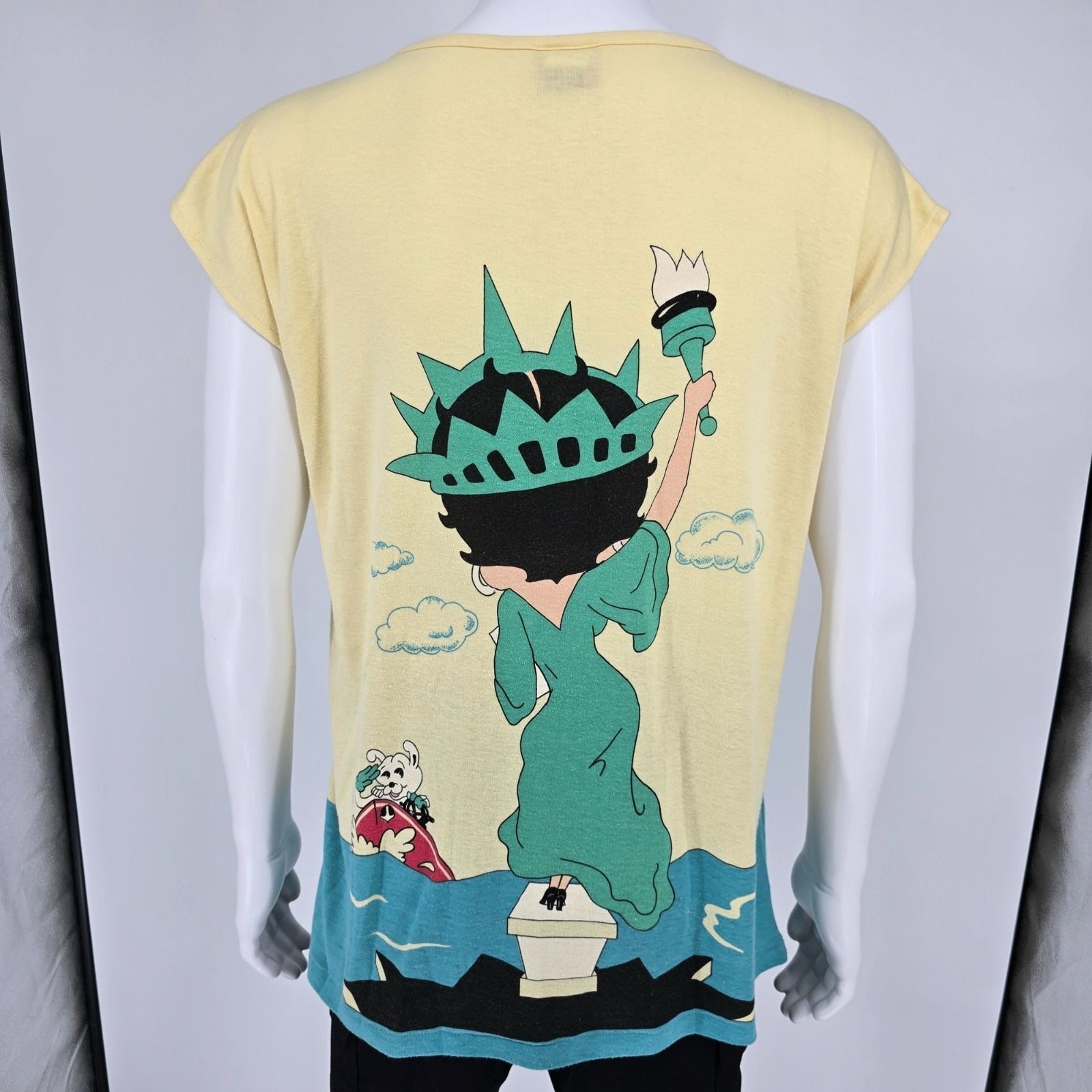 Notable Features: Officially licensed Betty Boop ยฉ 1985 KFS Inc./Fleischer Studios print; full front-and-back All Over Print graphic of Betty as the Statue of Liberty with Pudgy; cap-sleeve silhouette (close to sleeveless); single-stitch hem