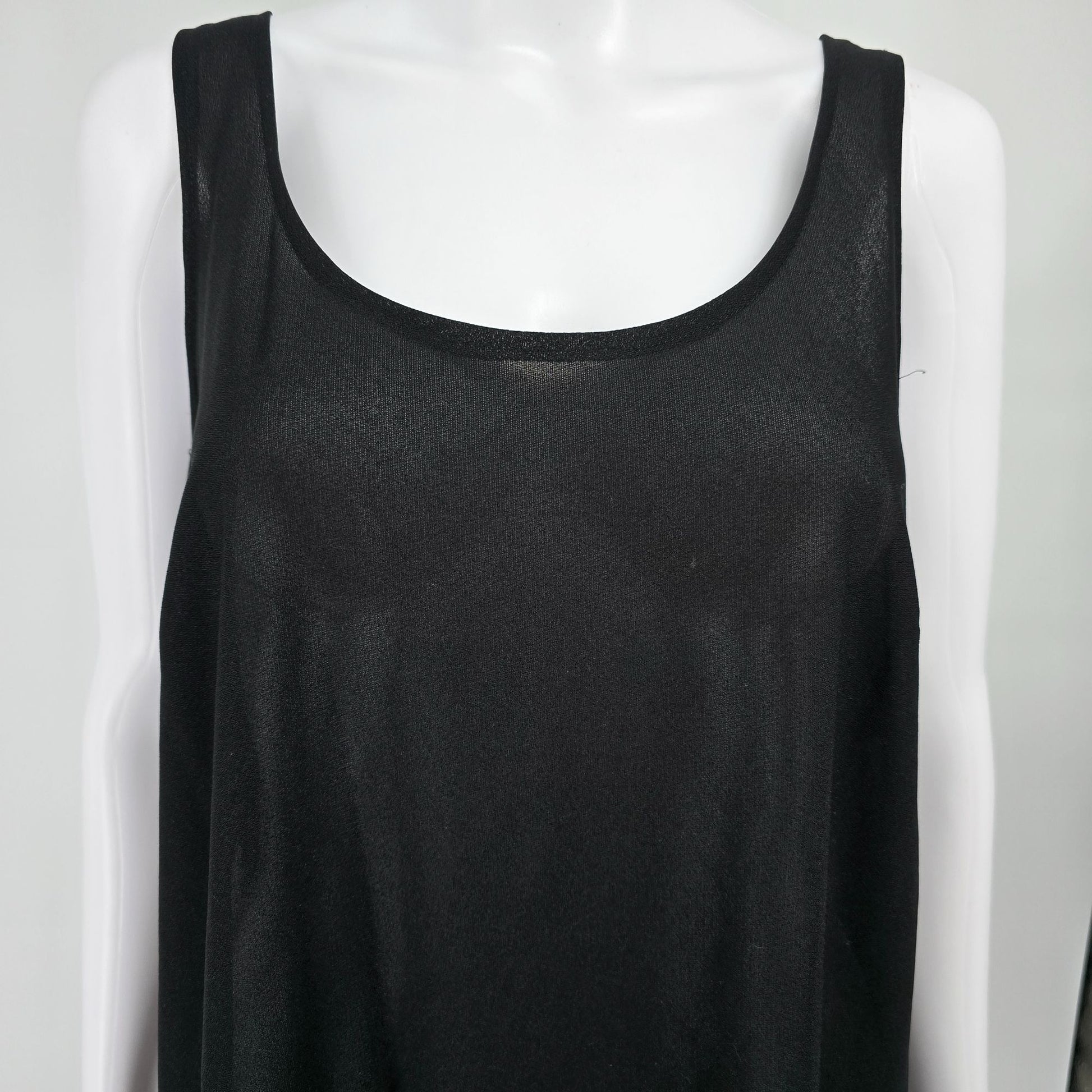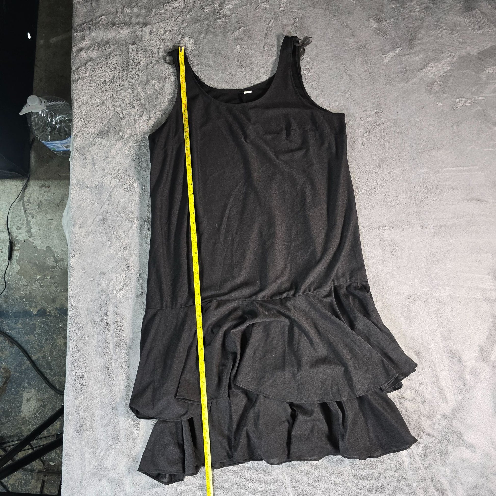 Notable Features: Sleeveless tank-style black dress with a scoop neckline and relaxed shift silhouette that drops into a flouncy, double-layered ruffle hem. Fabric has a light, semi-sheer drape. Easy pull-on style with no closures, perfect for cocktail, party, or flapper-inspired looks.