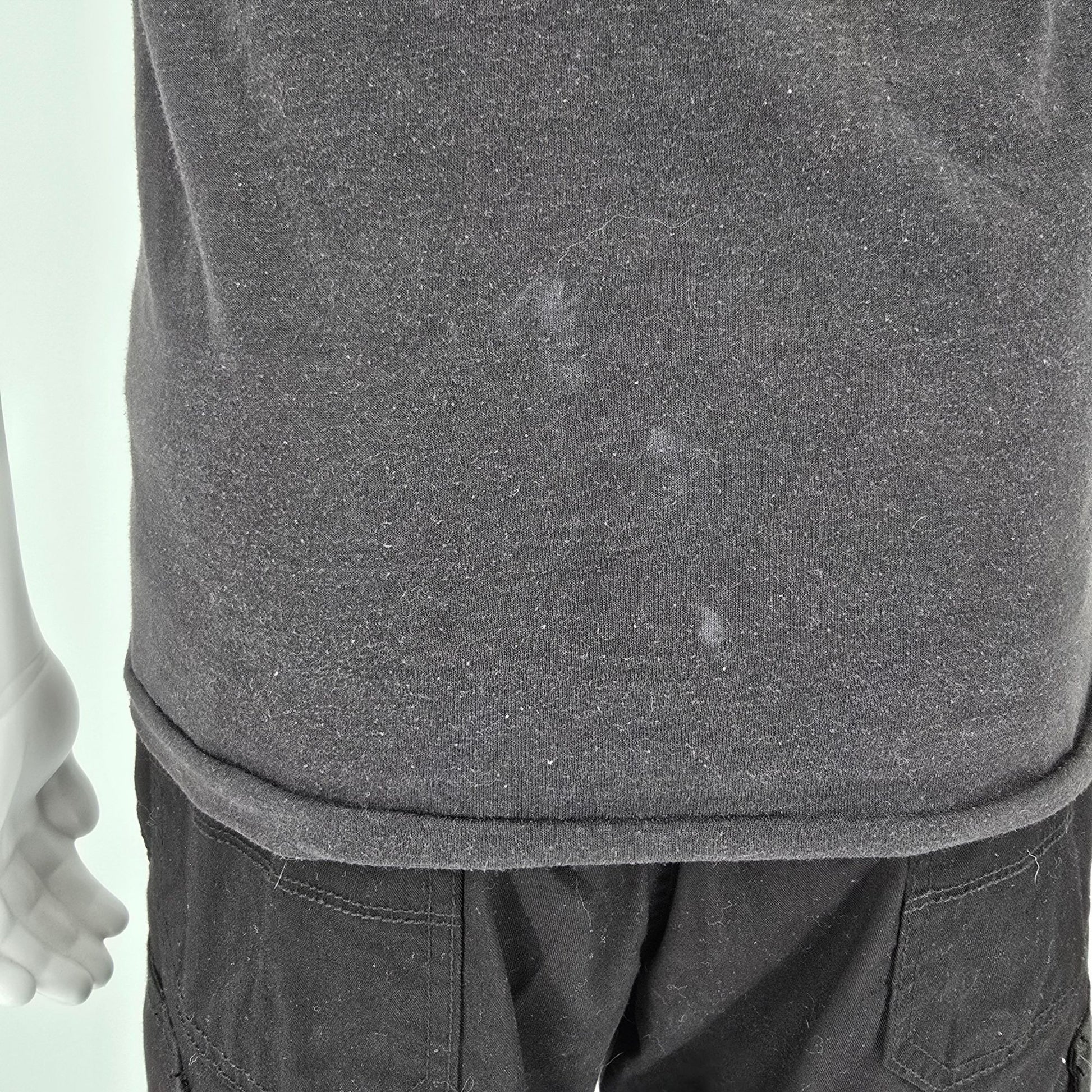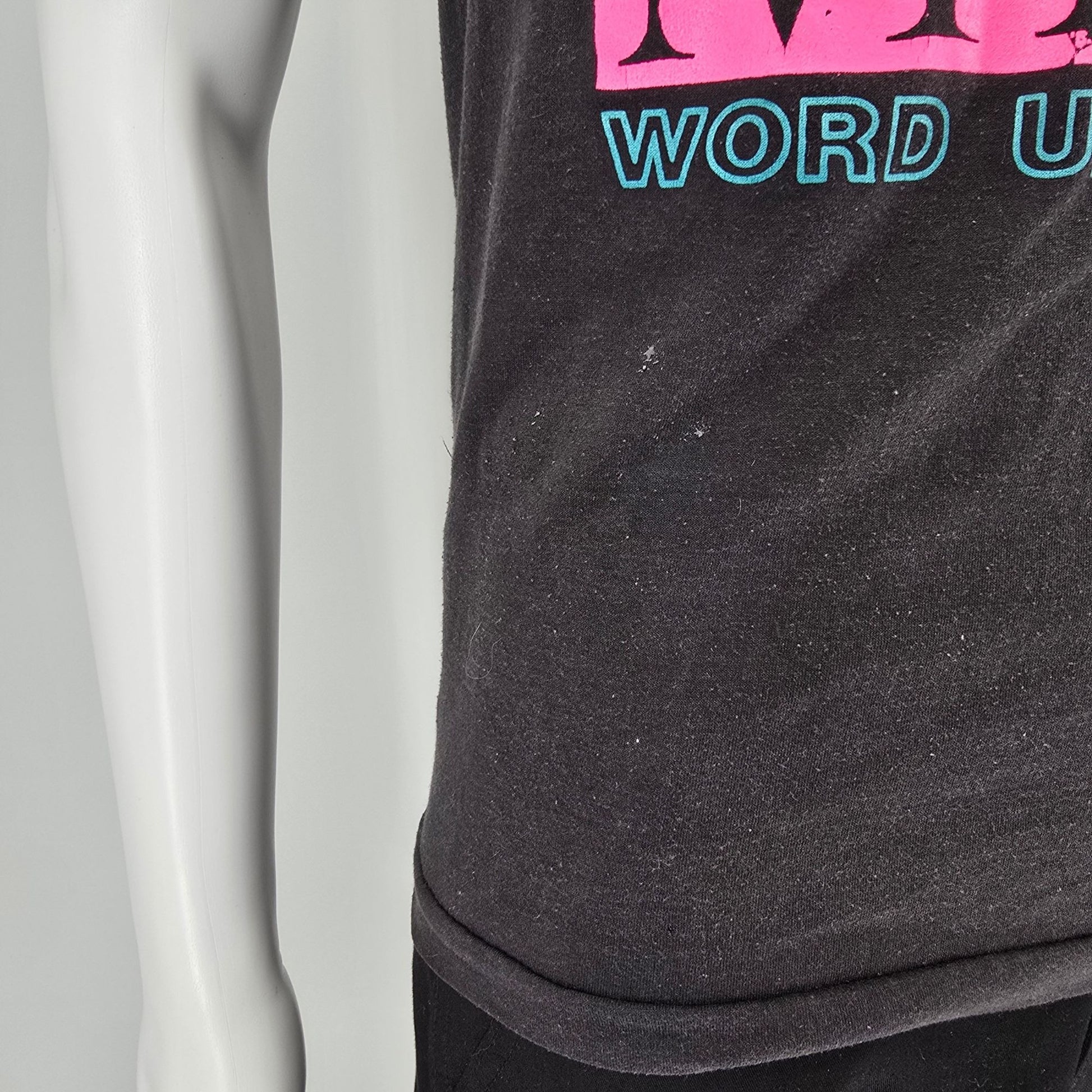 Fair to good used vintage condition. Visible wear/distressing at graphics. Small area of staining/residue on the right side of the front beneath the graphic. Large area of light discoloration at center of back near bottom hem. Moderate to heavy fabric wear and fading throughout. See photos for details.