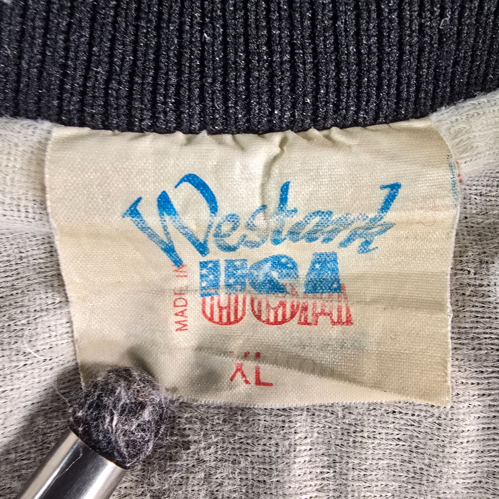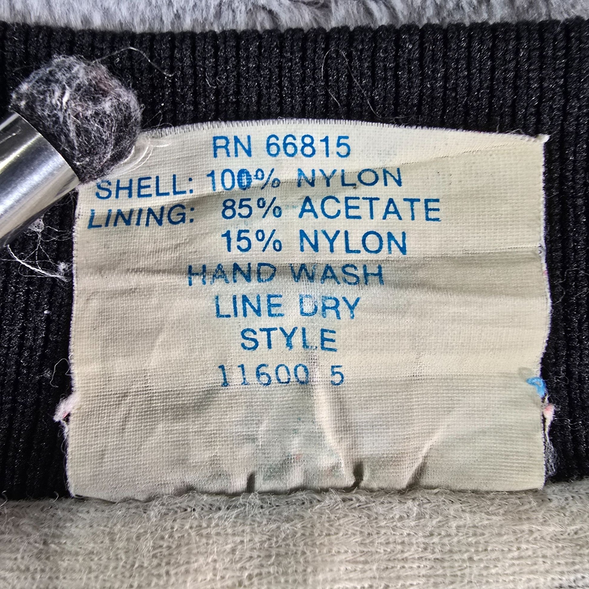 Good overall used vintage condition. Large scrape at the right side of the back embroidery. A few loose threads in back embroidery. Heavy wear and discoloration to inner lining. Moderate wear to nylon outer shell. See photos for details.