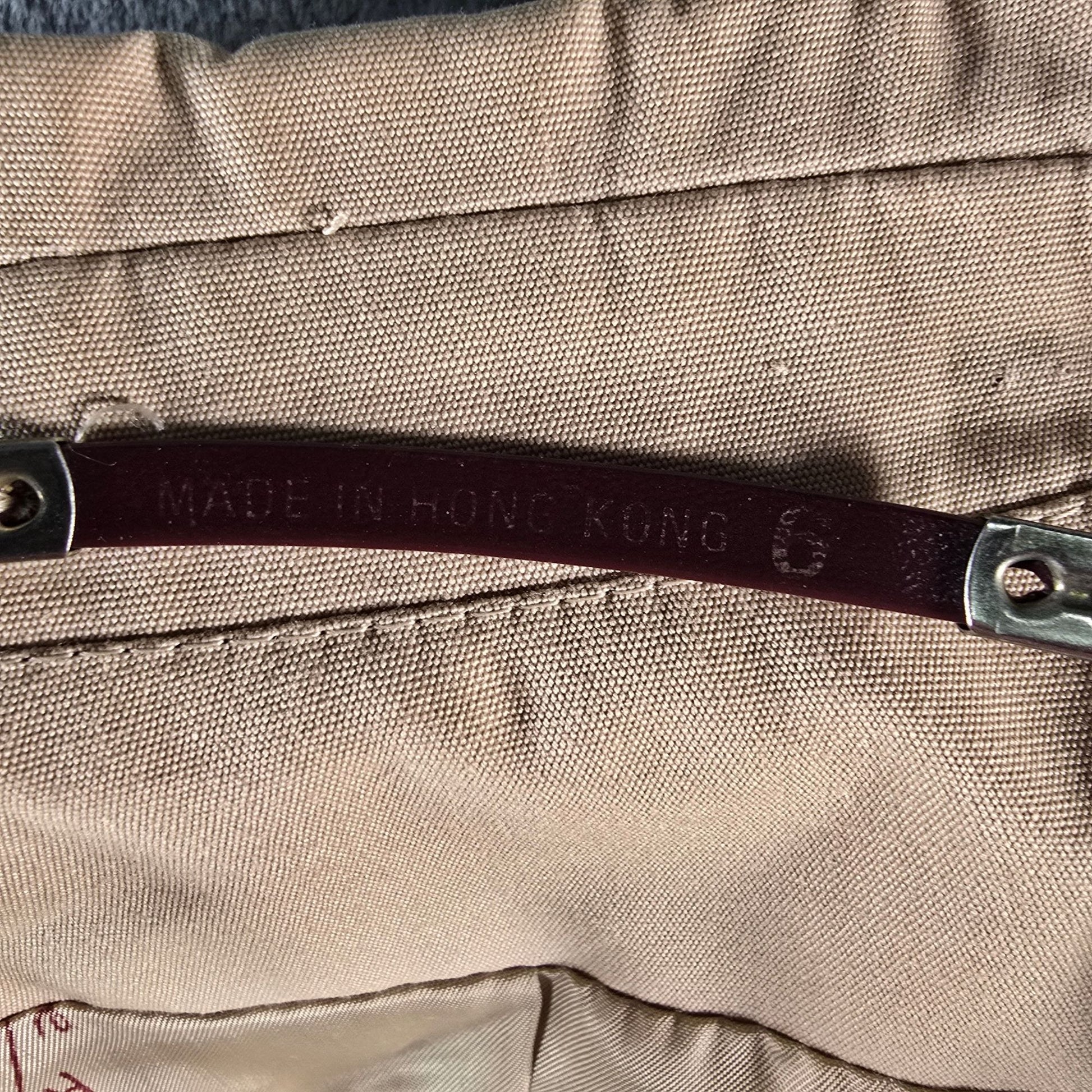 Good overall used vintage condition. Loose stitching at left pit. Hanger hook partially detached at inside of collar. Small stain on left sleeve. Light to moderate fabric wear throughout. See photos for details.