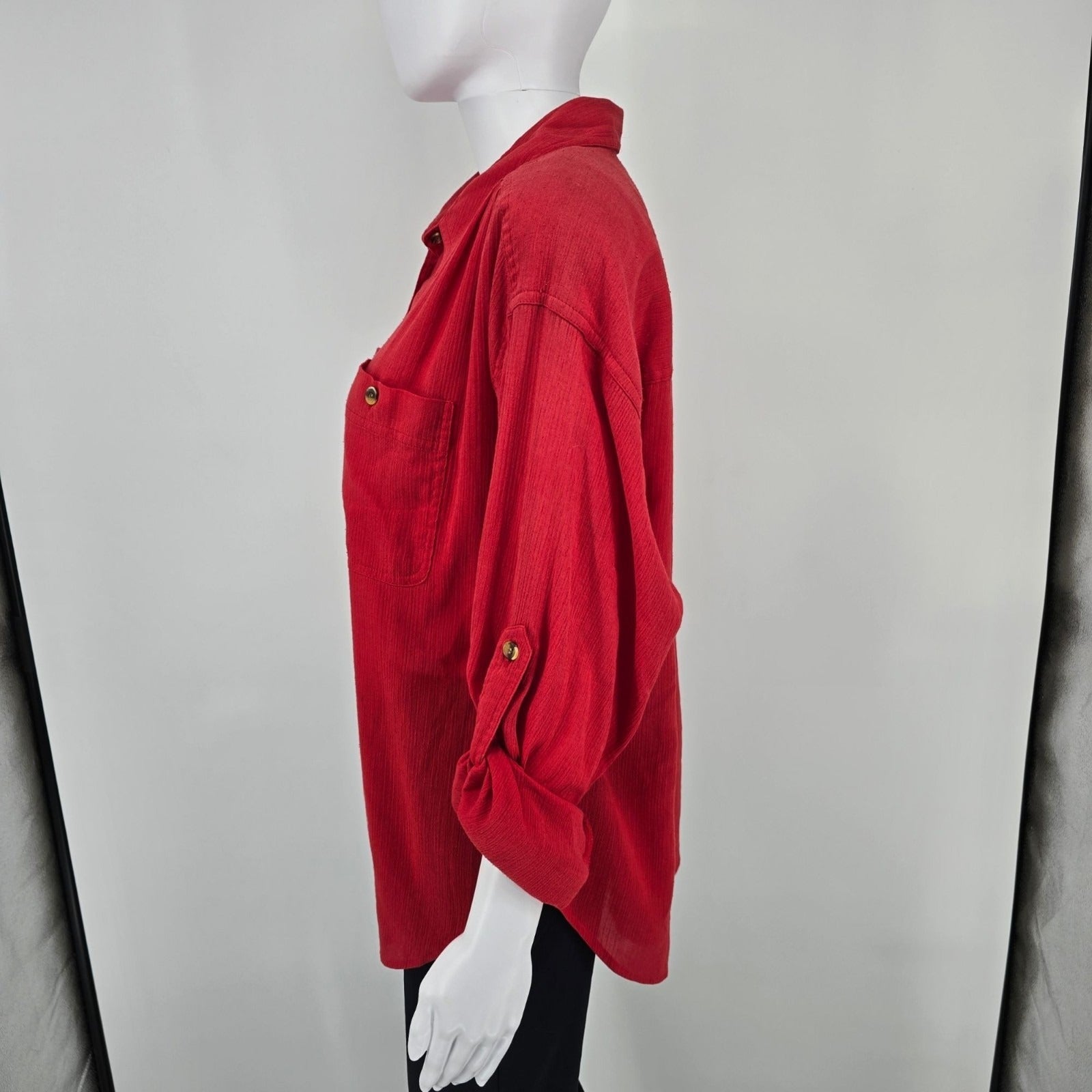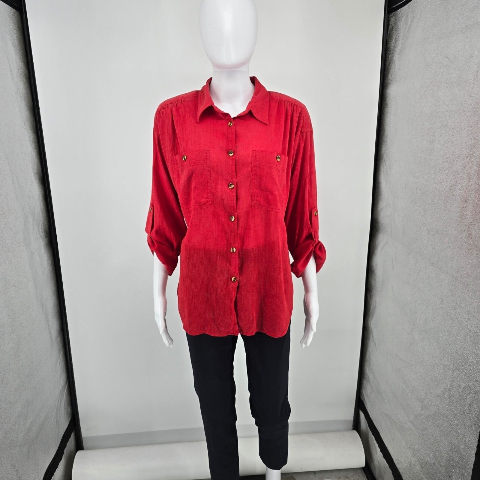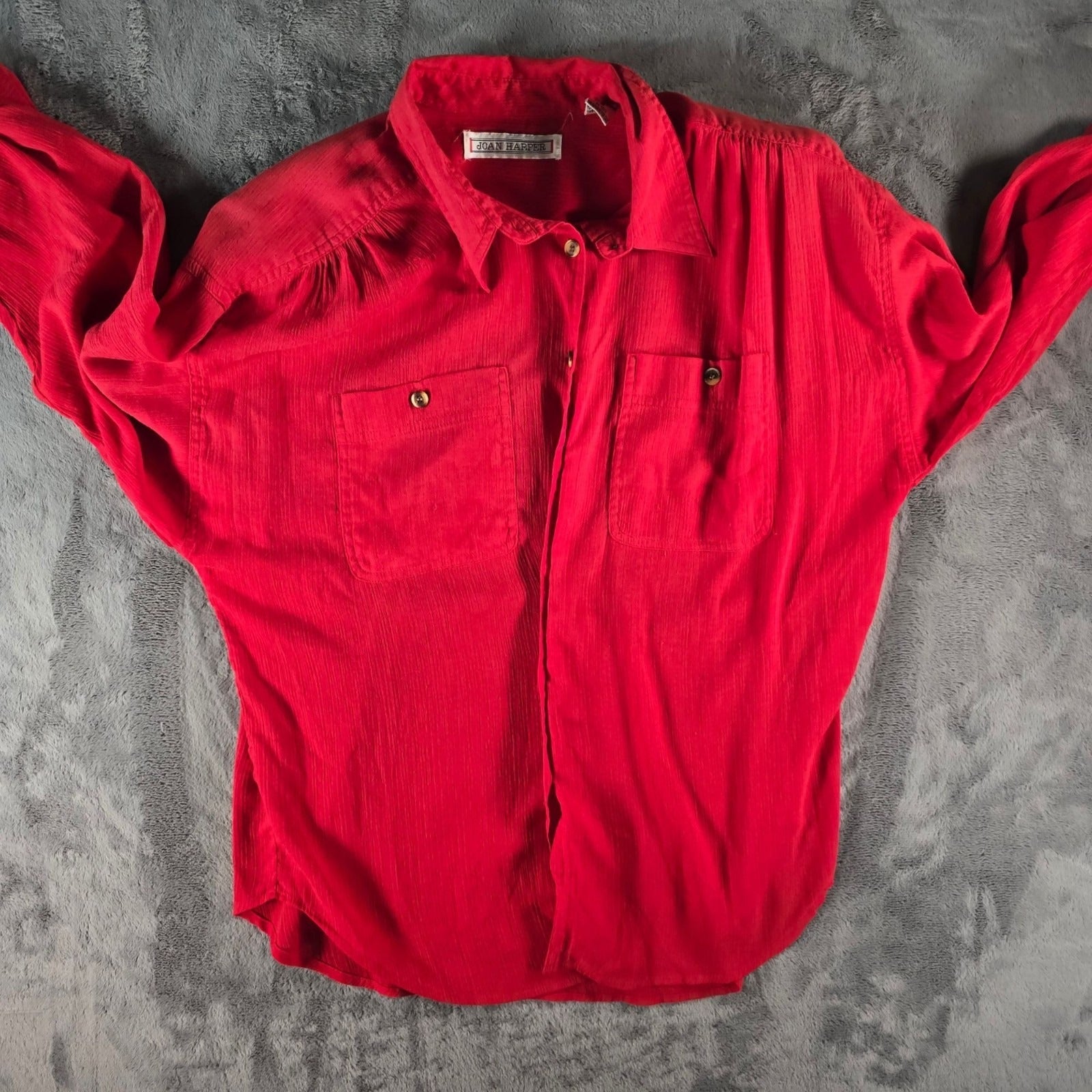 Vintage 1980s Joan Harper Red Collared Button Front Shoulder Padded Blouse (XL)