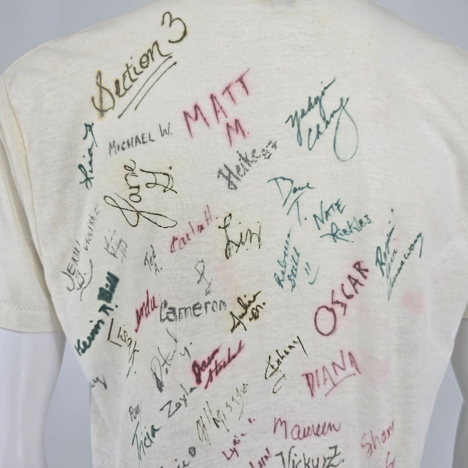 Multicolor handwritten signatures across the majority of the back of the t-shirt.
