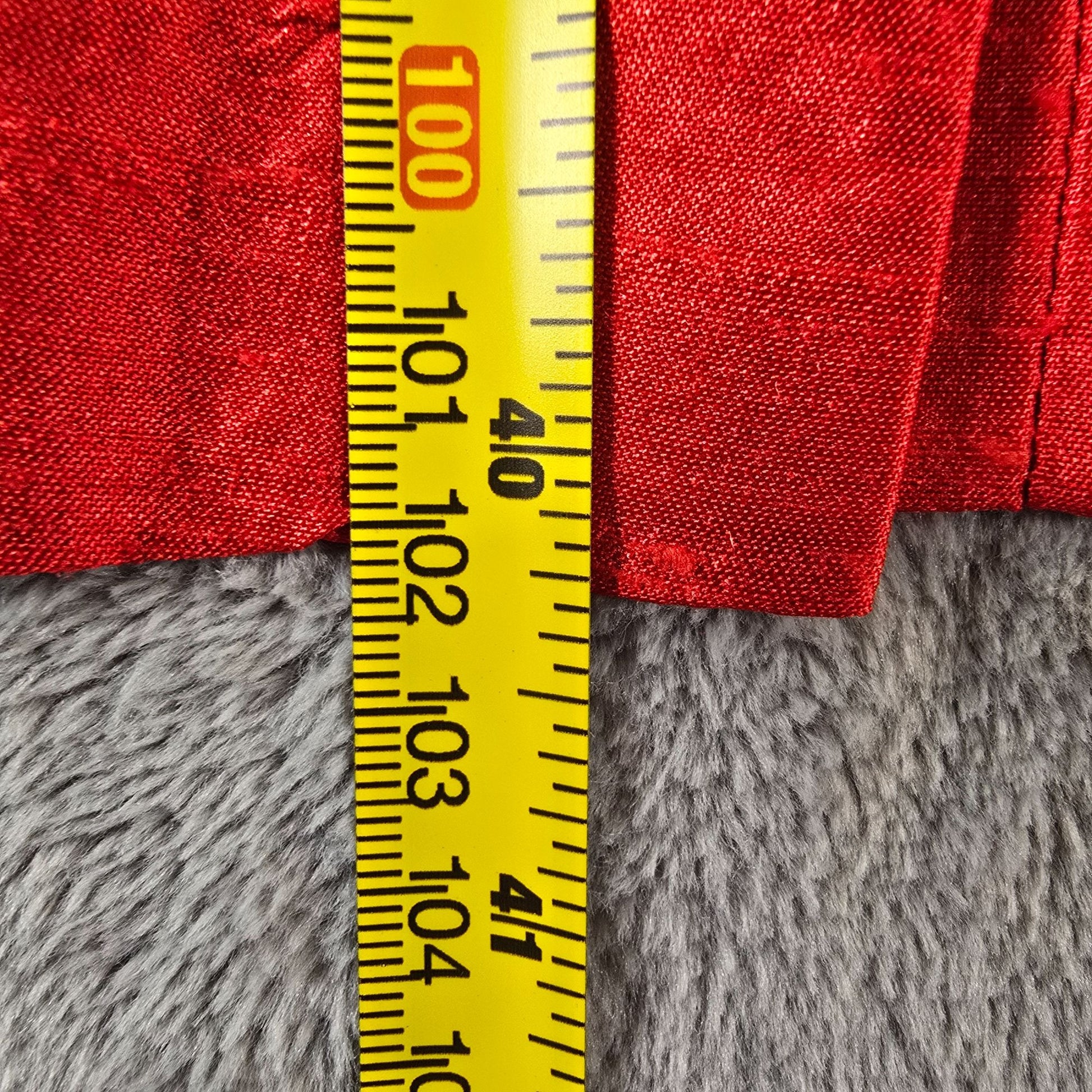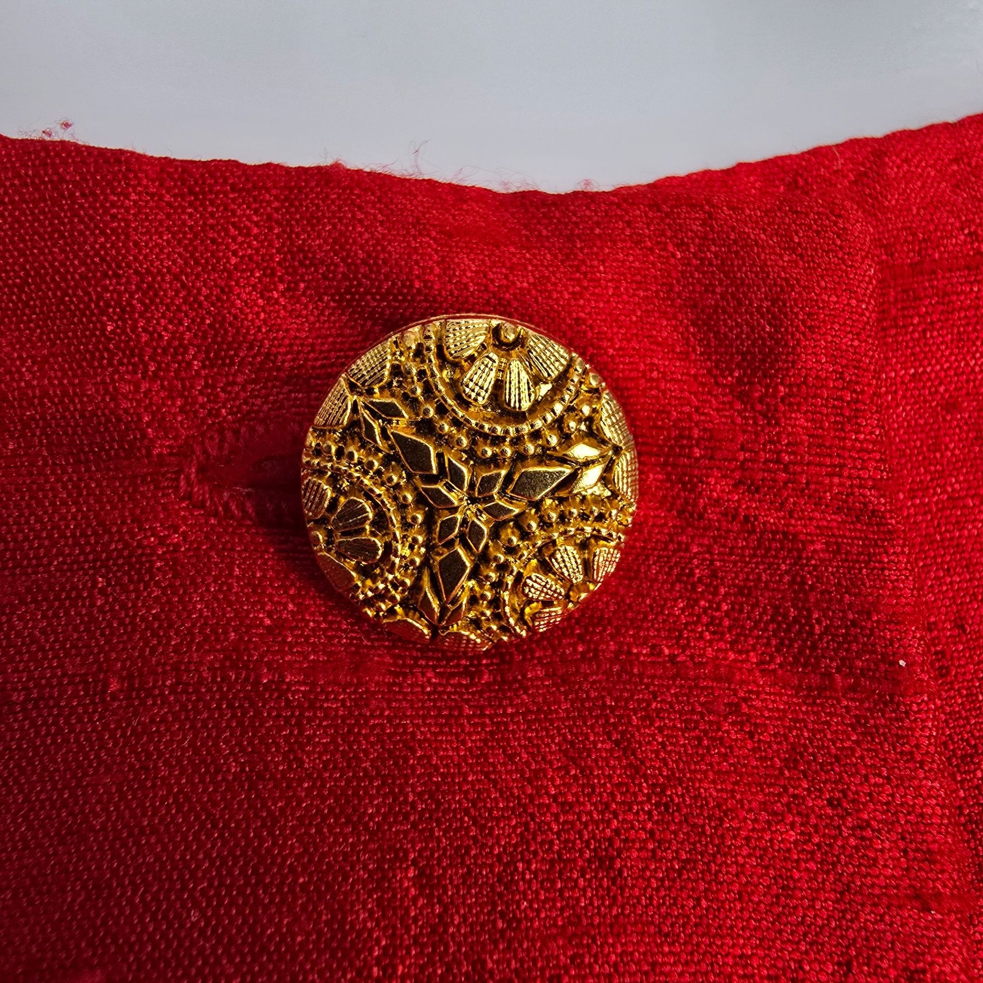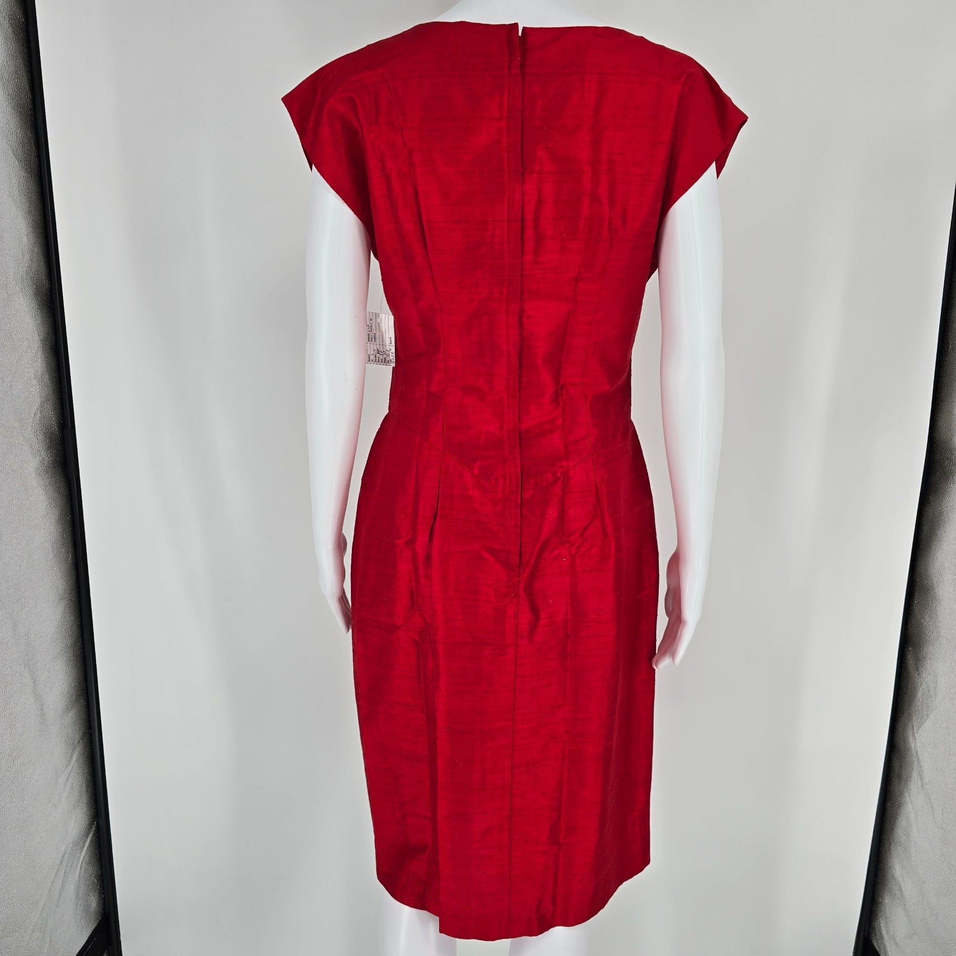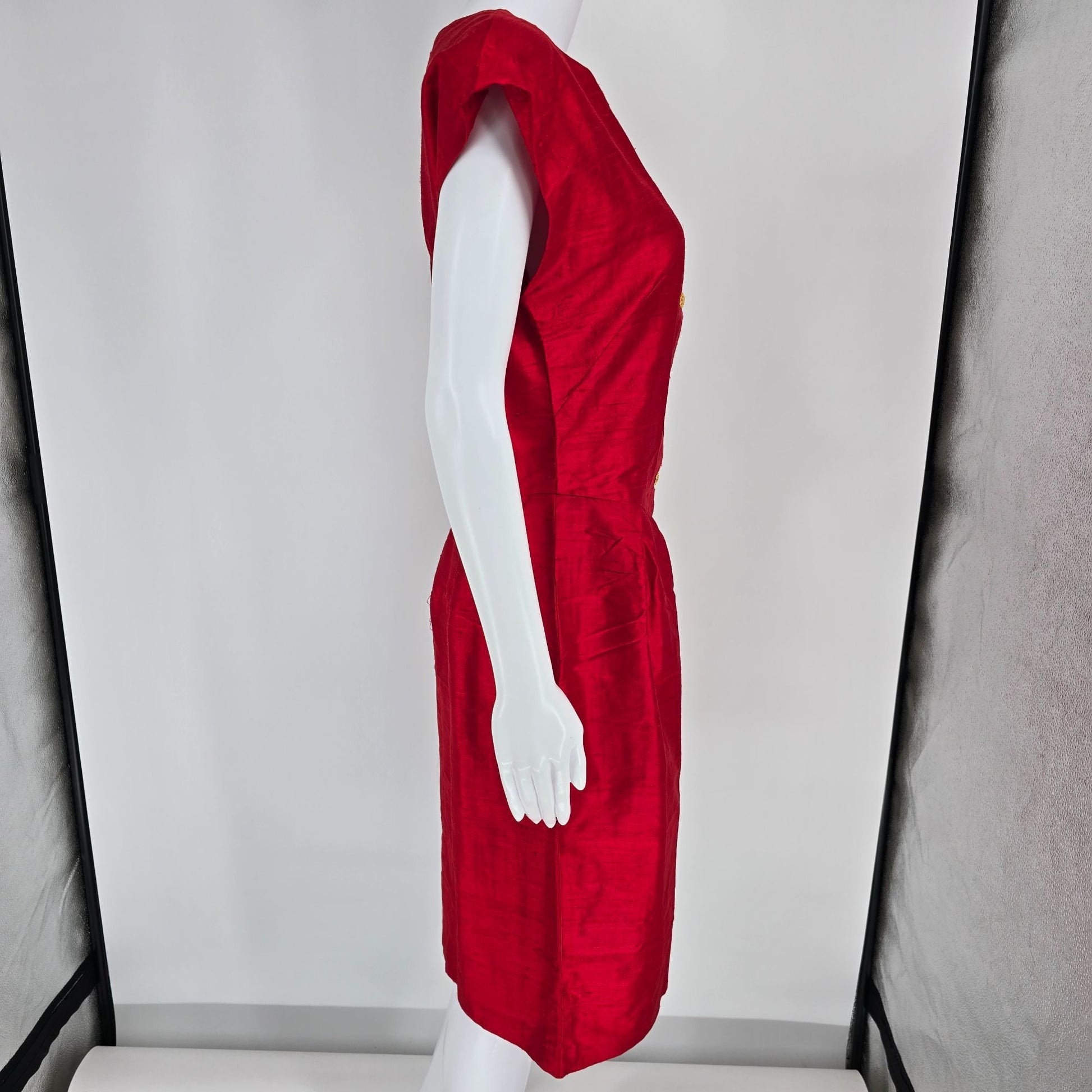 Notable Features: Striking red sheath dress in a shantung-style fabric with subtle slubs and sheen. Features a bateau neckline, cap sleeves, and a fitted waist with angled seaming for a flattering hourglass shape. Front bodice has functional embossed gold-tone buttons. Back nylon Beulon zipper closure.