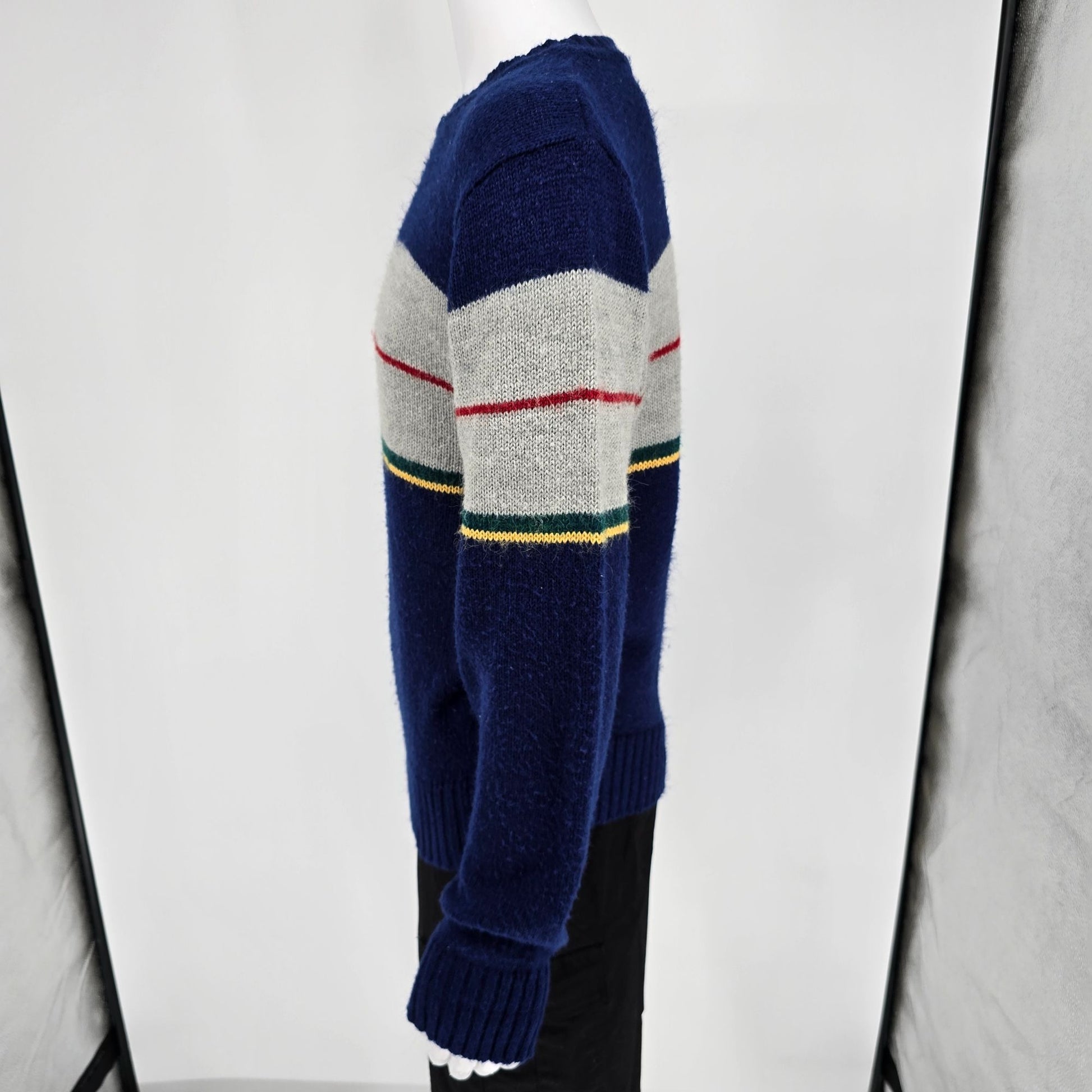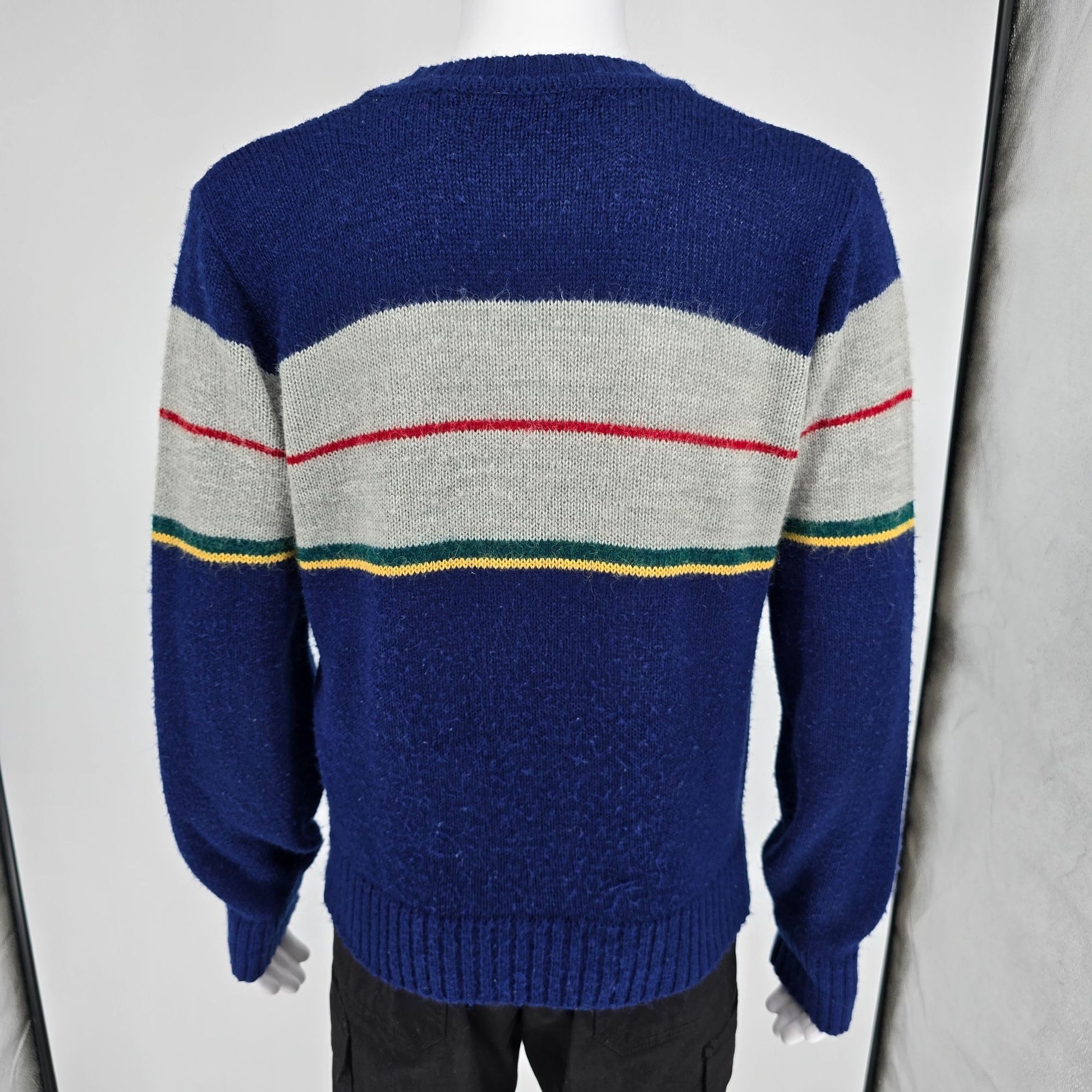 Notable Features: Classic crewneck with ribbed cuffs/hem; intarsia stripe panel front and back; soft, fuzzy acrylic hand typical of the era; easy-care machine wash/tumble dry.
