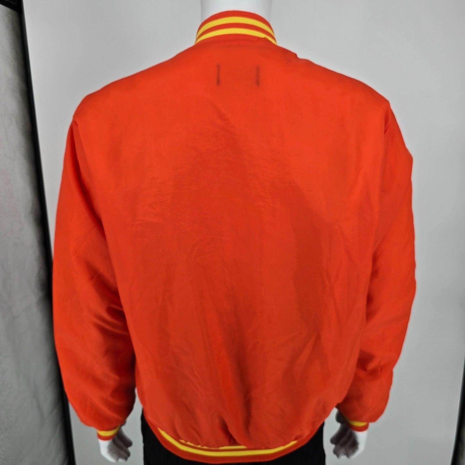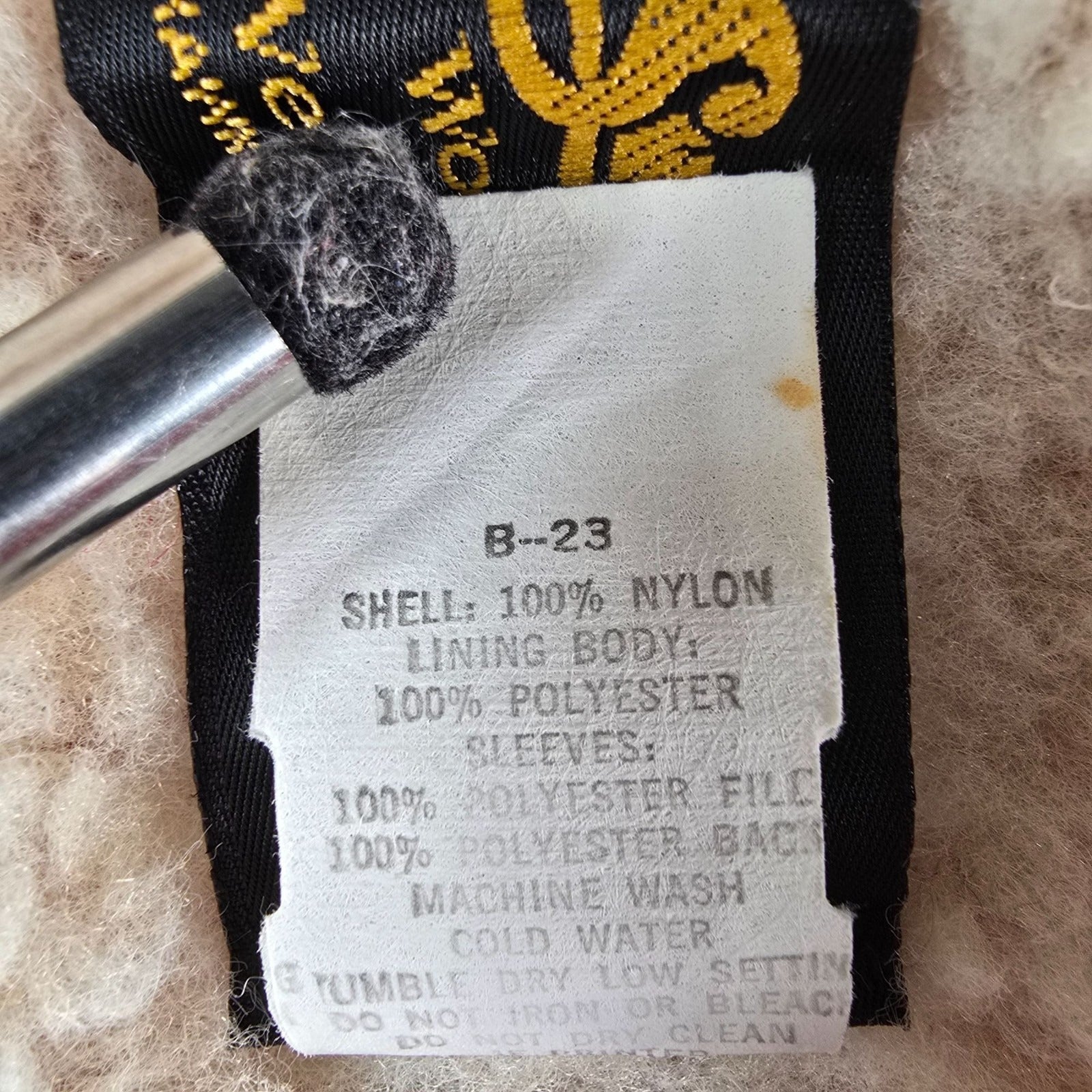 Good overall used vintage condition. Some frayed threads on back of jacket where knit collar meets body. A few small spots of discoloration on collar and cuffs. Moderate fabric wear, creasing, and scuffing throughout. See photos for details.