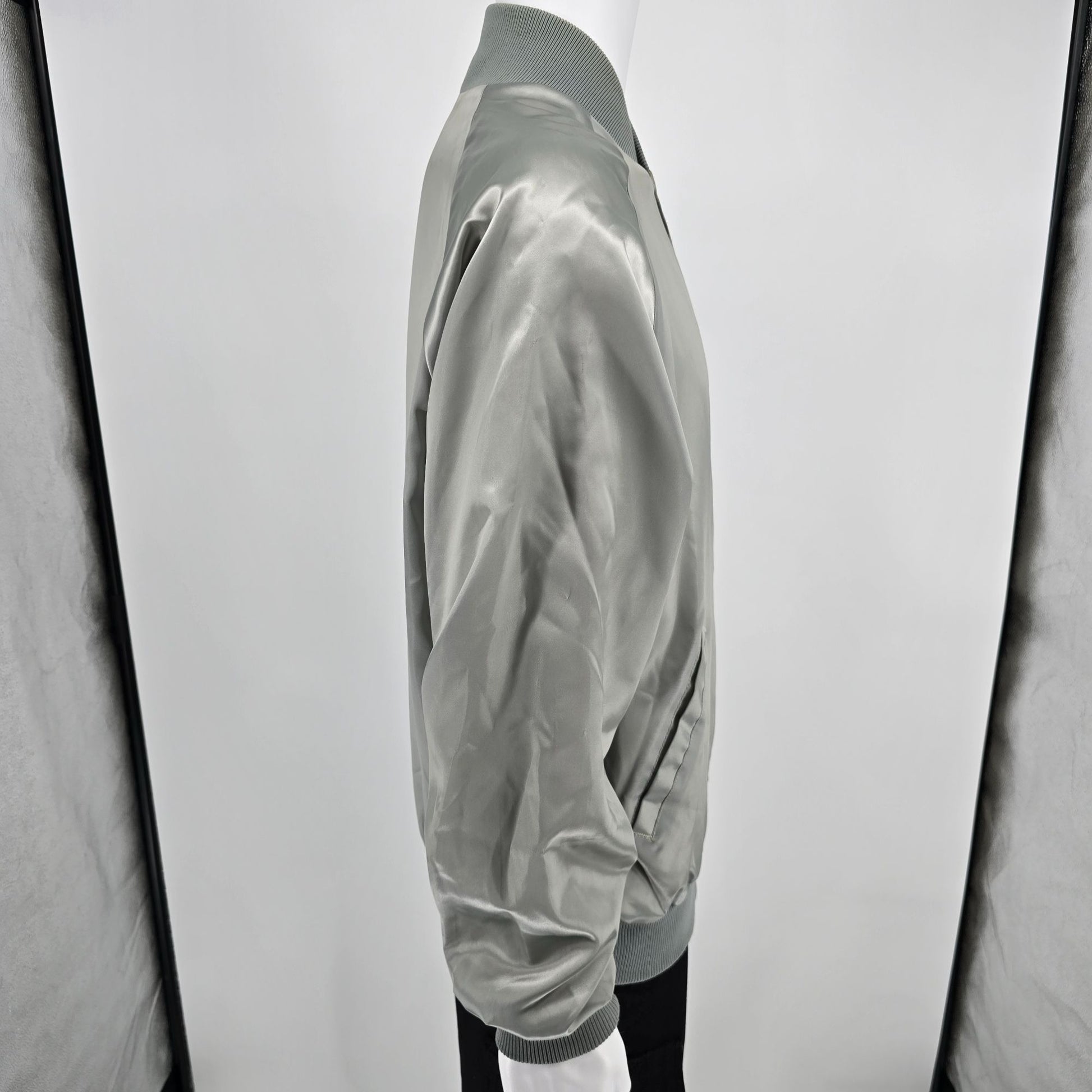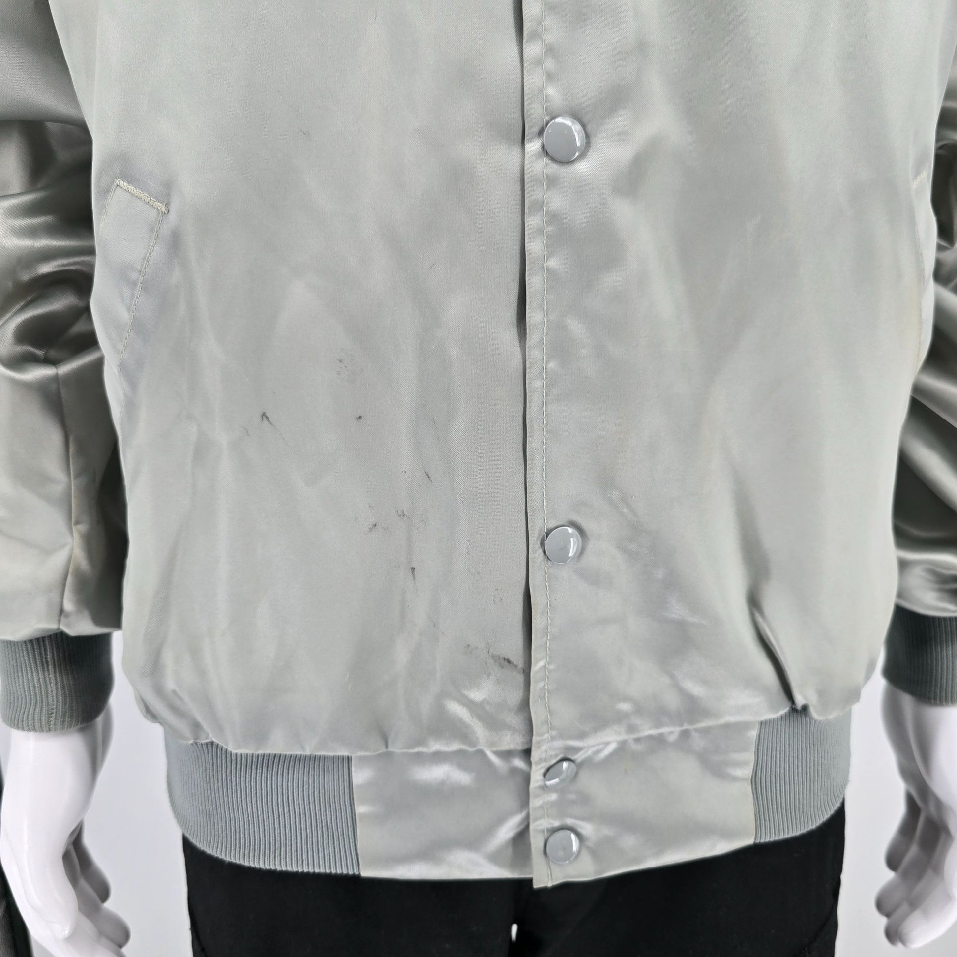 Notable Features: Satin-finish snap-front bomber/coach jacket; Raglan sleeves; Knit collar/cuffs/hem; Pockets