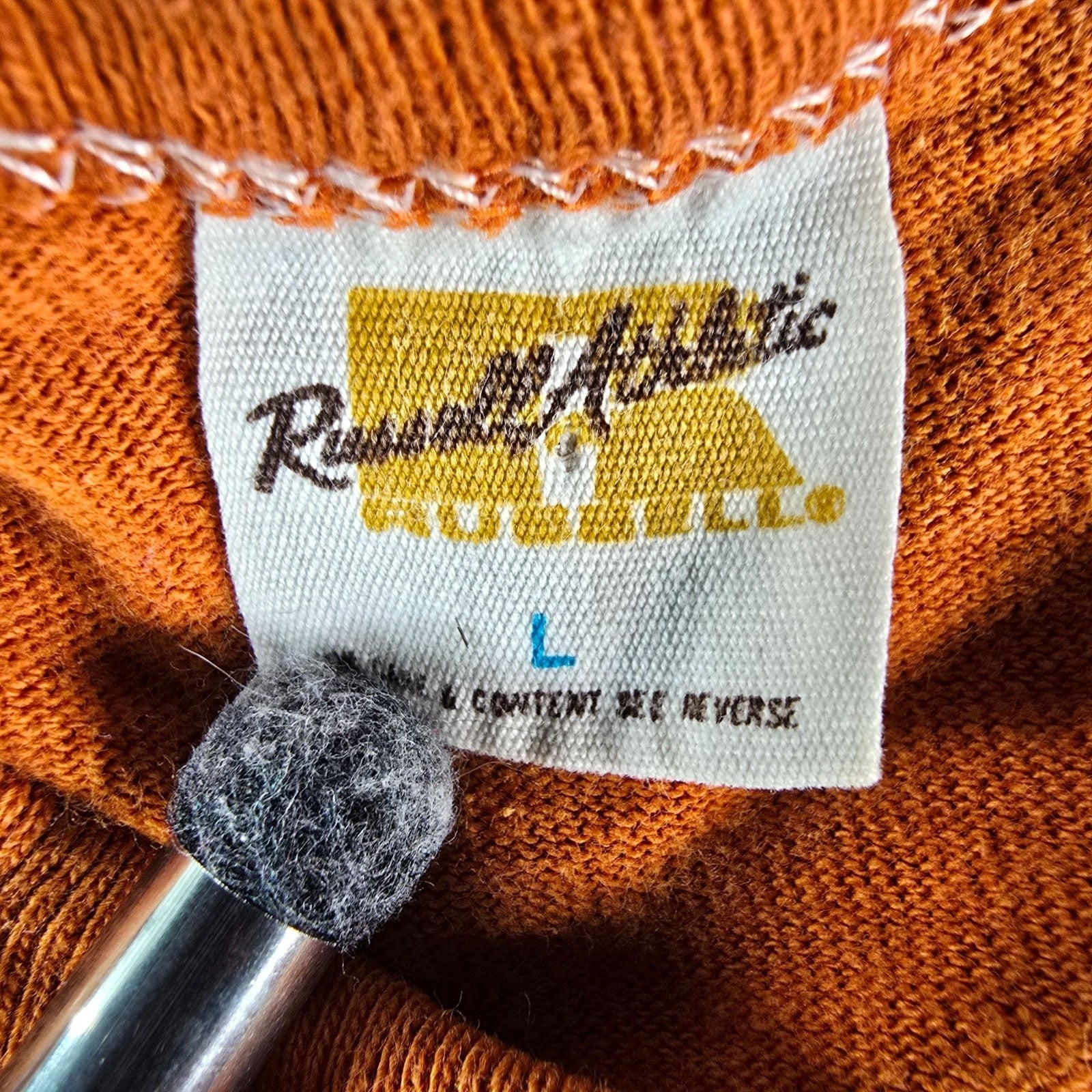 Notable Features: Single-stitch sleeves & hem, large front graphic;, Russell “gold box” tag;