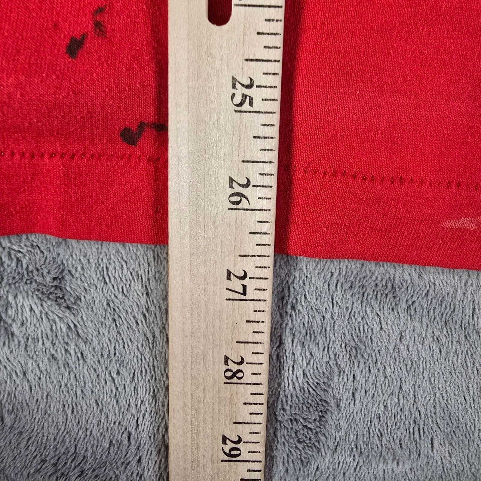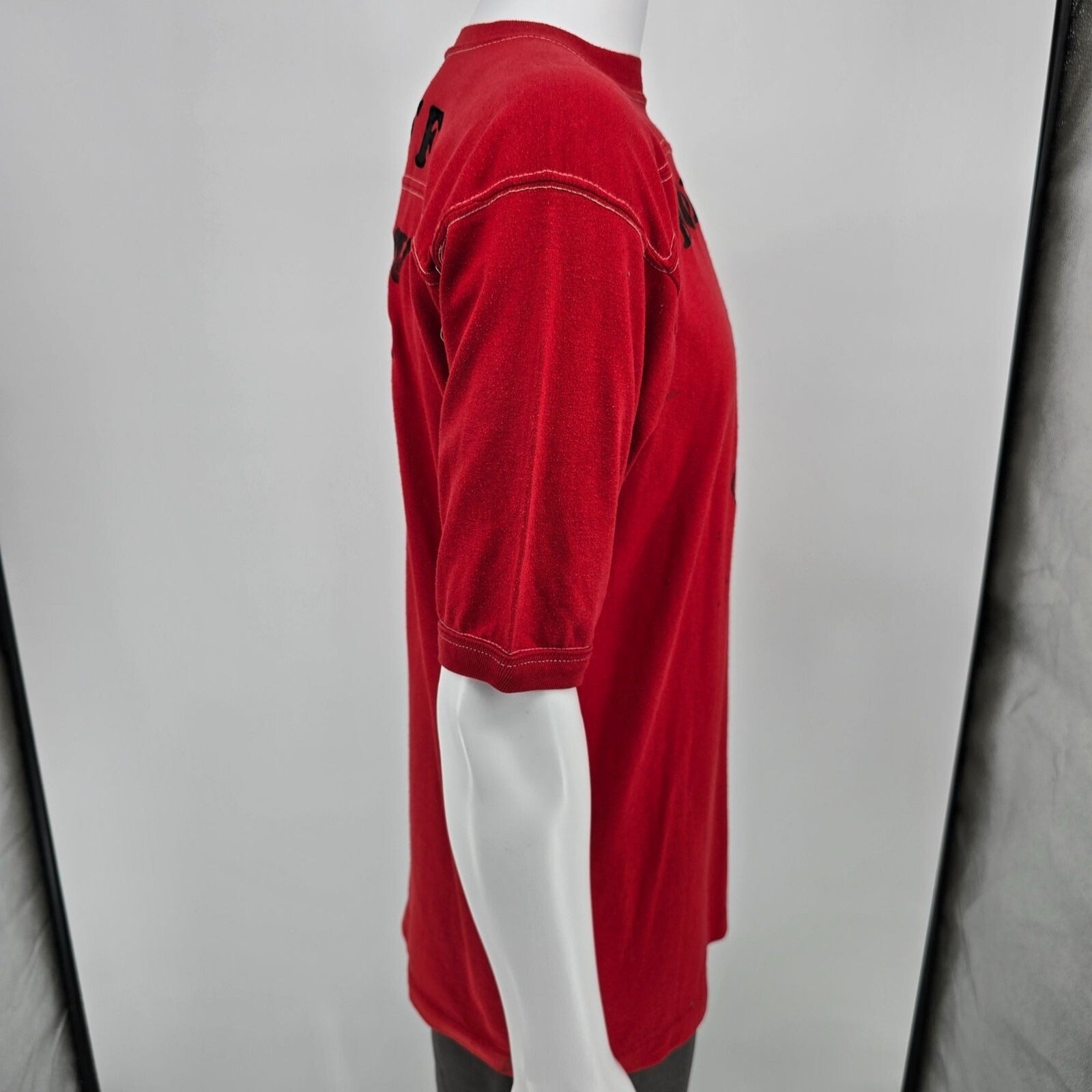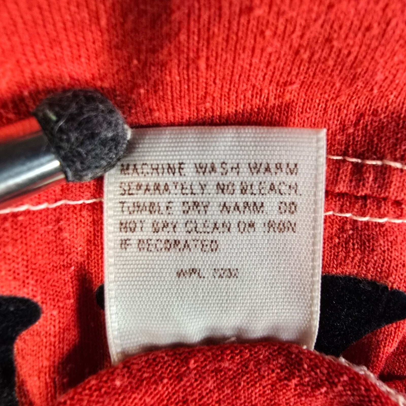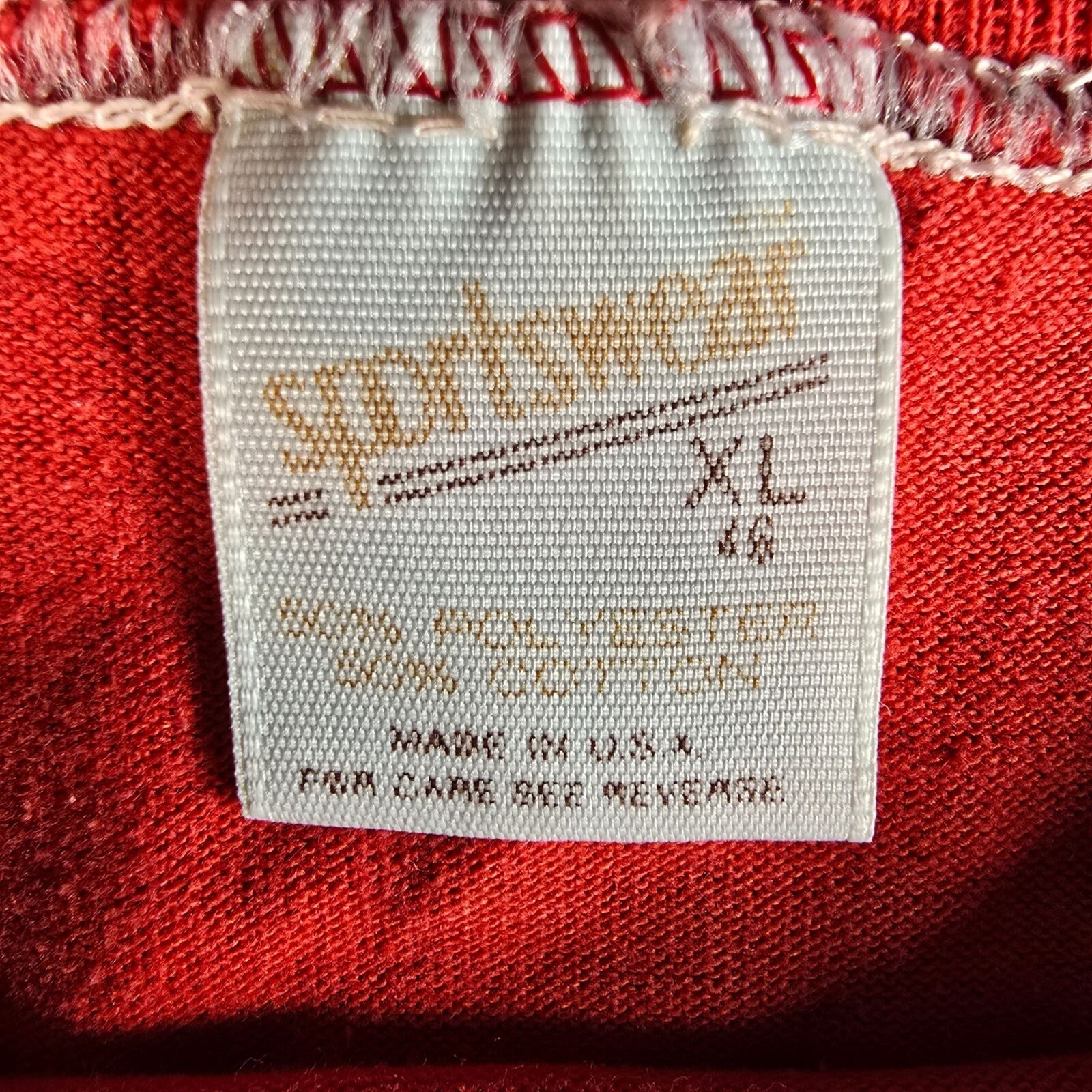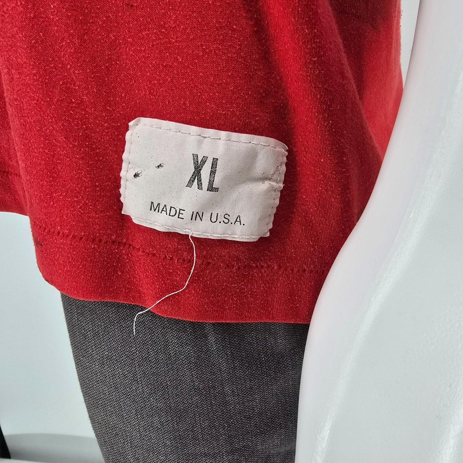 Notable Features: Single-Stitch Hem, combination of printed text and appliqued letters. Contrast shoulder and collar stitching, Made in USA XL patch near hem