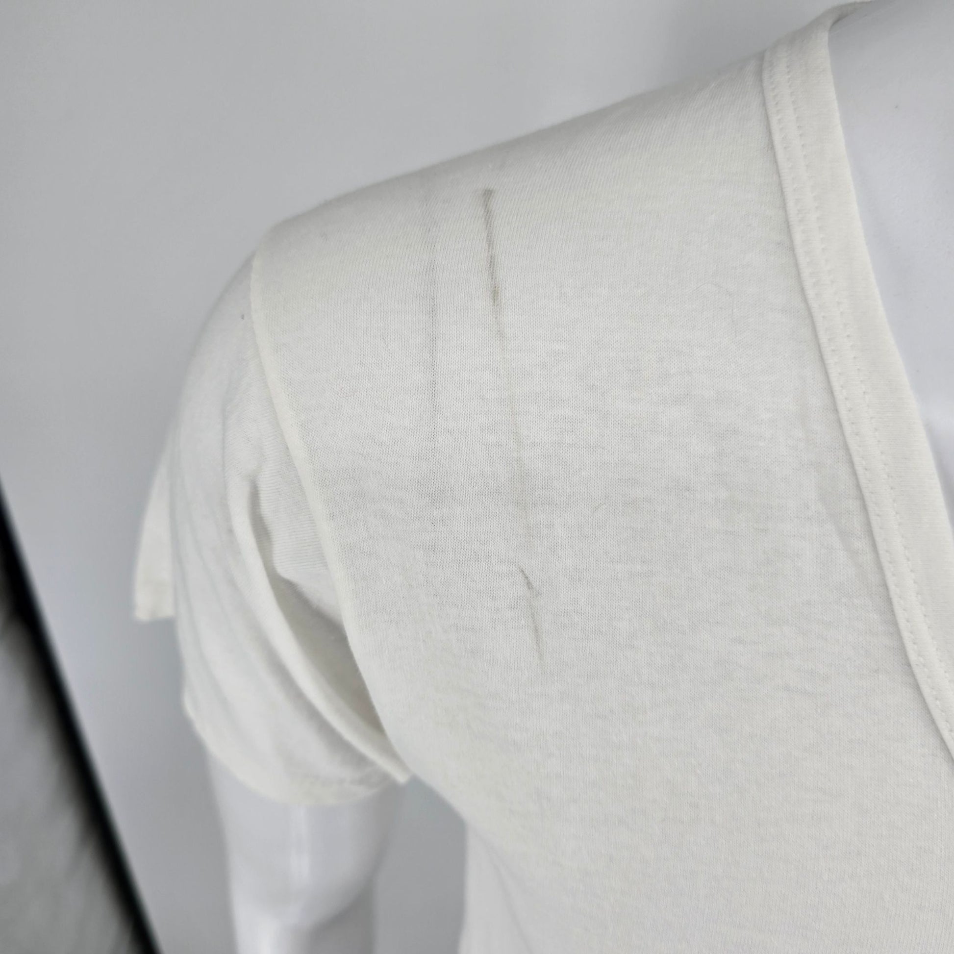 Good overall used vintage condition. Tag partially cut out. Dark line/marking running along the front of the right shoulder. Generally light fabric wear throughout. See photos for details.