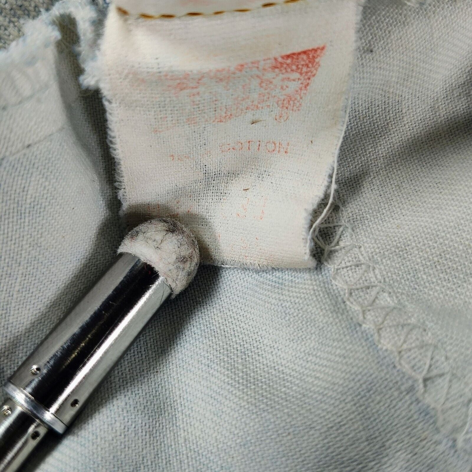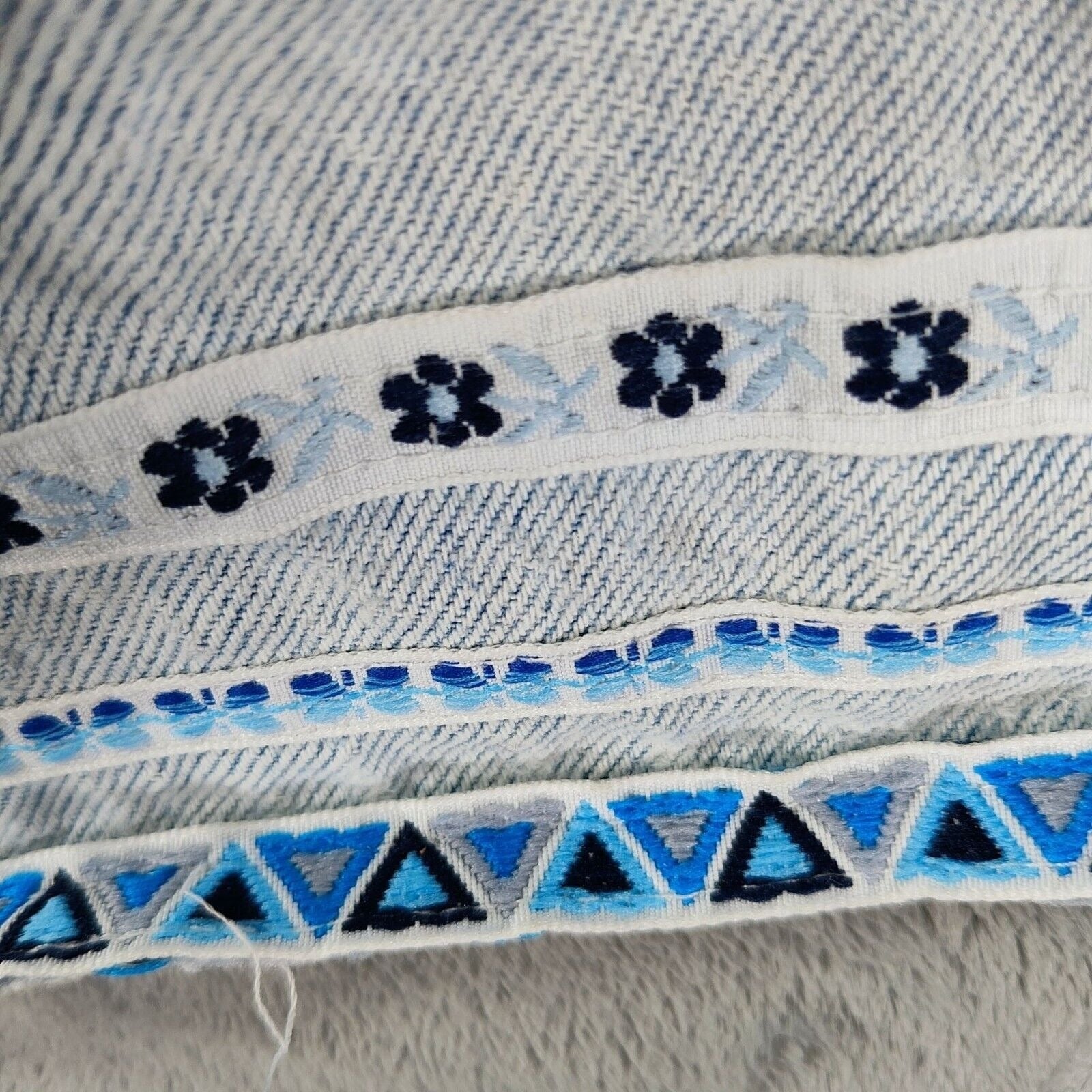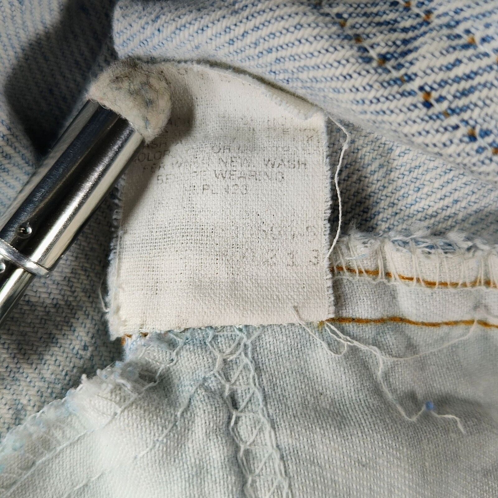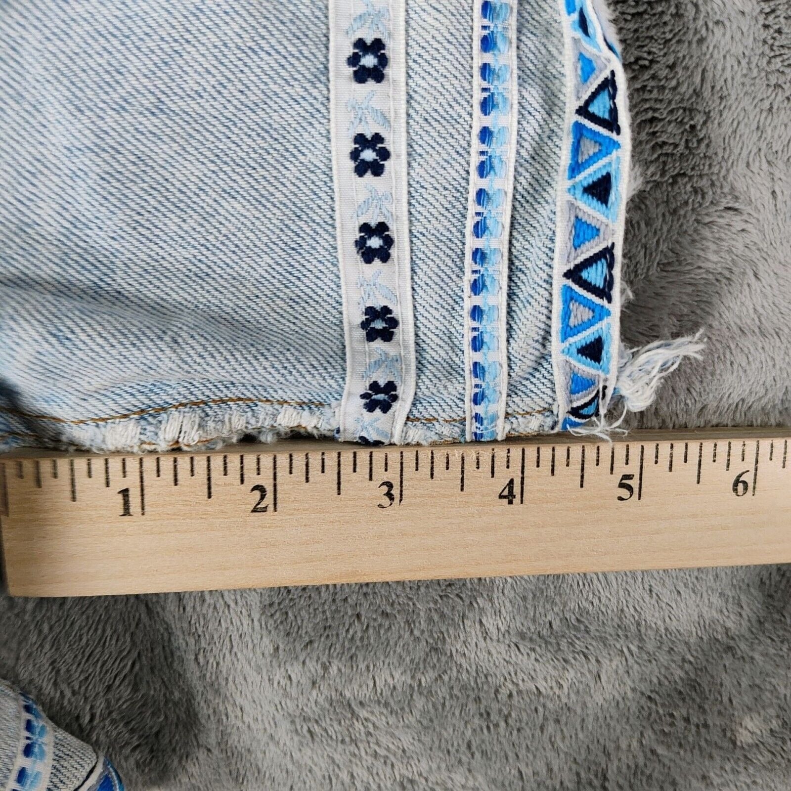 Condition Notes: Good vintage DIY condition. DIY cut offs with embroidered ribbon accents. Faint staining on back at bottom left corner below pocket. Spotted discoloration on right leg below pocket near middle seam. Heavy wear on Levi's patch. Spots of white staining on front of both legs (mostly blends into the light wash). Split left inseam. Faded fabric tag. See photos.