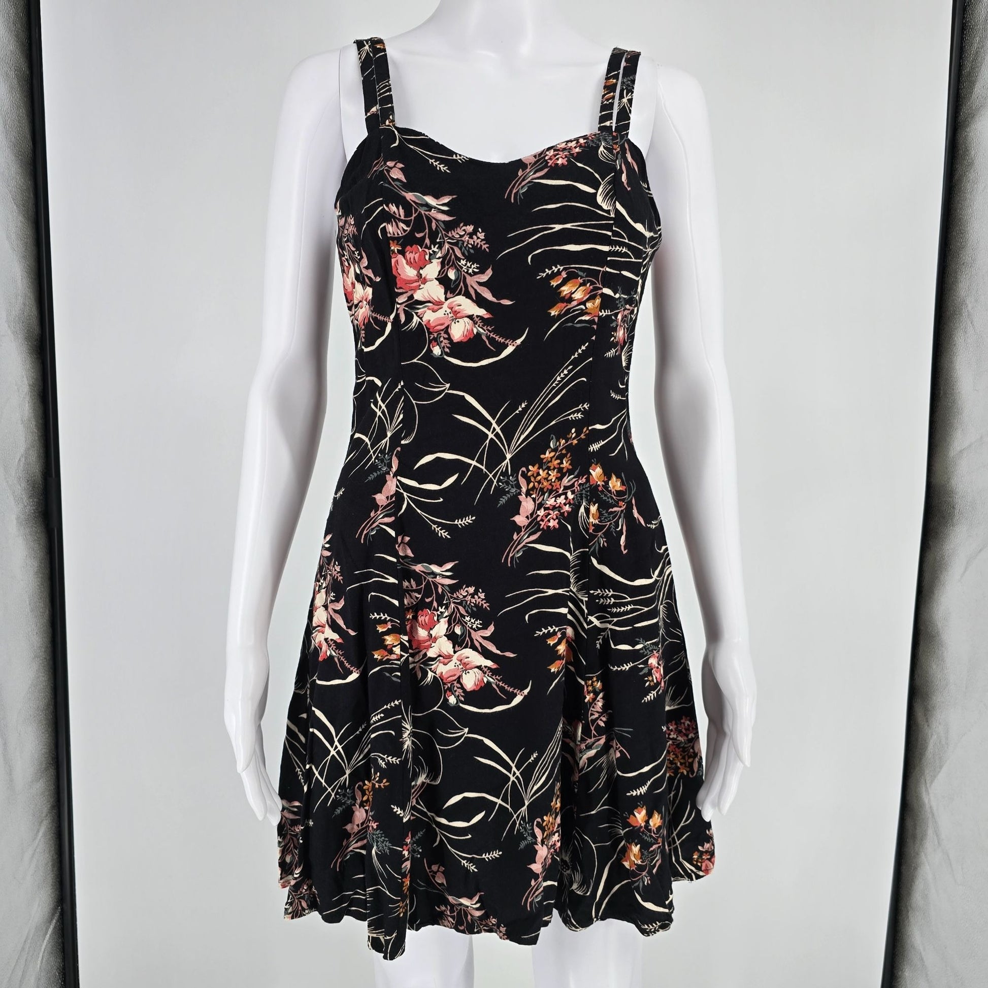 Vintage 1990s All That Jazz Black Floral Rayon Fit and Flare Mini Dress (S)