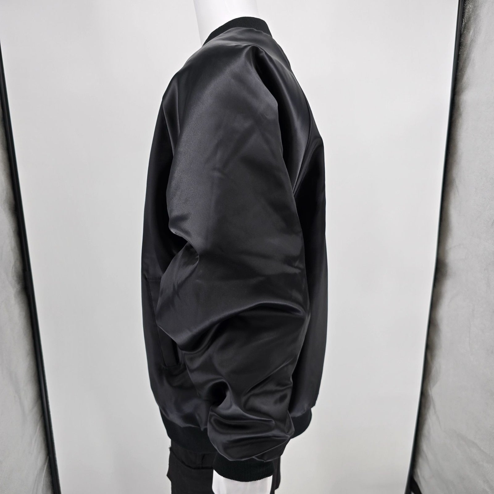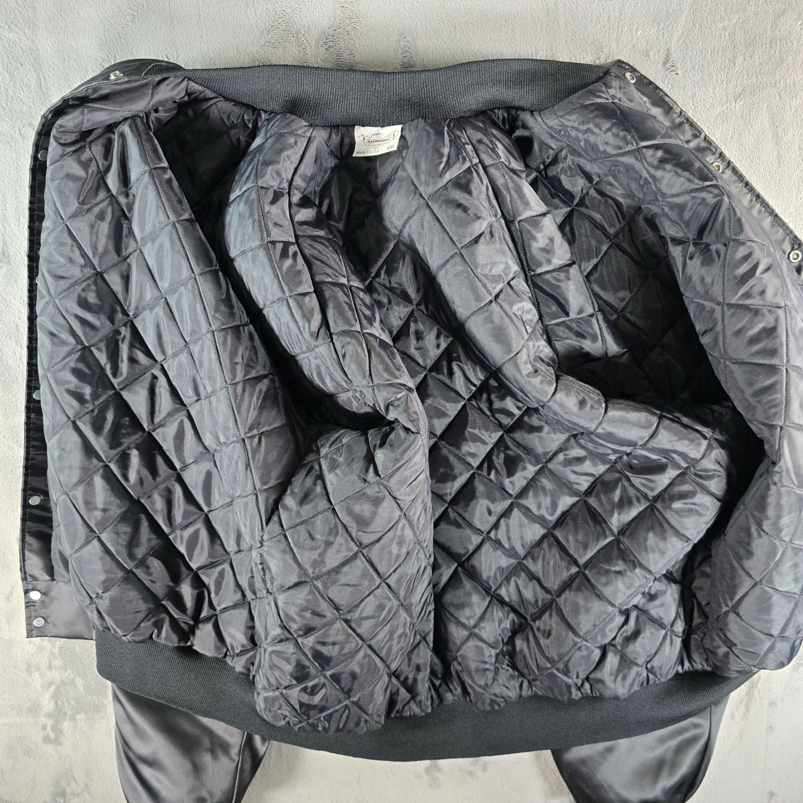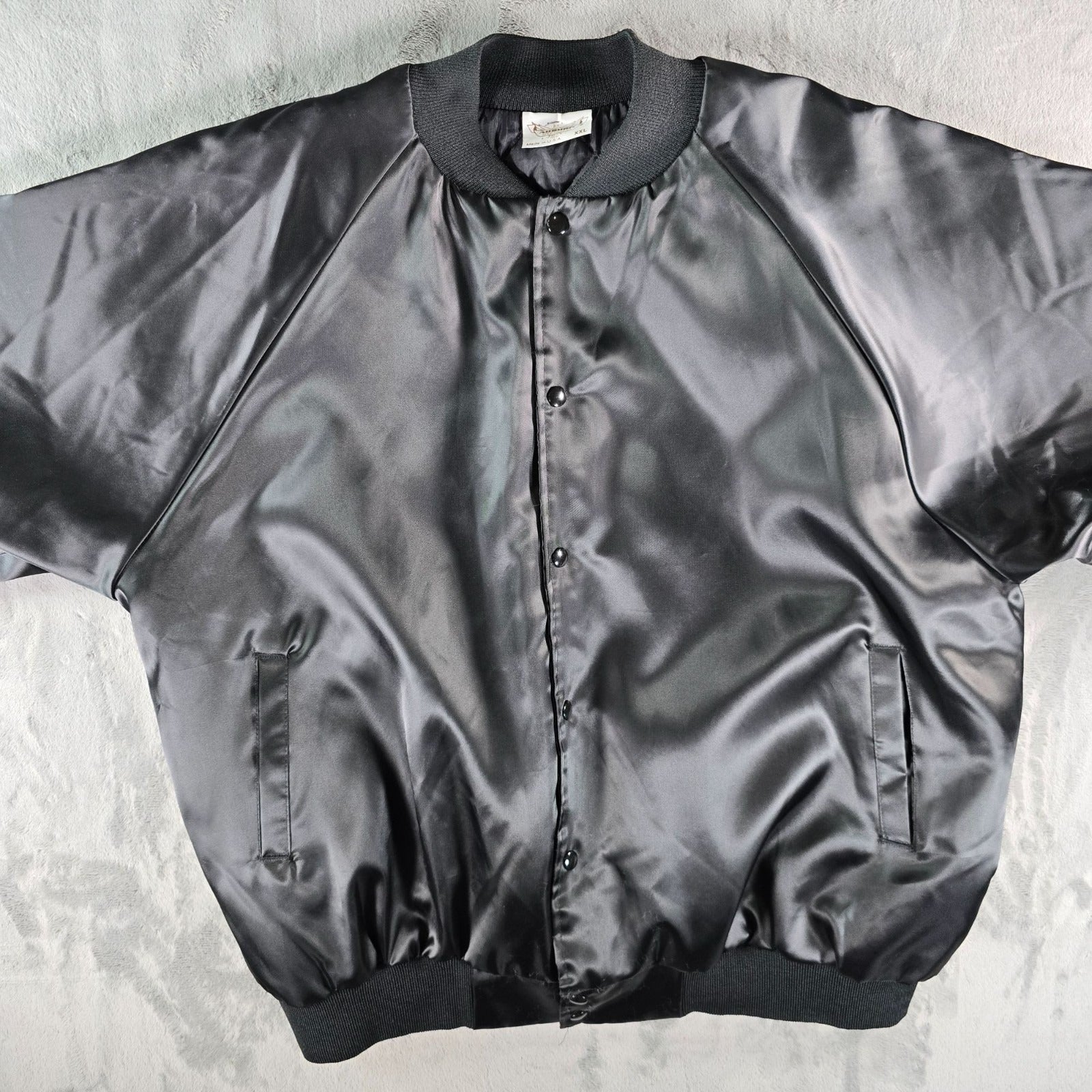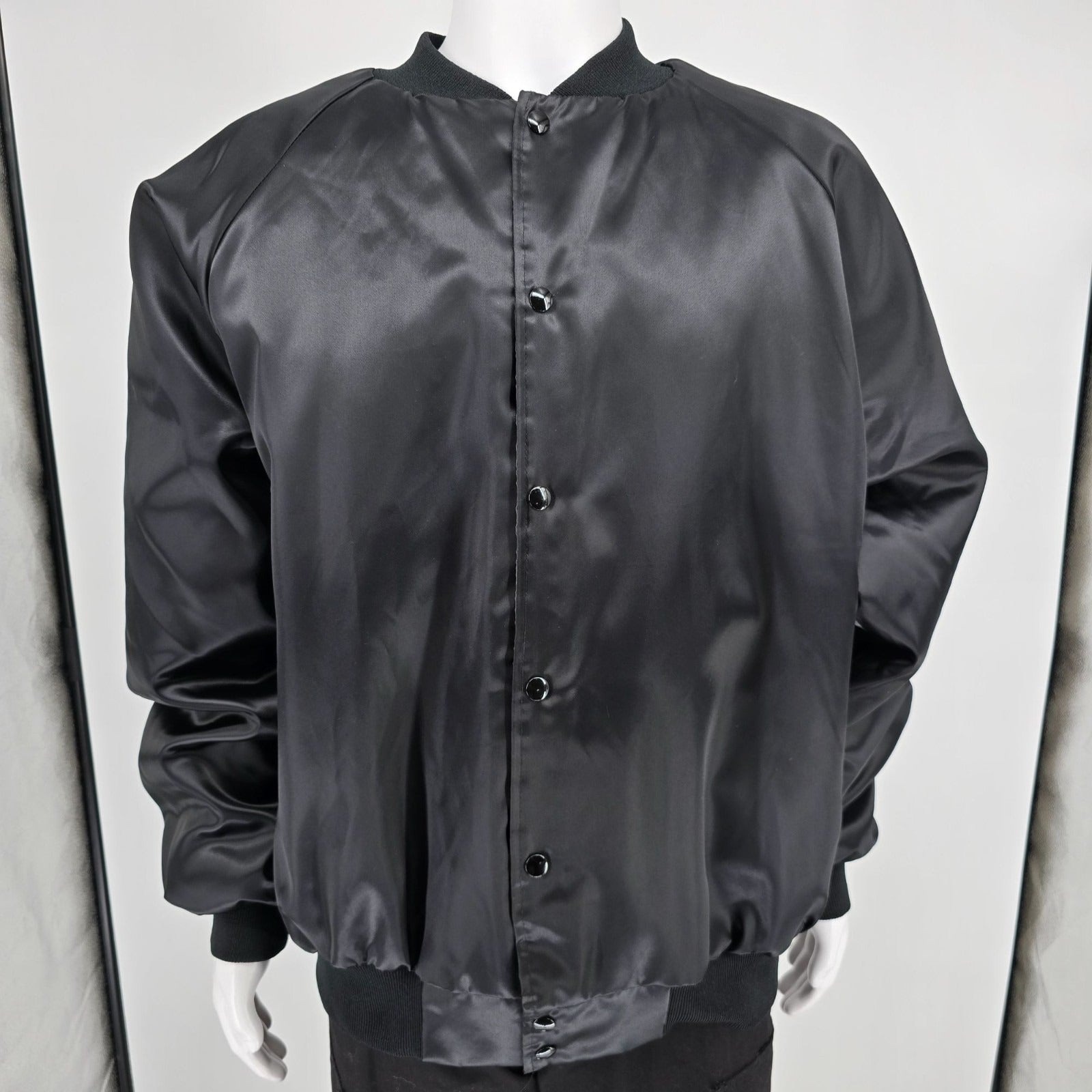 Notable Features: Satin bomber finish; snap front; rib-knit collar/cuffs/hem; raglan sleeves, quilted lining; pockets