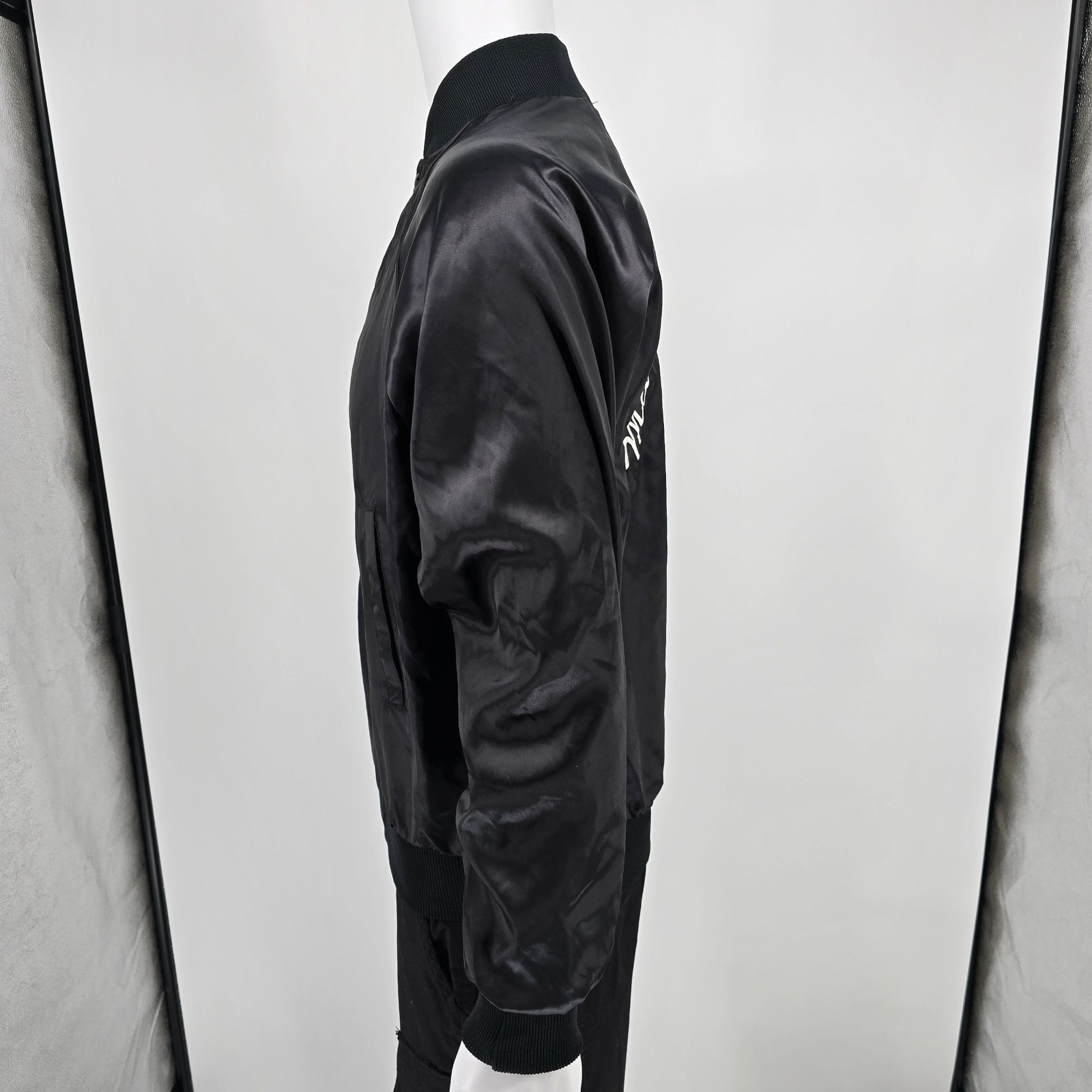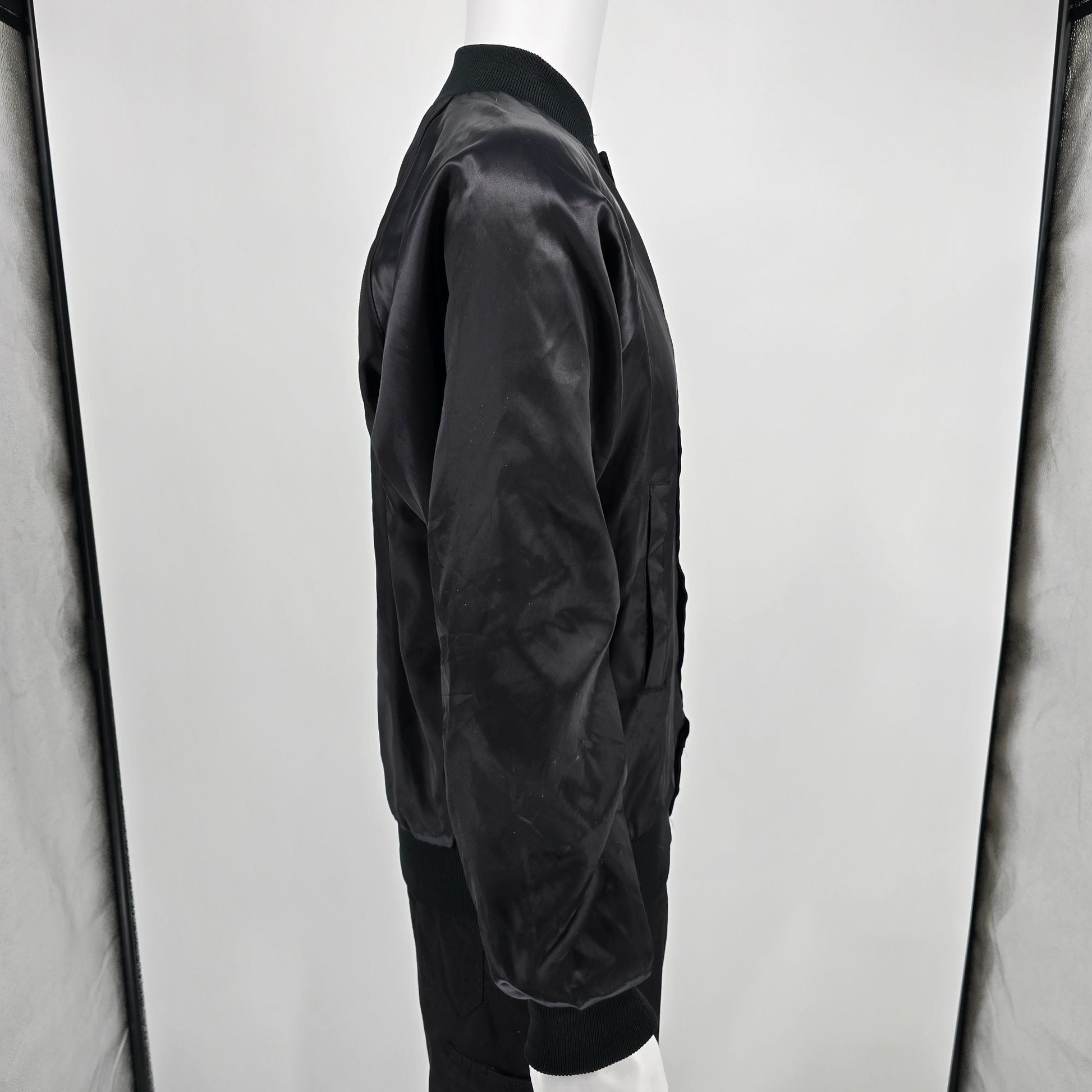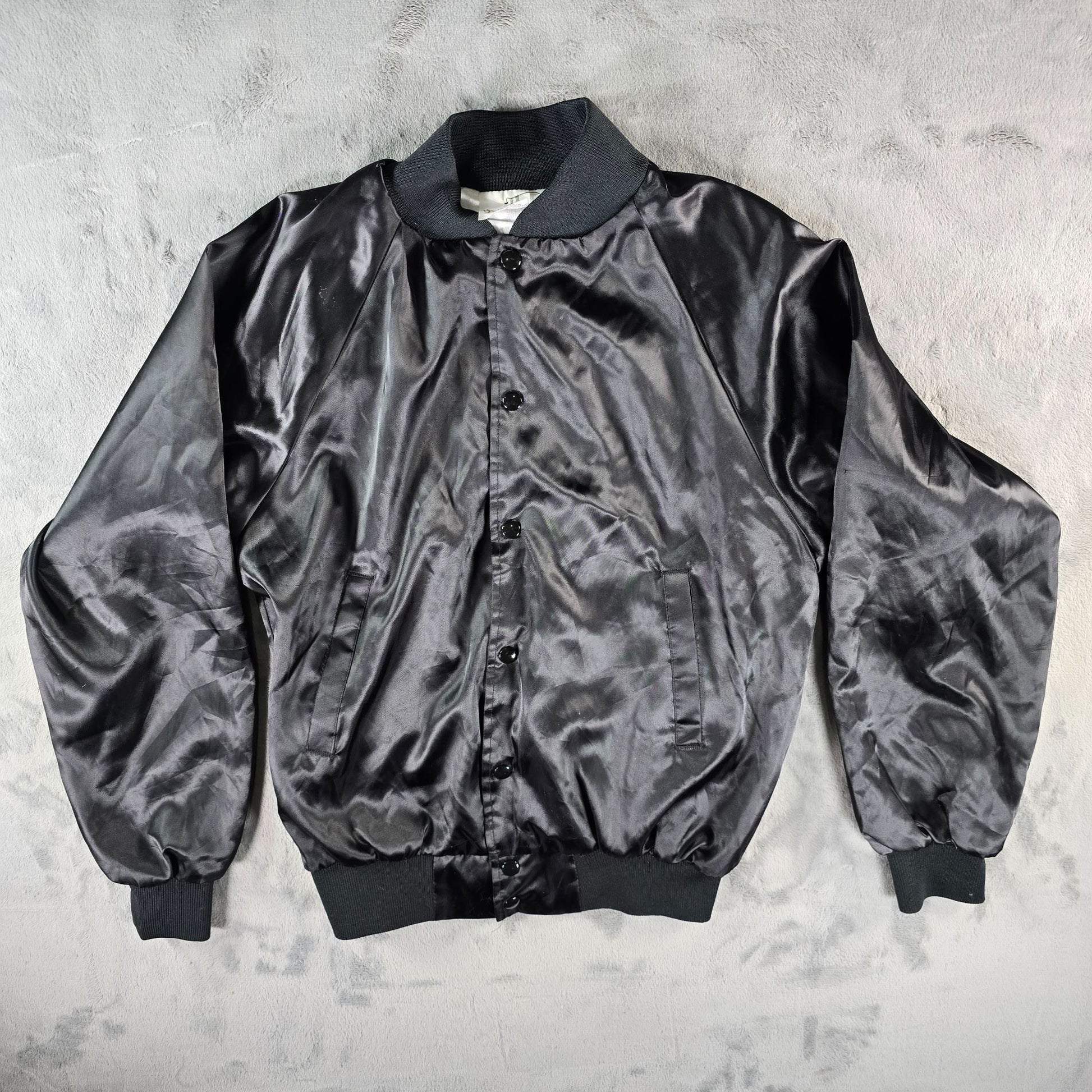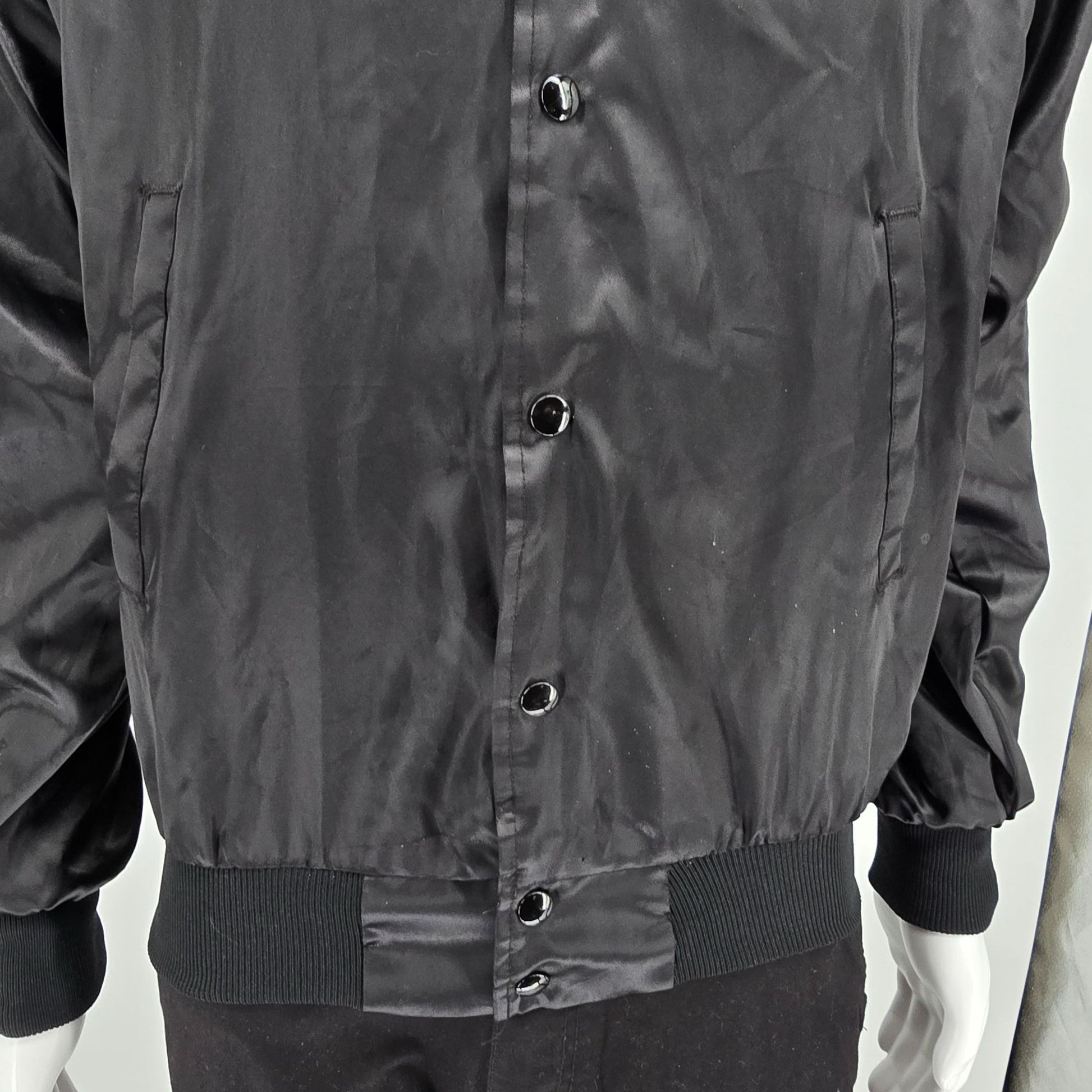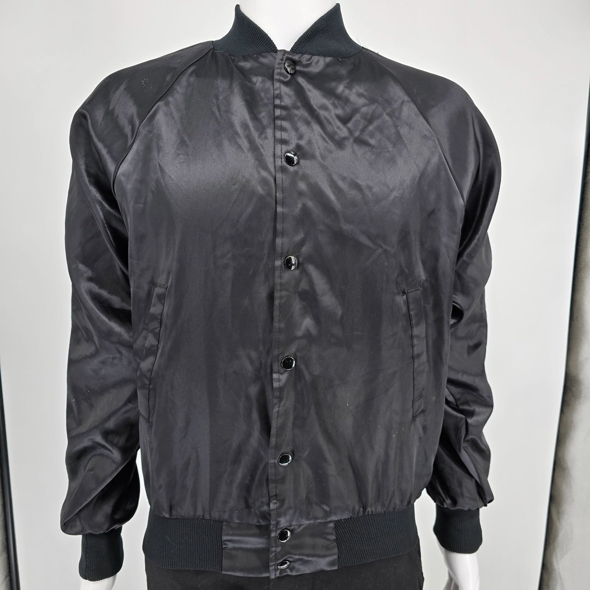 Notable Features: Snap-front satin nylon bomber jacket; Raglan sleeves; Rib-knit collar/cuffs/hem; Slash hand pockets