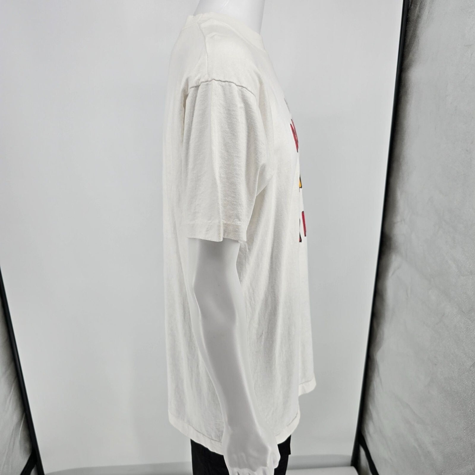 Faint dark marks on right side of t-shirt between logo and hem.