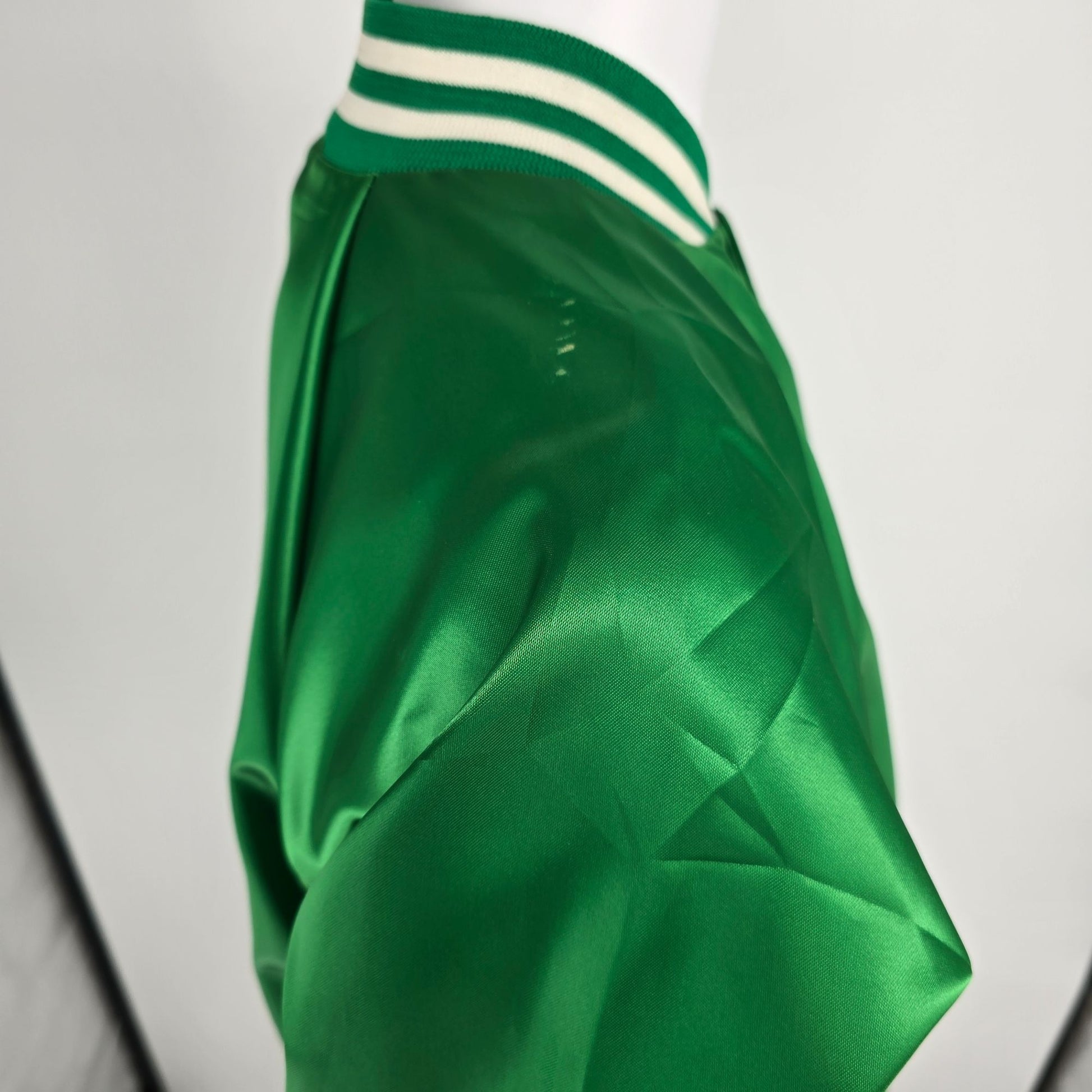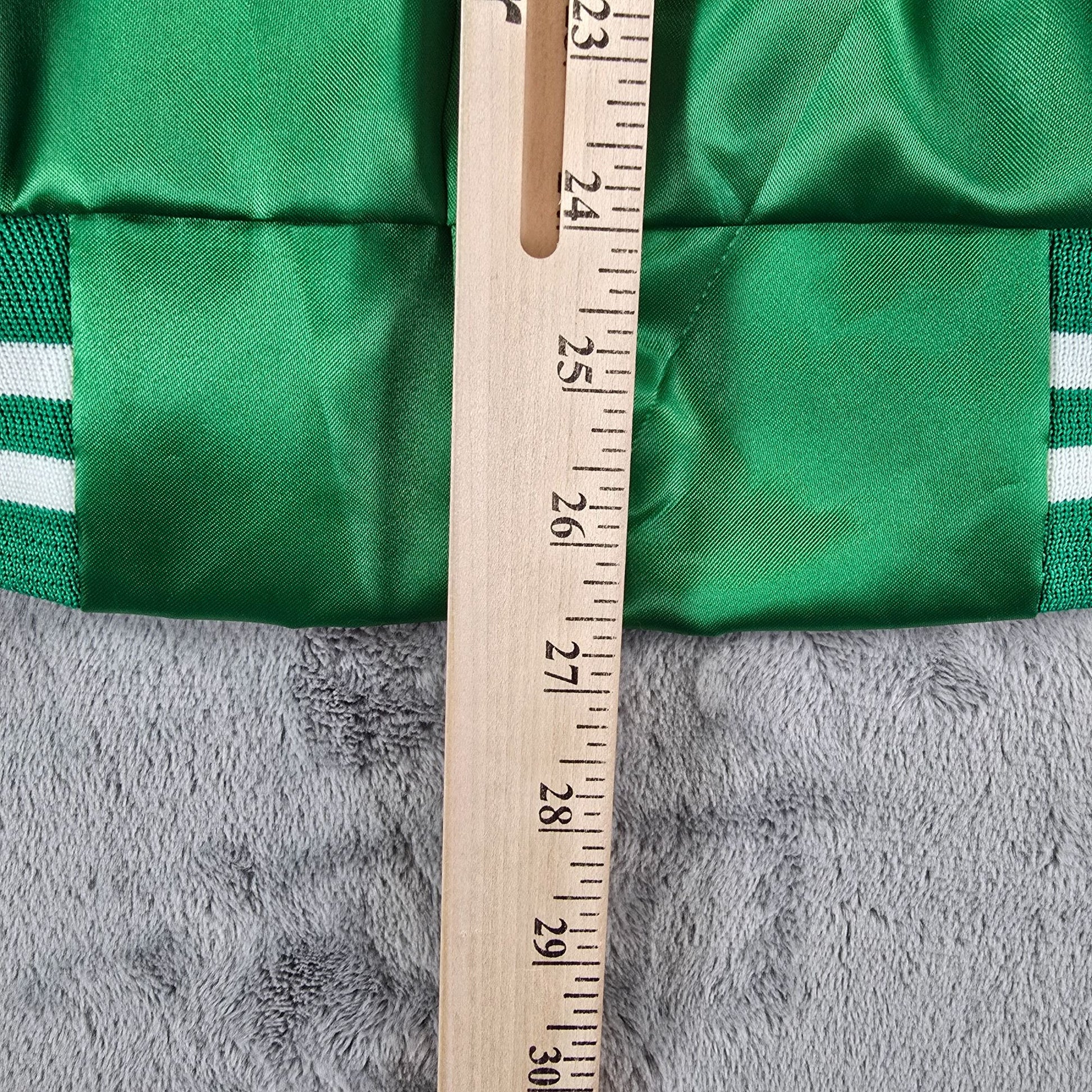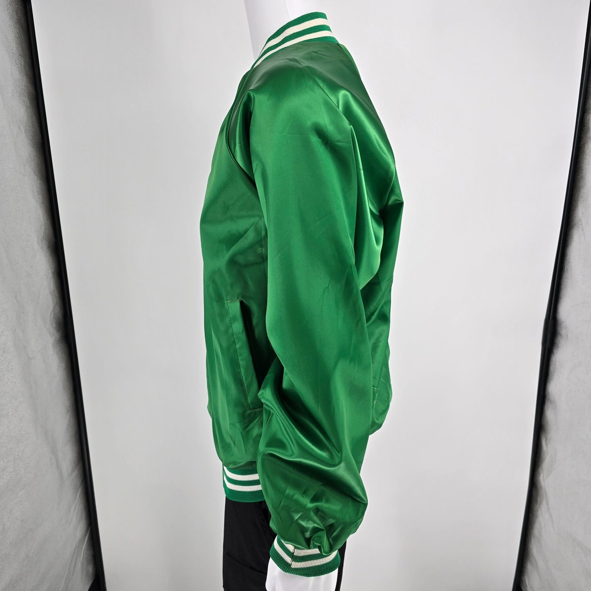 Notable Features: Nylon Satin Bomber Jacket; Snap front; Rib knit collar/cuffs/hem; pockets