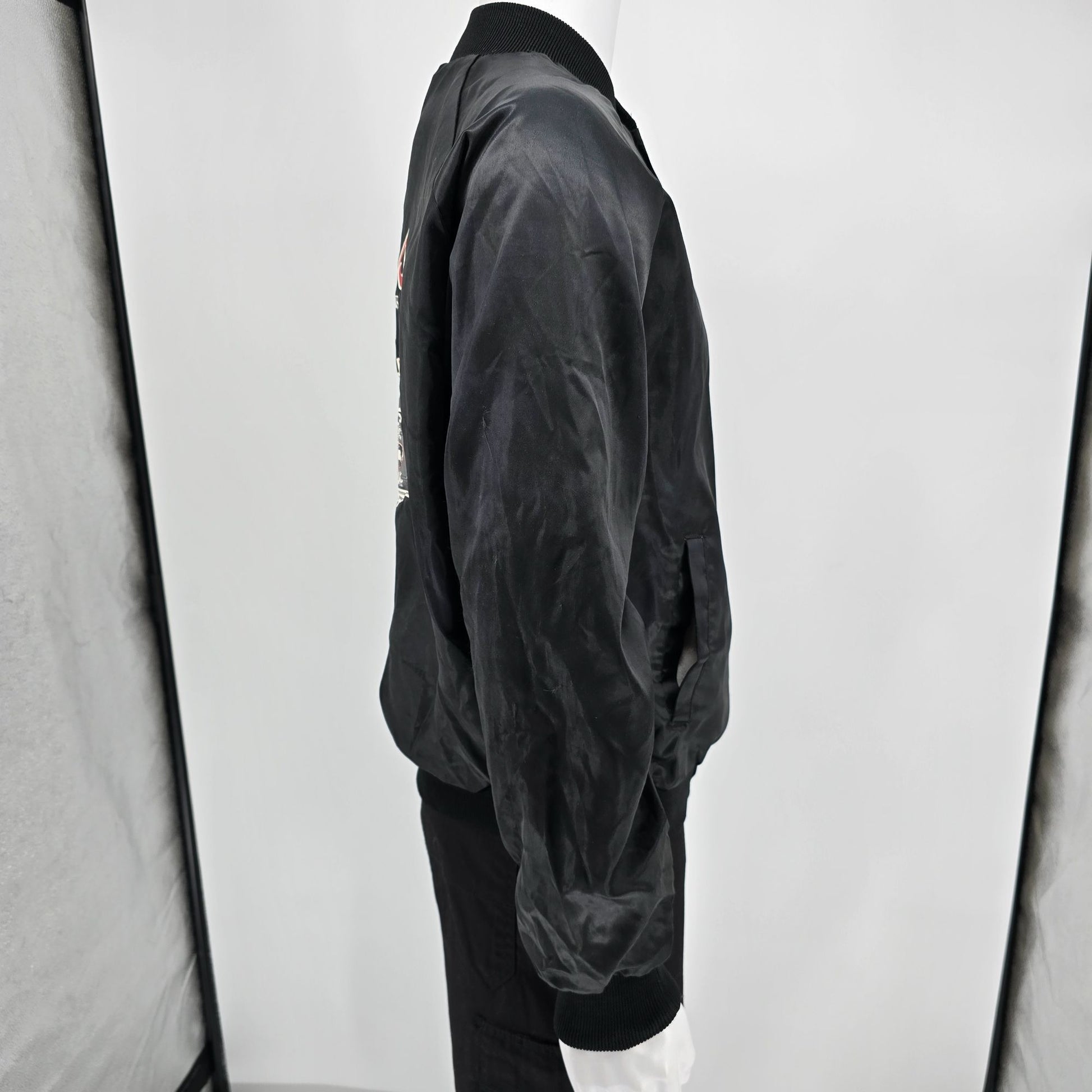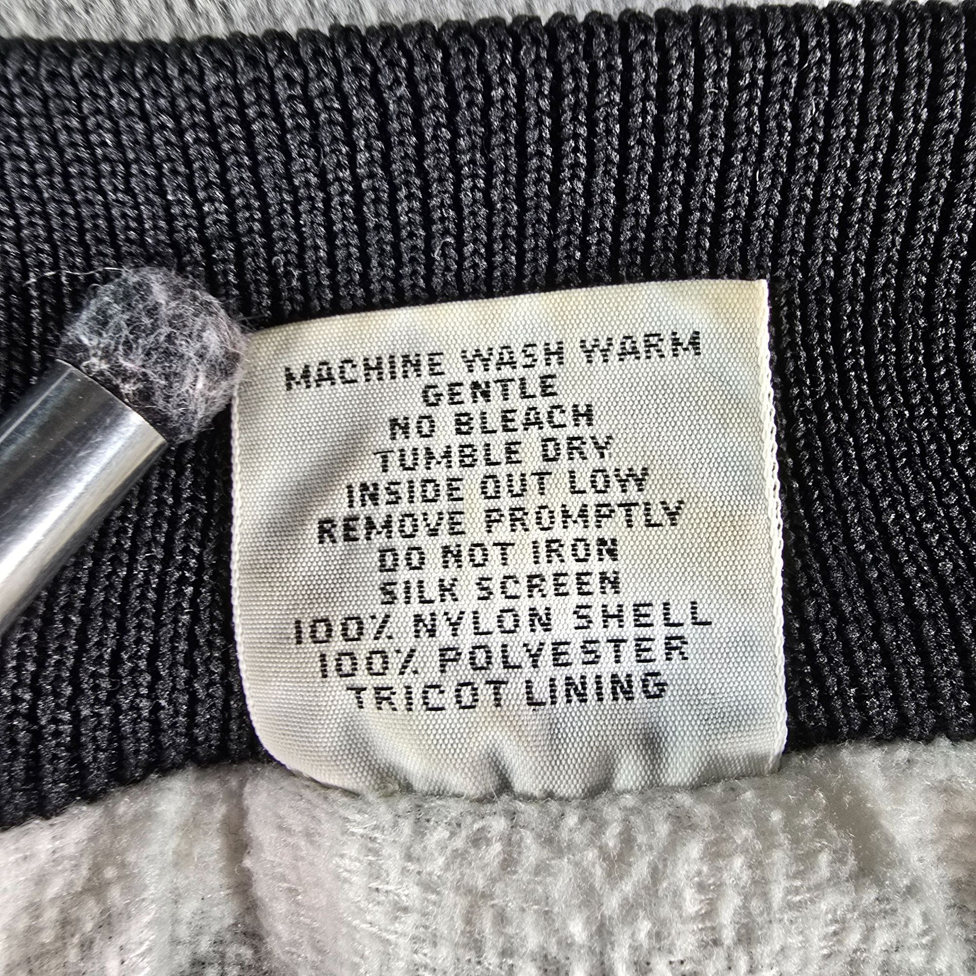 Good overall used vintage condition. Some visible wear and discoloration at graphics. Nylon shlle shows creasing and light surface marks. Tear at left side of inner lining. Significant discoloration of inner lining. See photos for details.