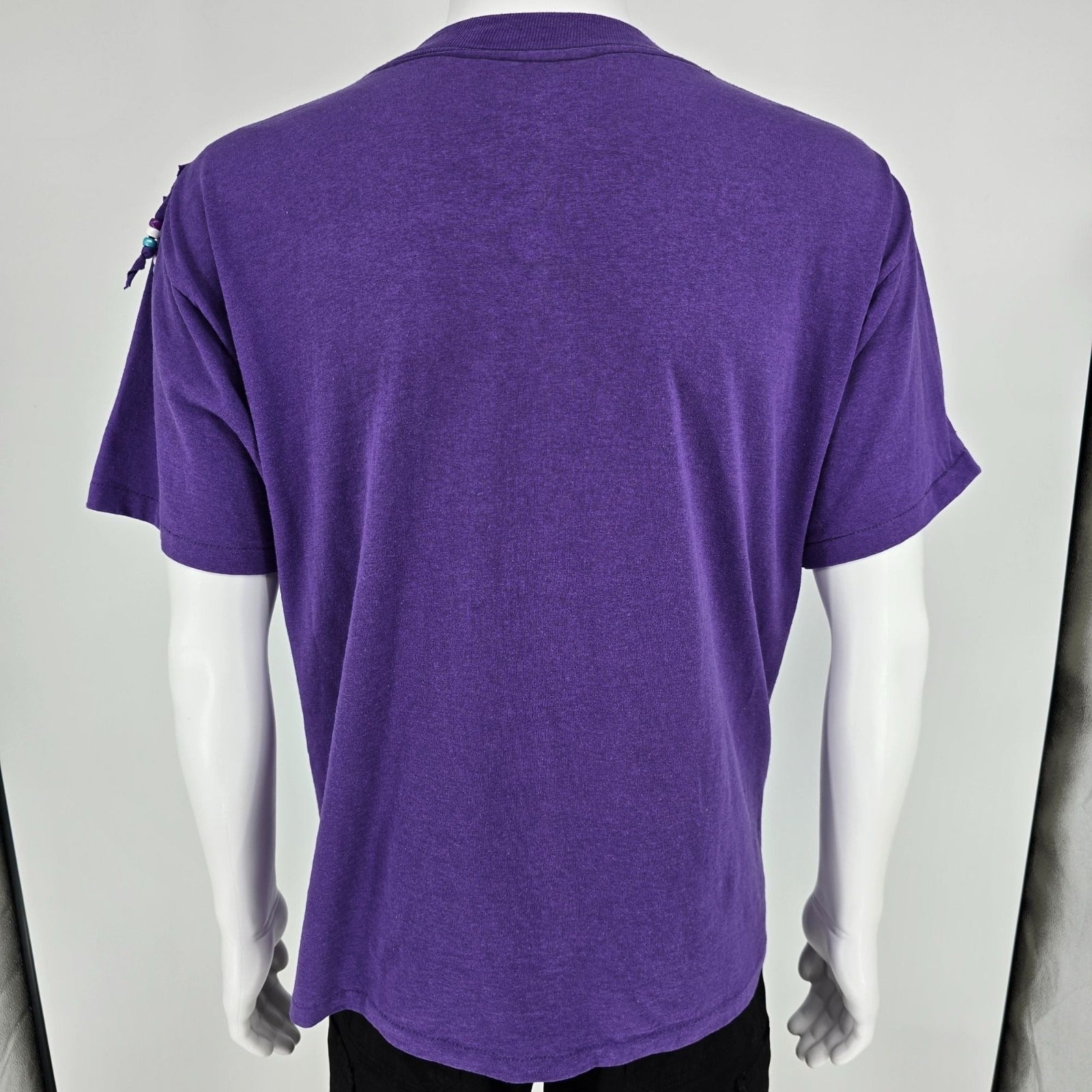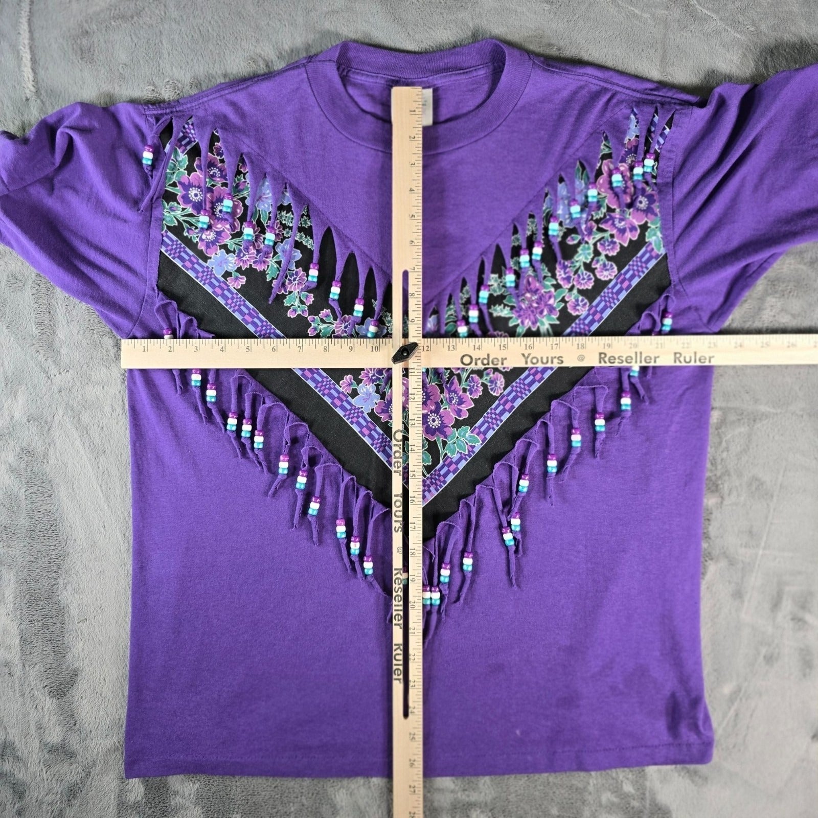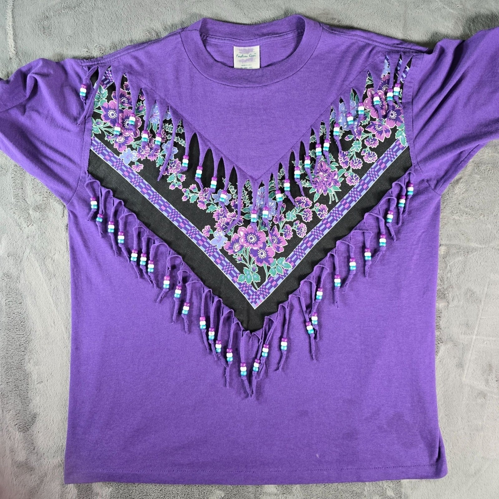 Vintage 1990s Fashion Gear Floral Purple Beaded Fringe Made in USA T-Shirt (XL)