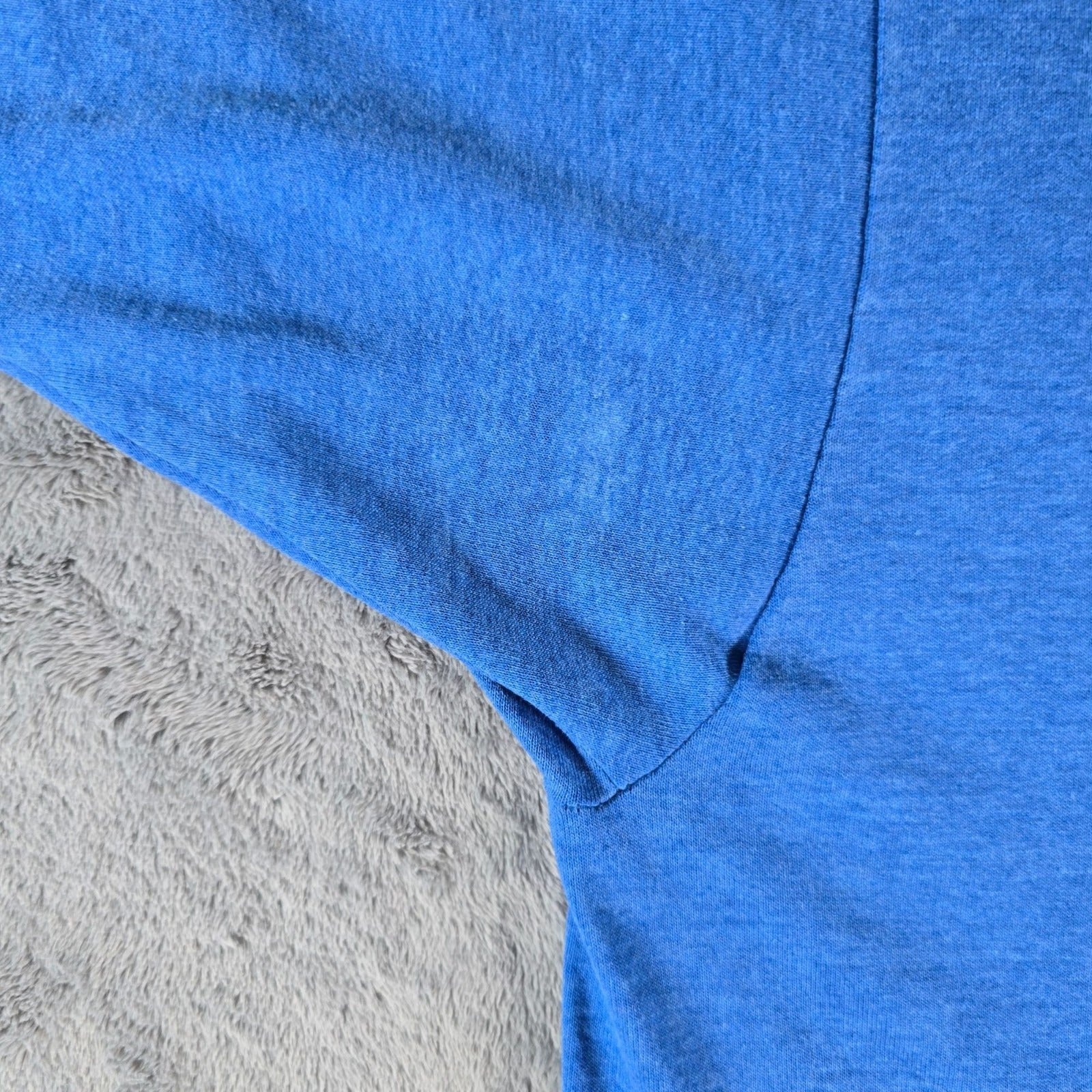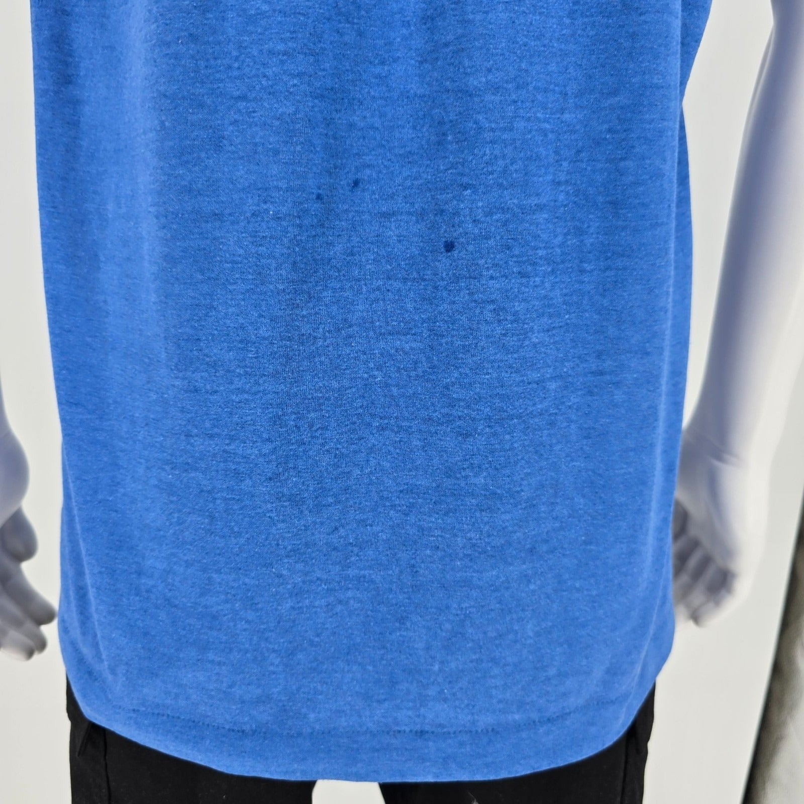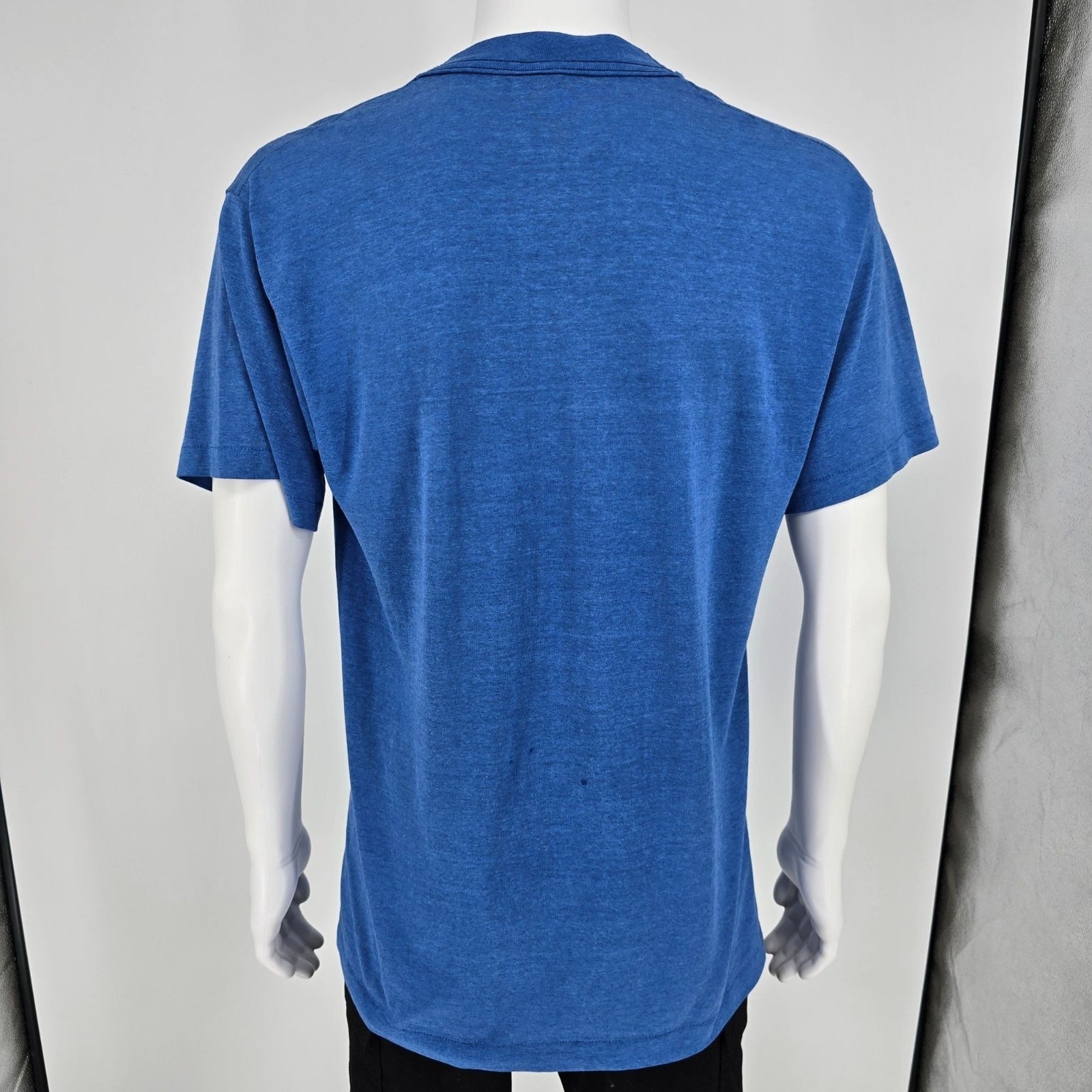 Good used vintage condition. No rips, cuts, holes, or tears. Some visible wear/cracking at graphic. Areas of light colored residue at both pits (remained after hand washing). Multiple spots of dark discoloration on the back caused by heavy fabric wear (heathered cotton breaking down leaving only the polyester behind). Otherwise moderate fabric wear and fading throughout. See photos for detail