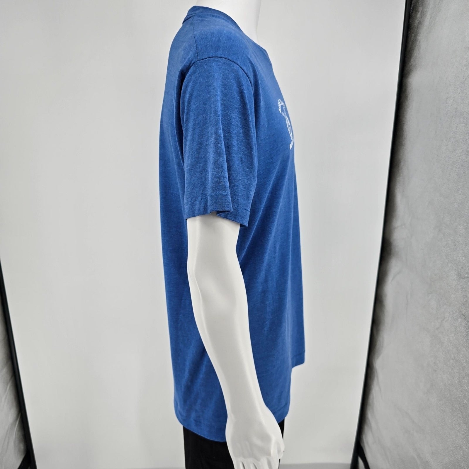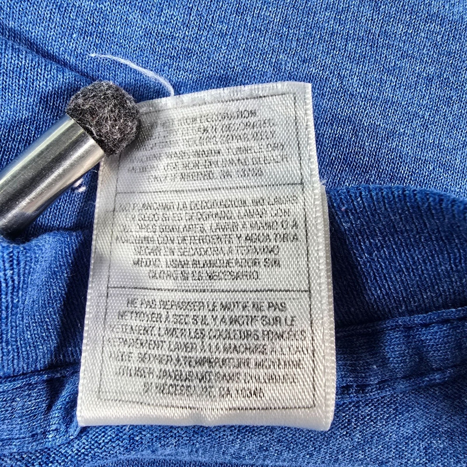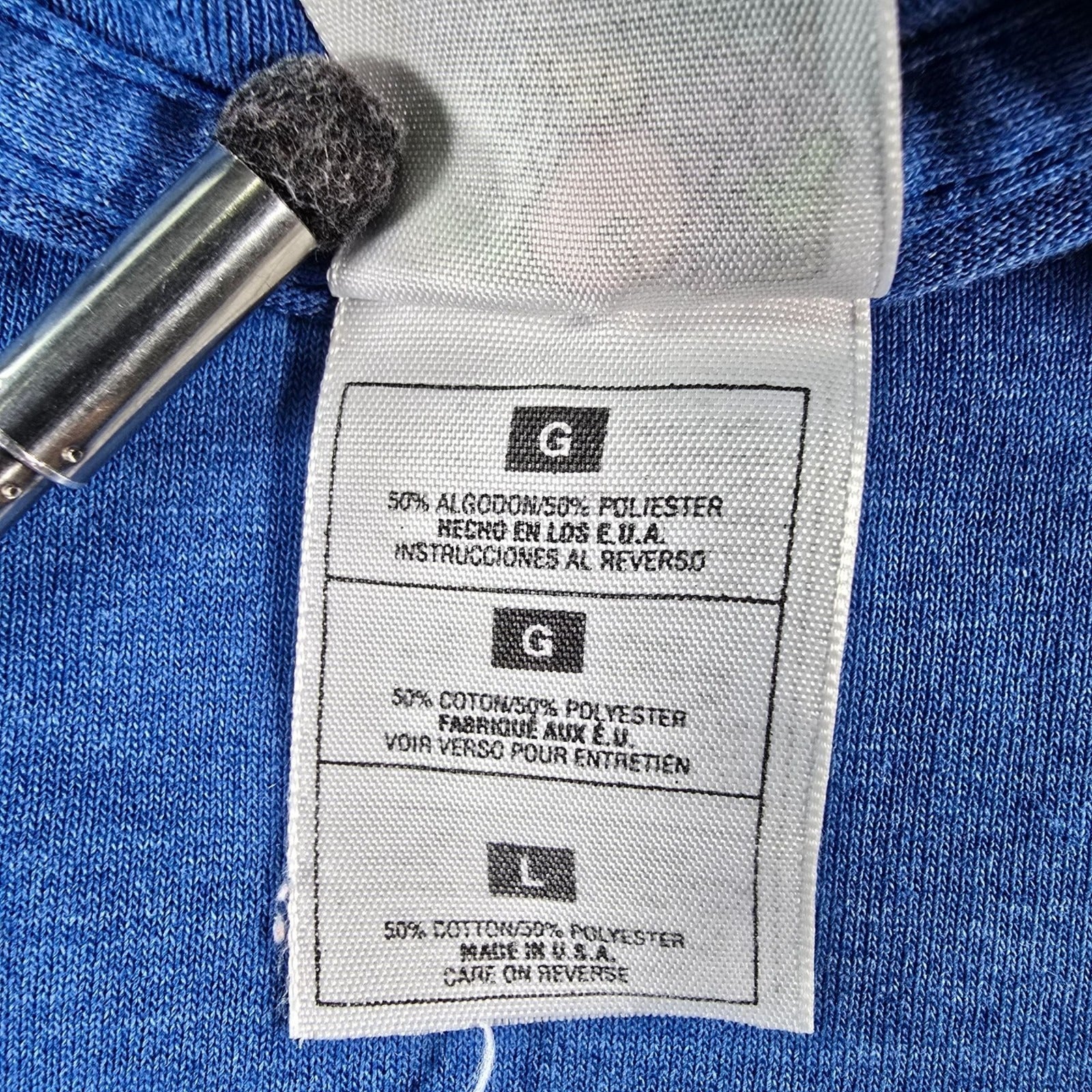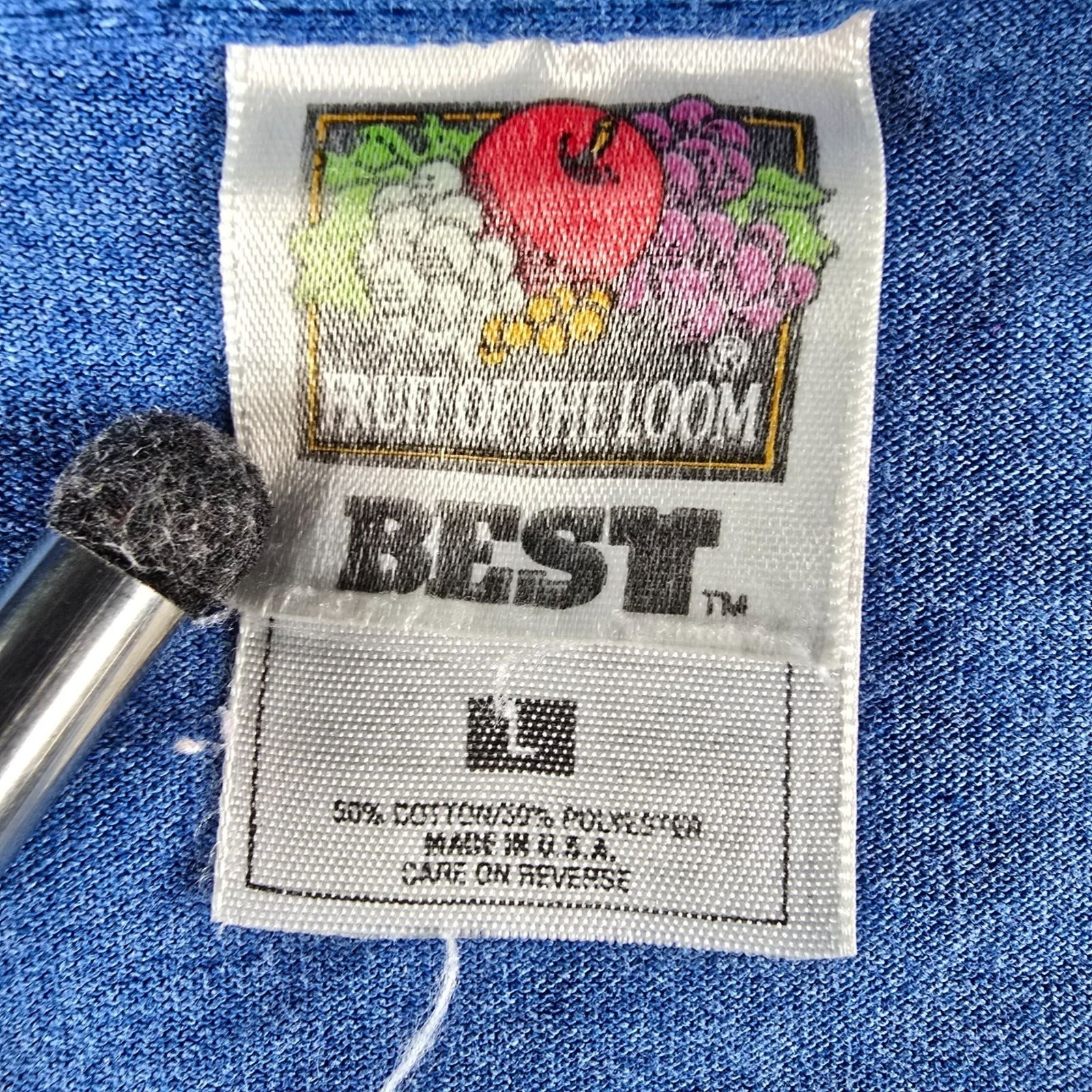 Good used vintage condition. No rips, cuts, holes, or tears. Some visible wear/cracking at graphic. Areas of light colored residue at both pits (remained after hand washing). Multiple spots of dark discoloration on the back caused by heavy fabric wear (heathered cotton breaking down leaving only the polyester behind). Otherwise moderate fabric wear and fading throughout. See photos for detail