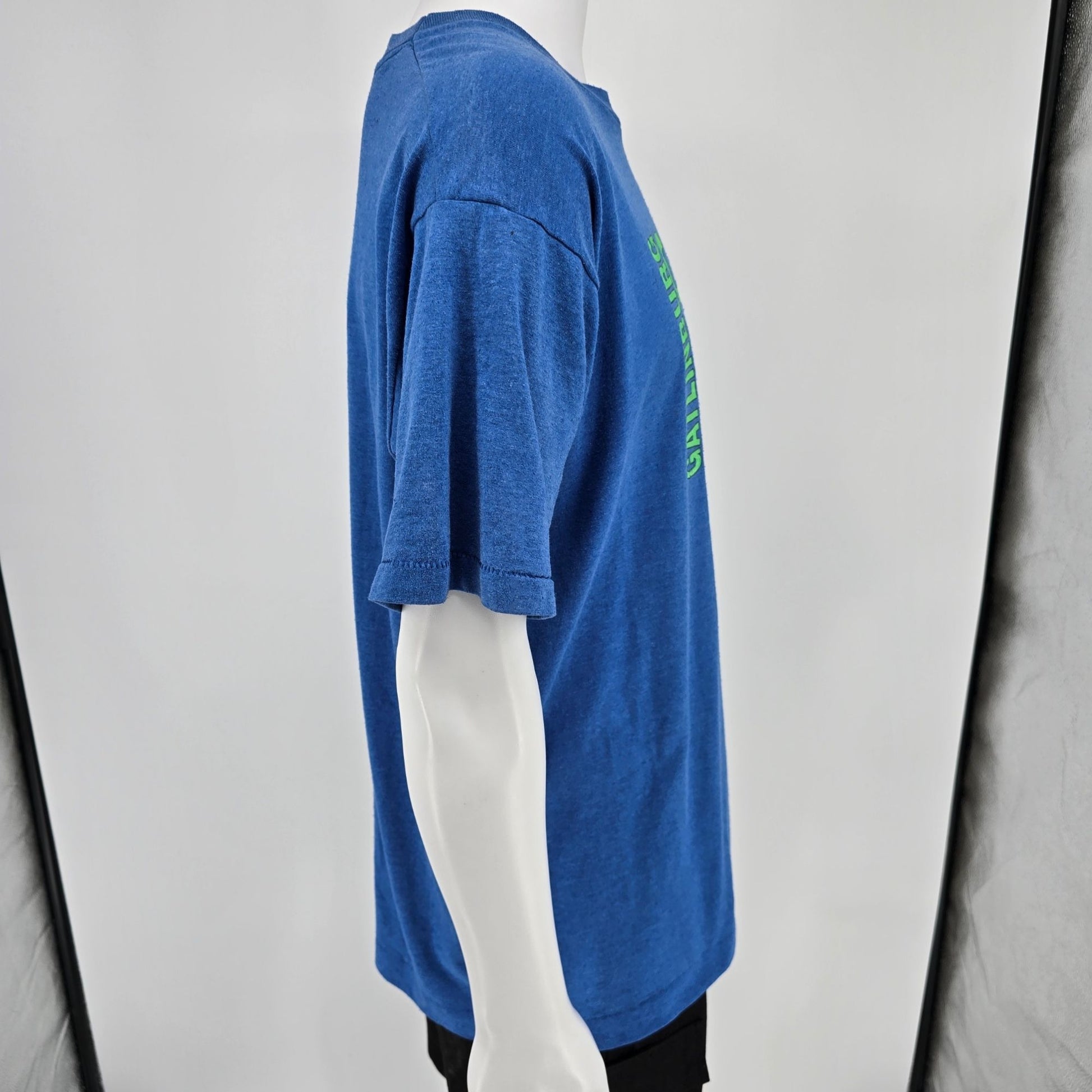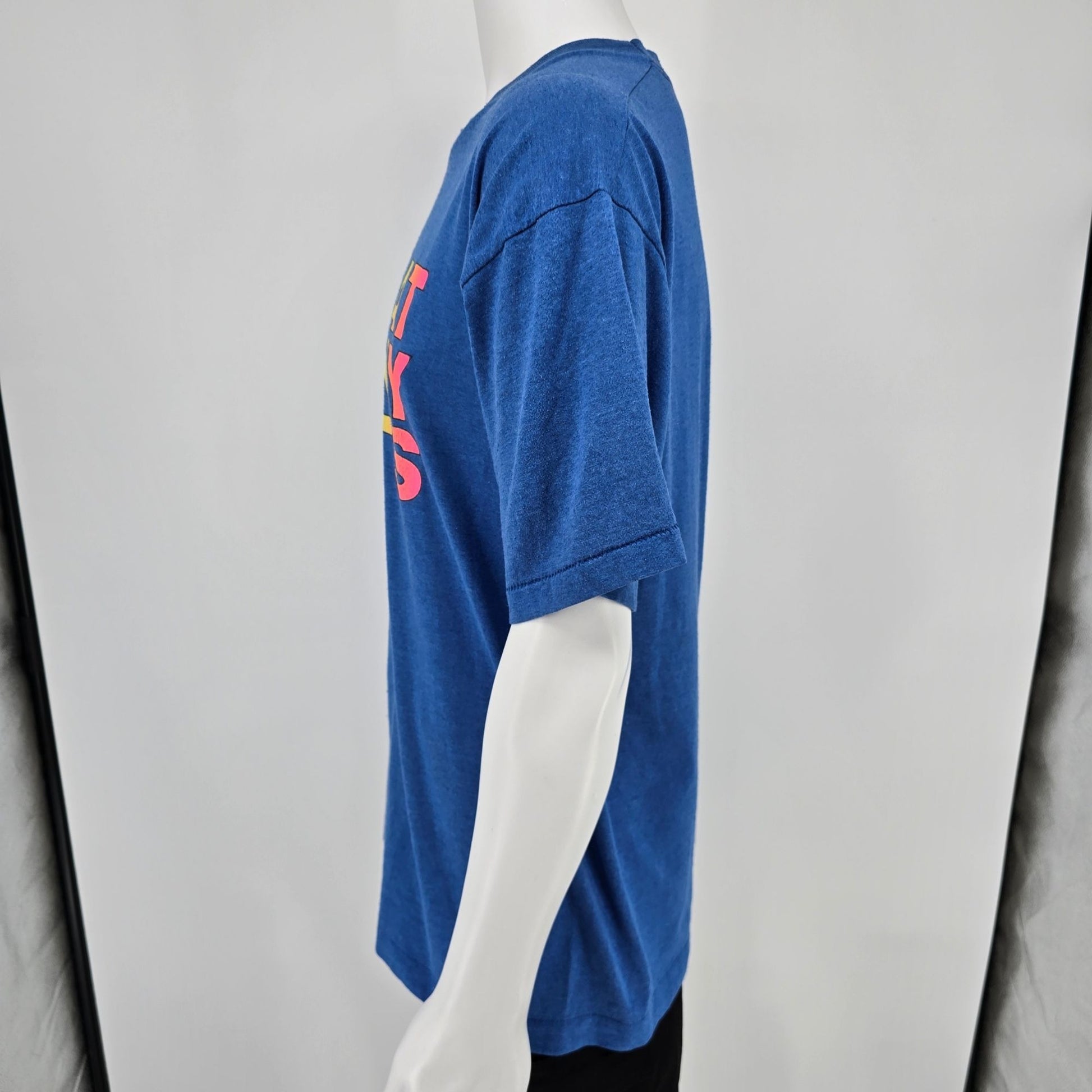 Good overall used vintage condition. Visible cracking/distressing at text graphic. Small area of staining near left shoulder. Moderate to heavy fabric wear, pilling, and fading throughout. See photos for details.