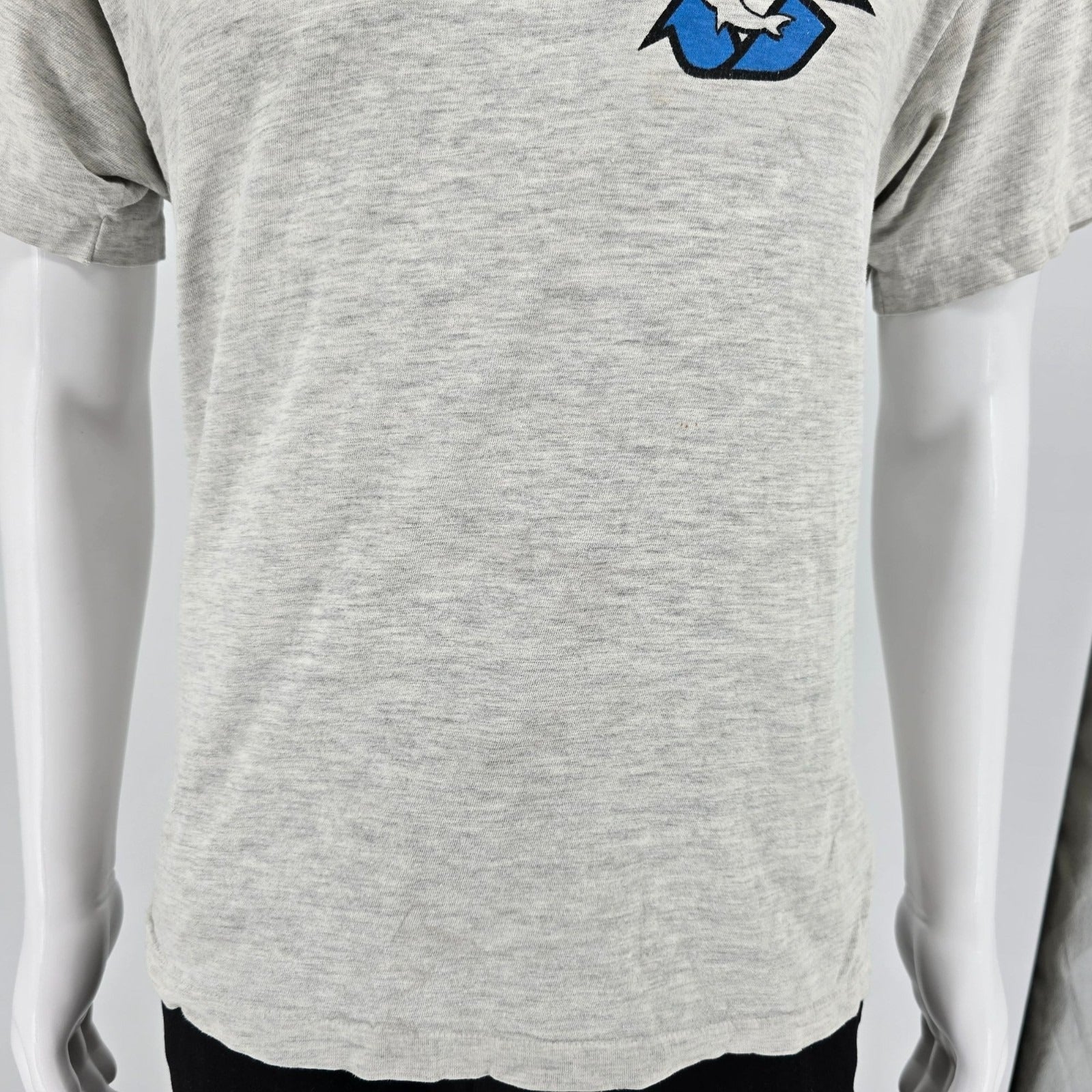 Large marks of dark discoloration at chest level on front to right of logo.