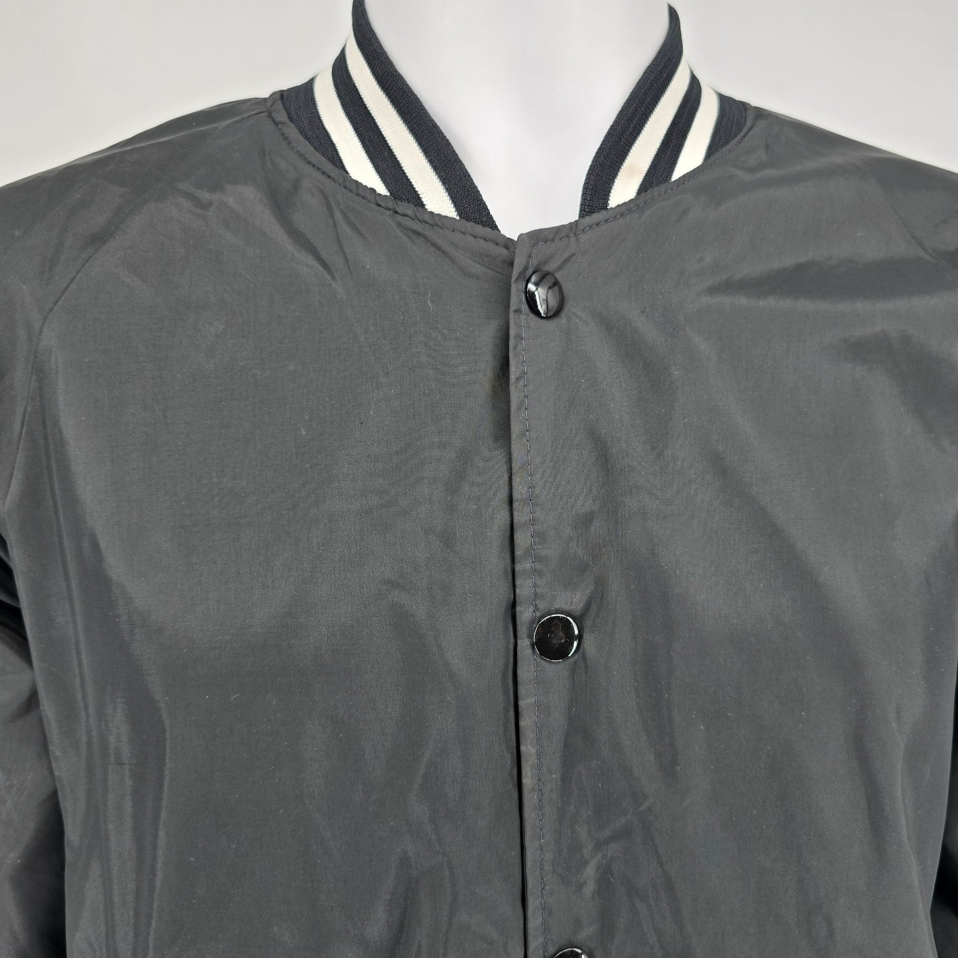Good used vintage condition. No identified rips, cuts, holes, or tears. Area of white staining/discoloration on right sleeve near cuff. A few faint, scattered stains on the white trim stripes. Light to moderate scuffing, wrinkling, and fabric wear throughout. See photos for details.