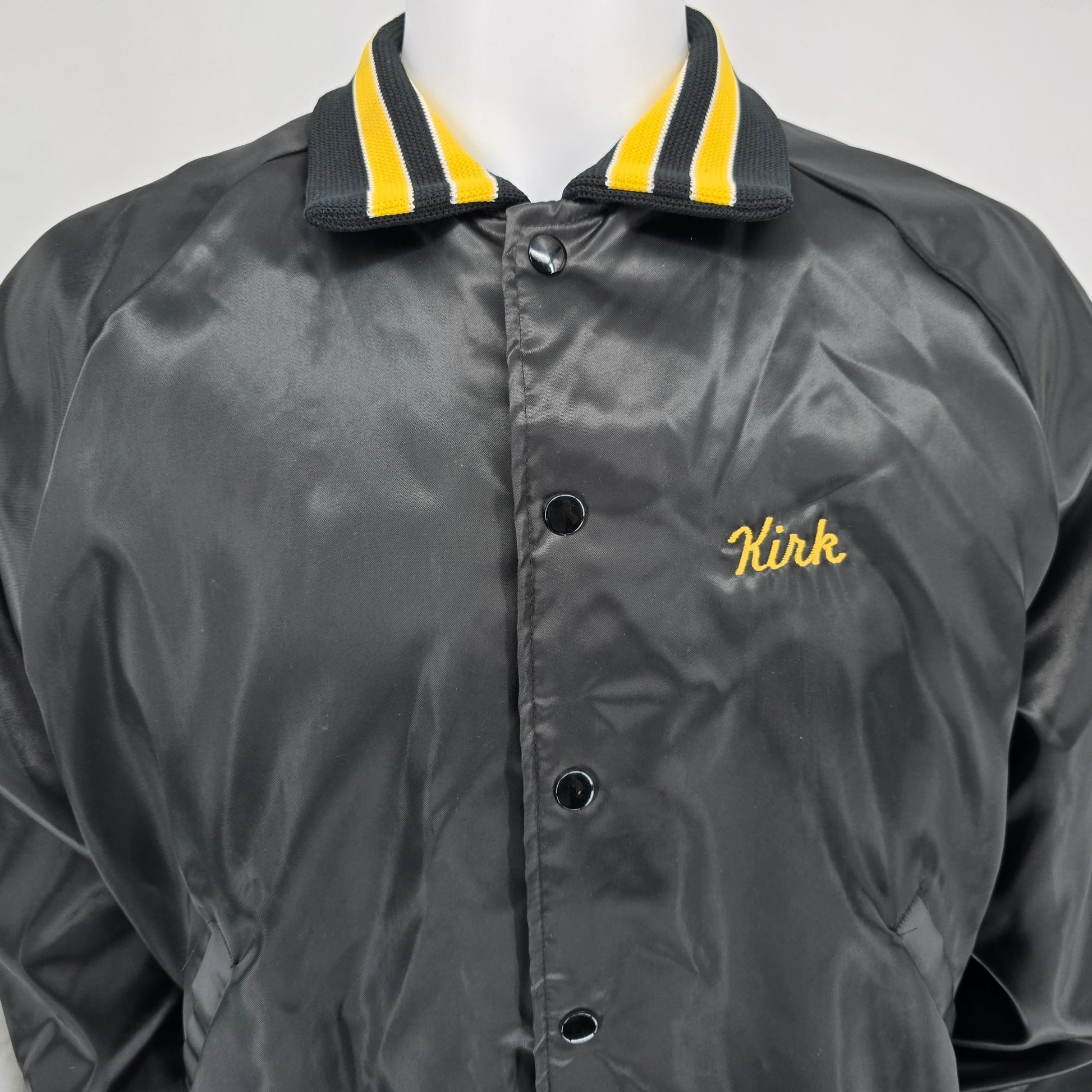 Notable Features: Snap front; Raglan sleeves; striped knit collar/cuffs/hem; script name embroidery “Kirk” at chest; Pockets