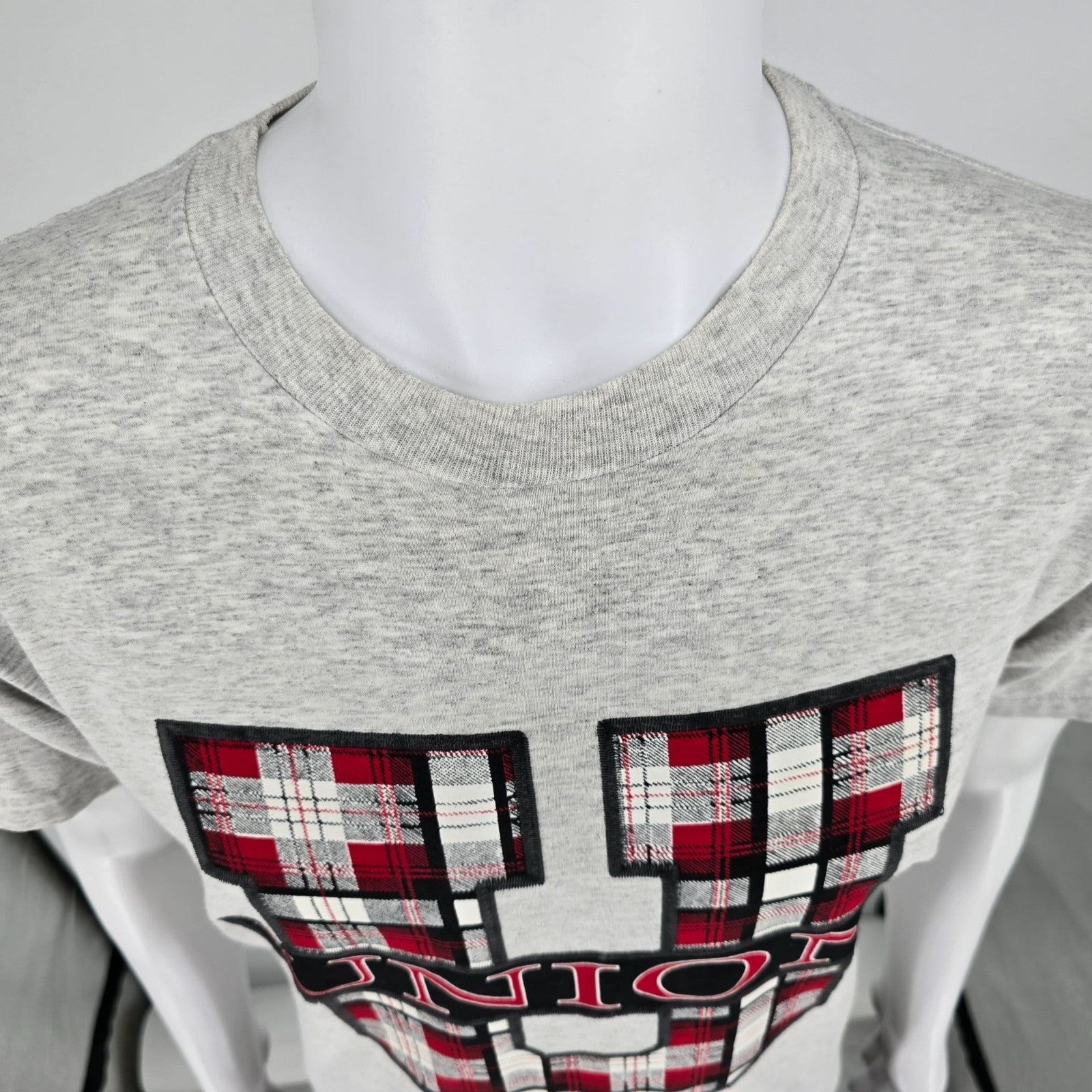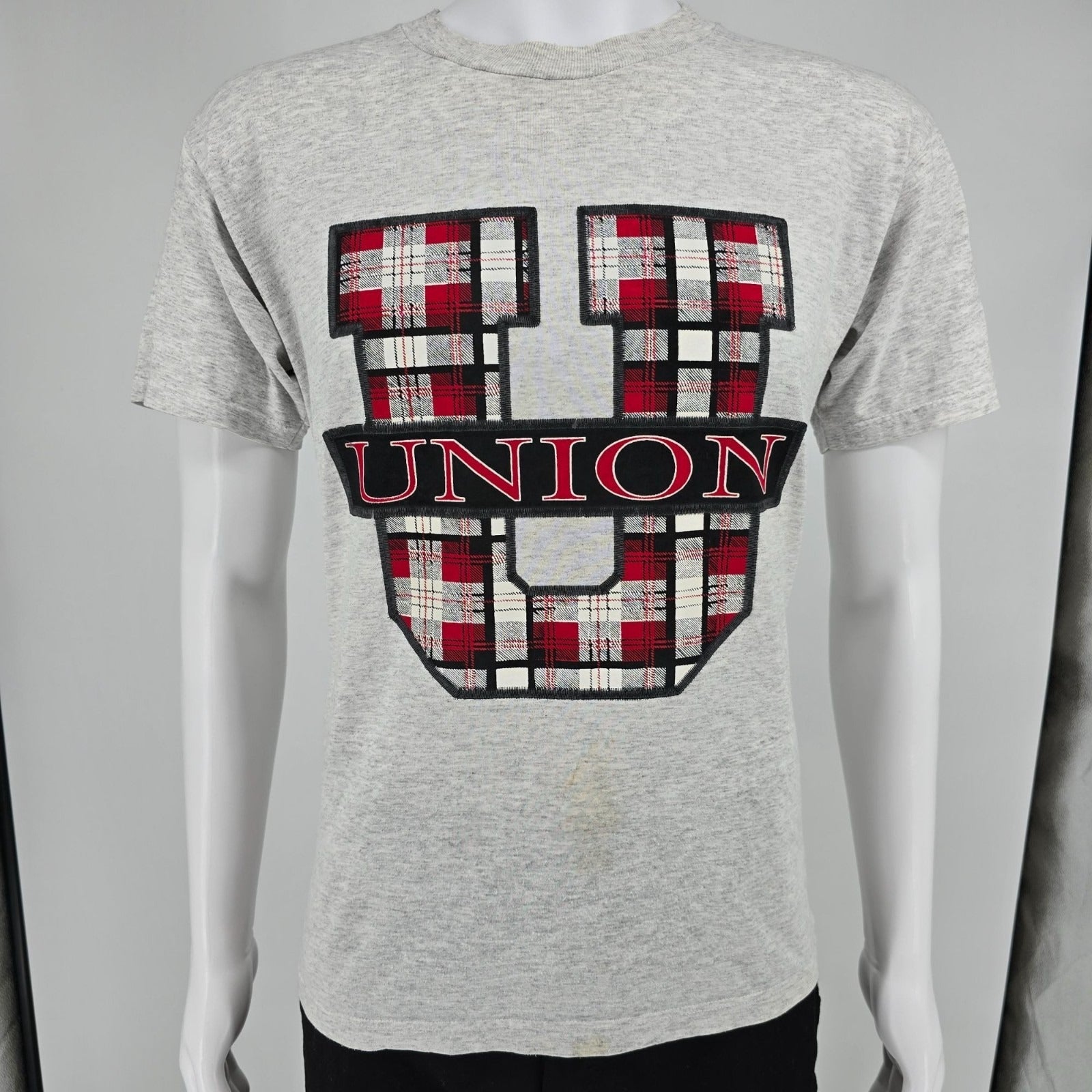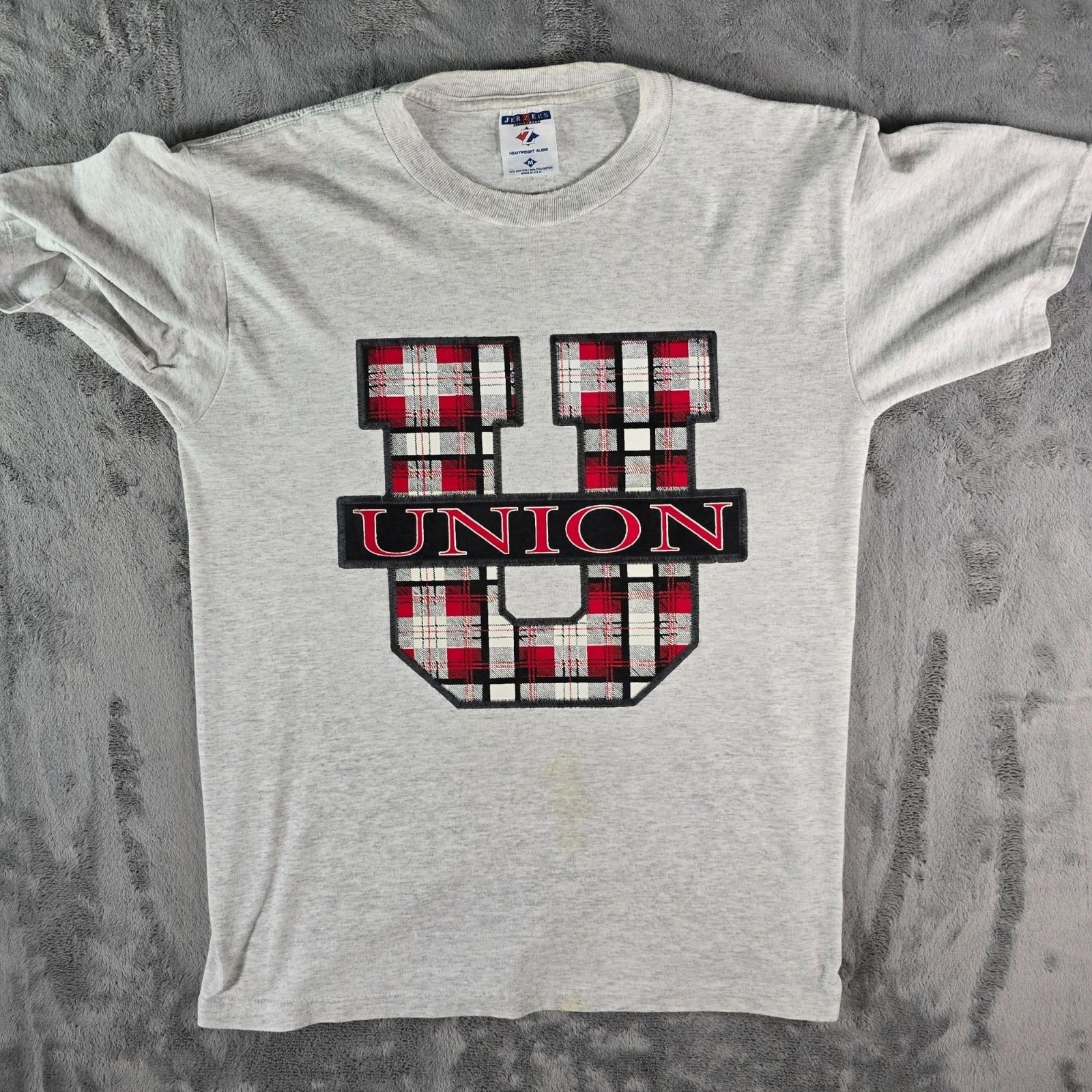 Vintage 1990s Jerzees Activewear Union U Plaid Logo Graphic T-Shirt (M) *Stains