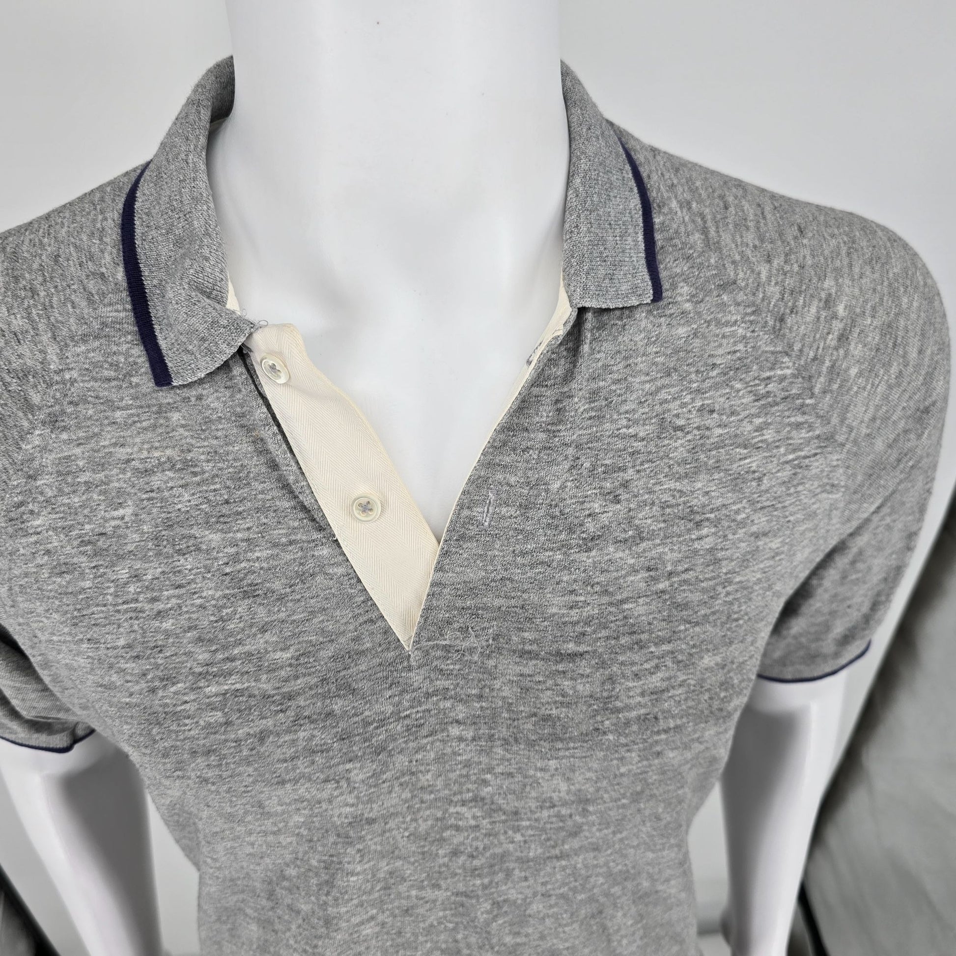 Color: Heather gray with navy-tipped collar and cuffs; cream herringbone contrast placket