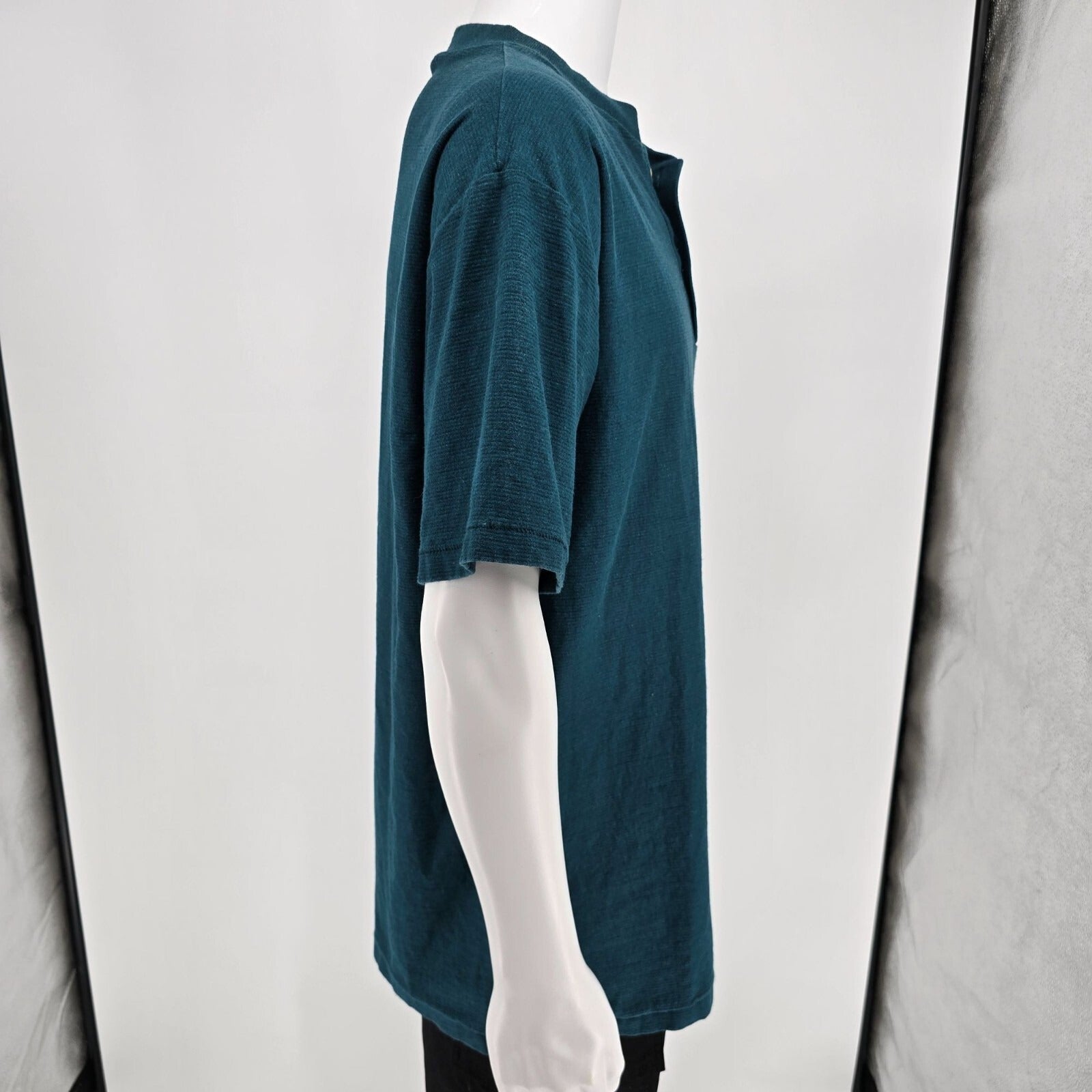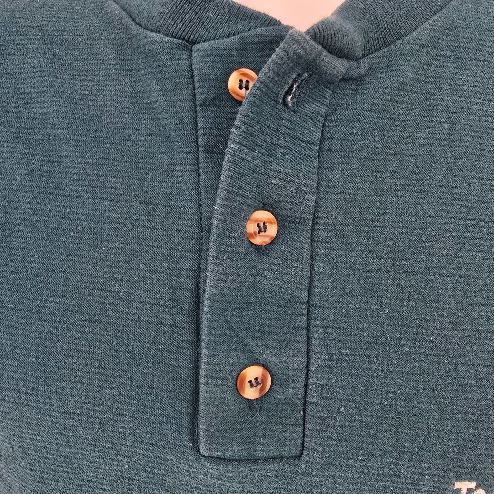 Notable Features: Single Stitch cuffs and hem, three-button henley collar with tortoiseshell-style buttons, textured fabric, embroidered chest logo