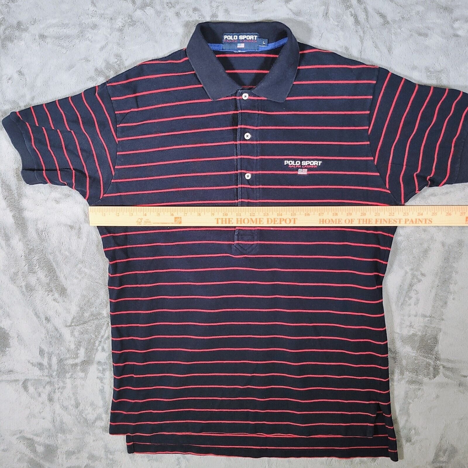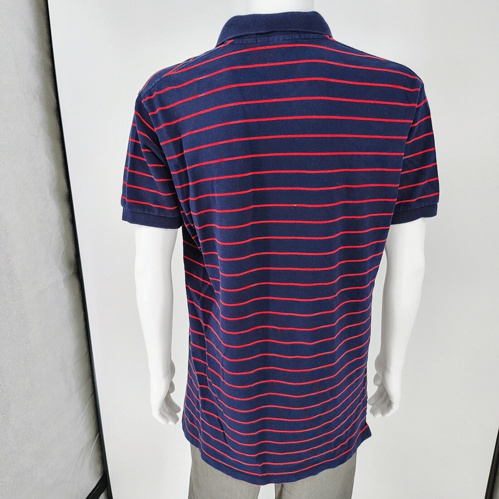 Vintage 1990s Polo Sport Ralph Lauren Blue and Red Striped Four Button Polo (L)