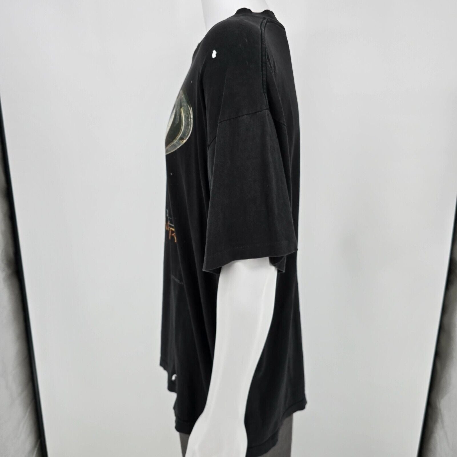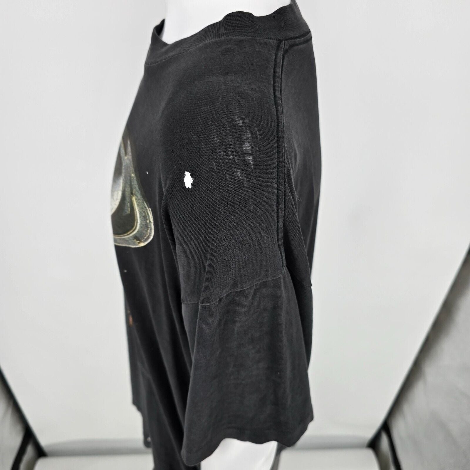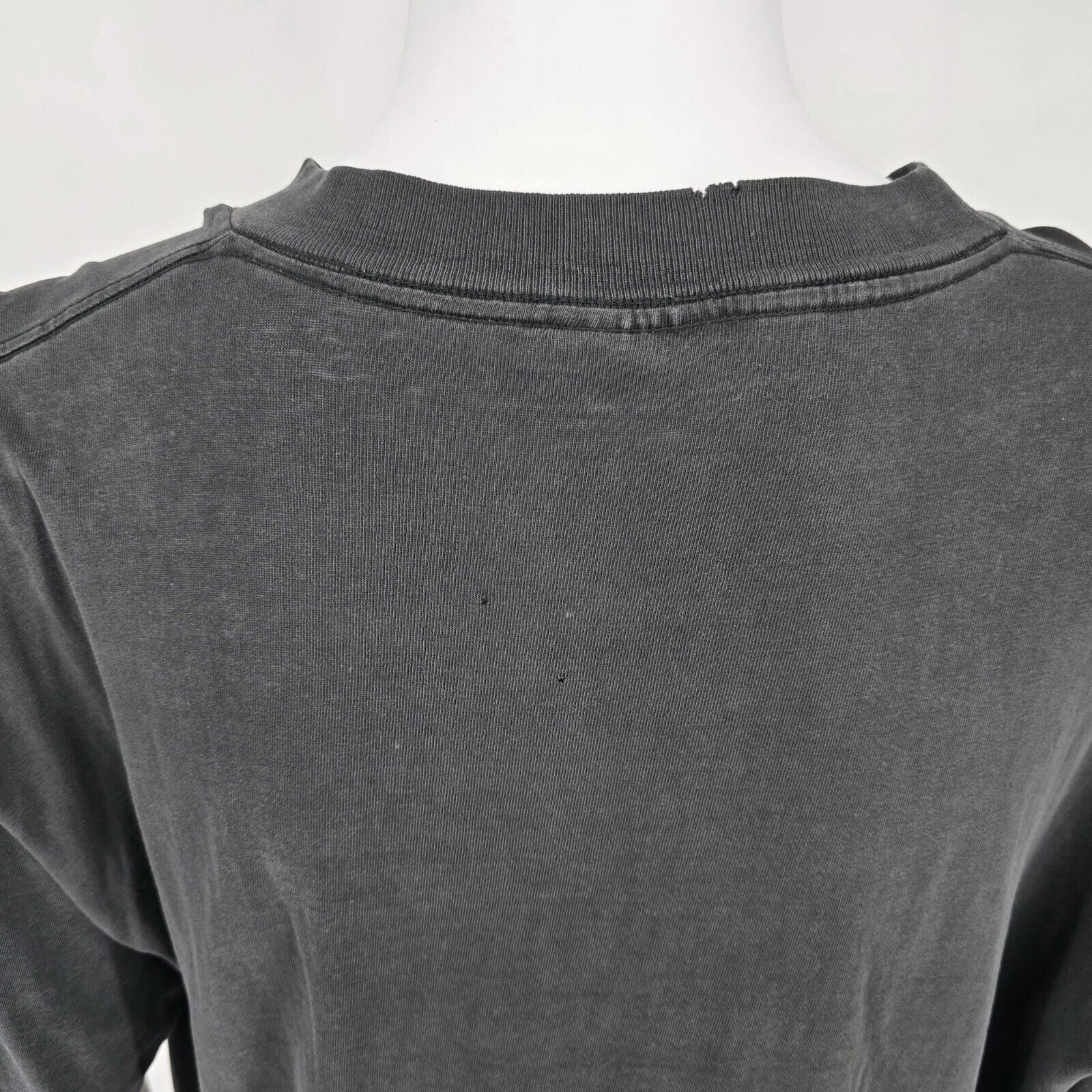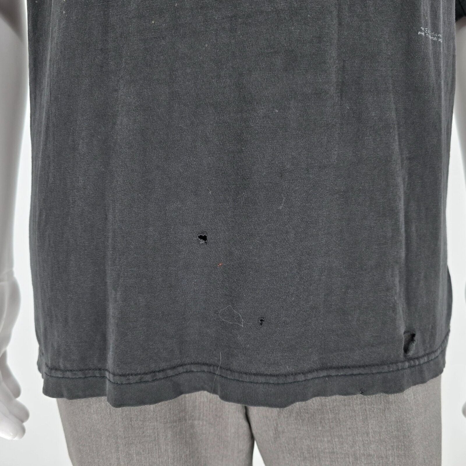 Multiple small holes on back near collar. Moderate to heavy fabric wear and fading throughout.