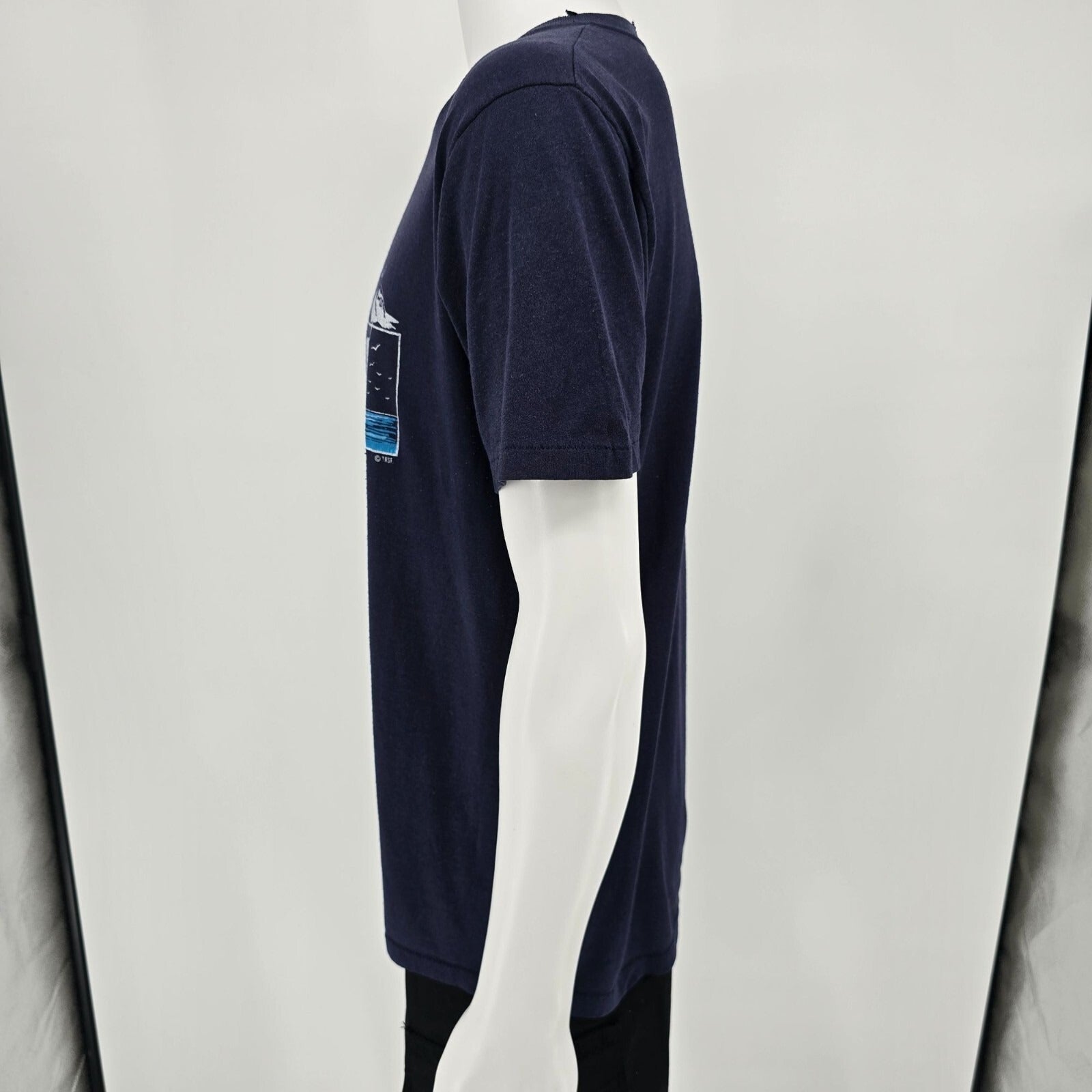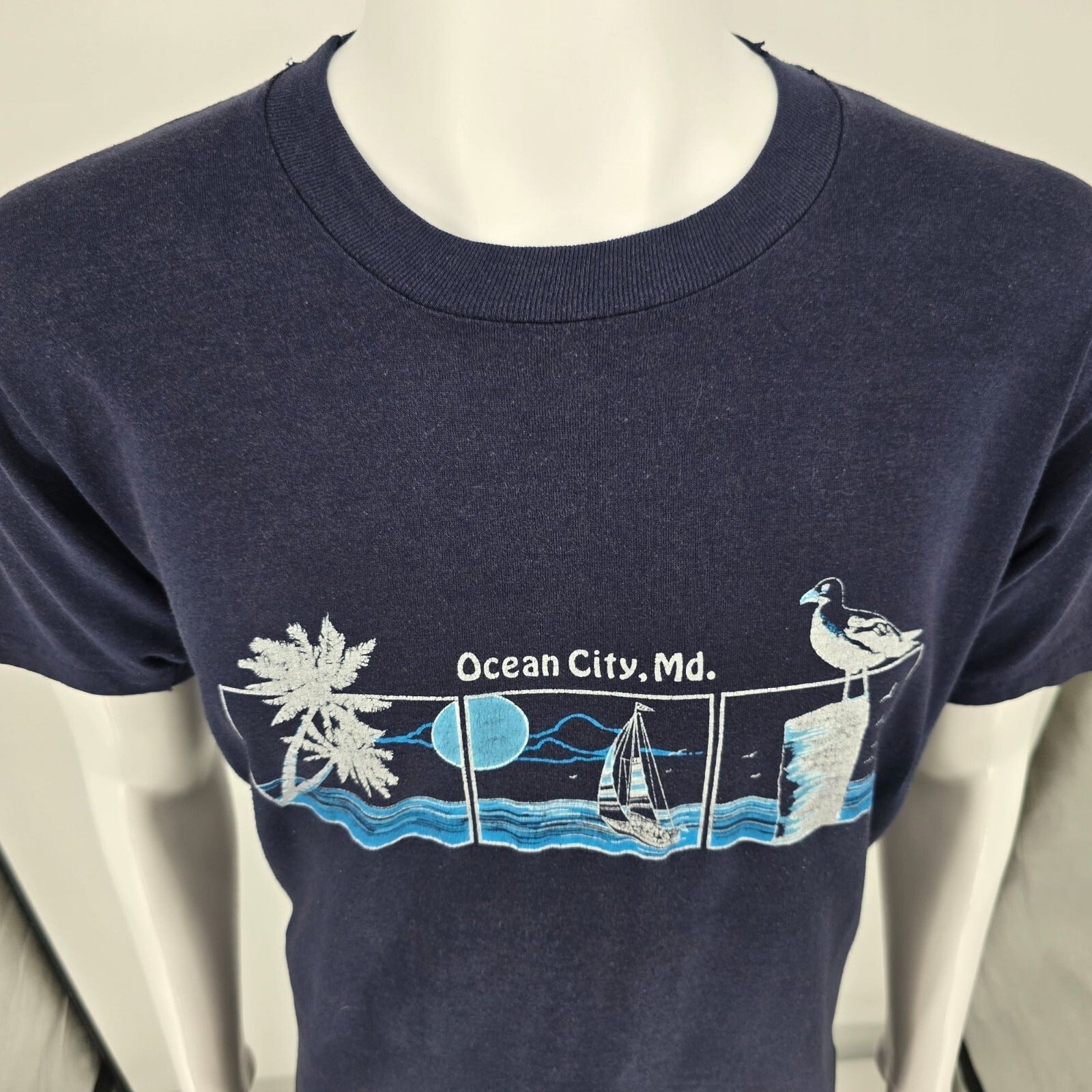 Notable Features: Single Stitch cuffs, double stitch hem, triptych style graphic with palm tree, sailboat, and perched seagull against seascape