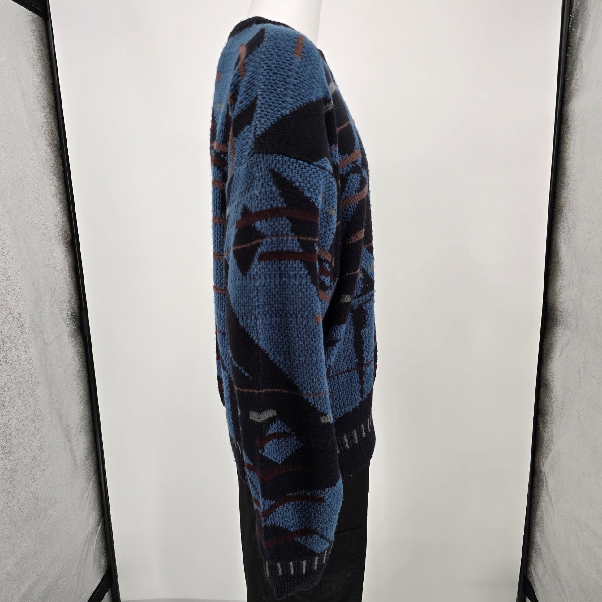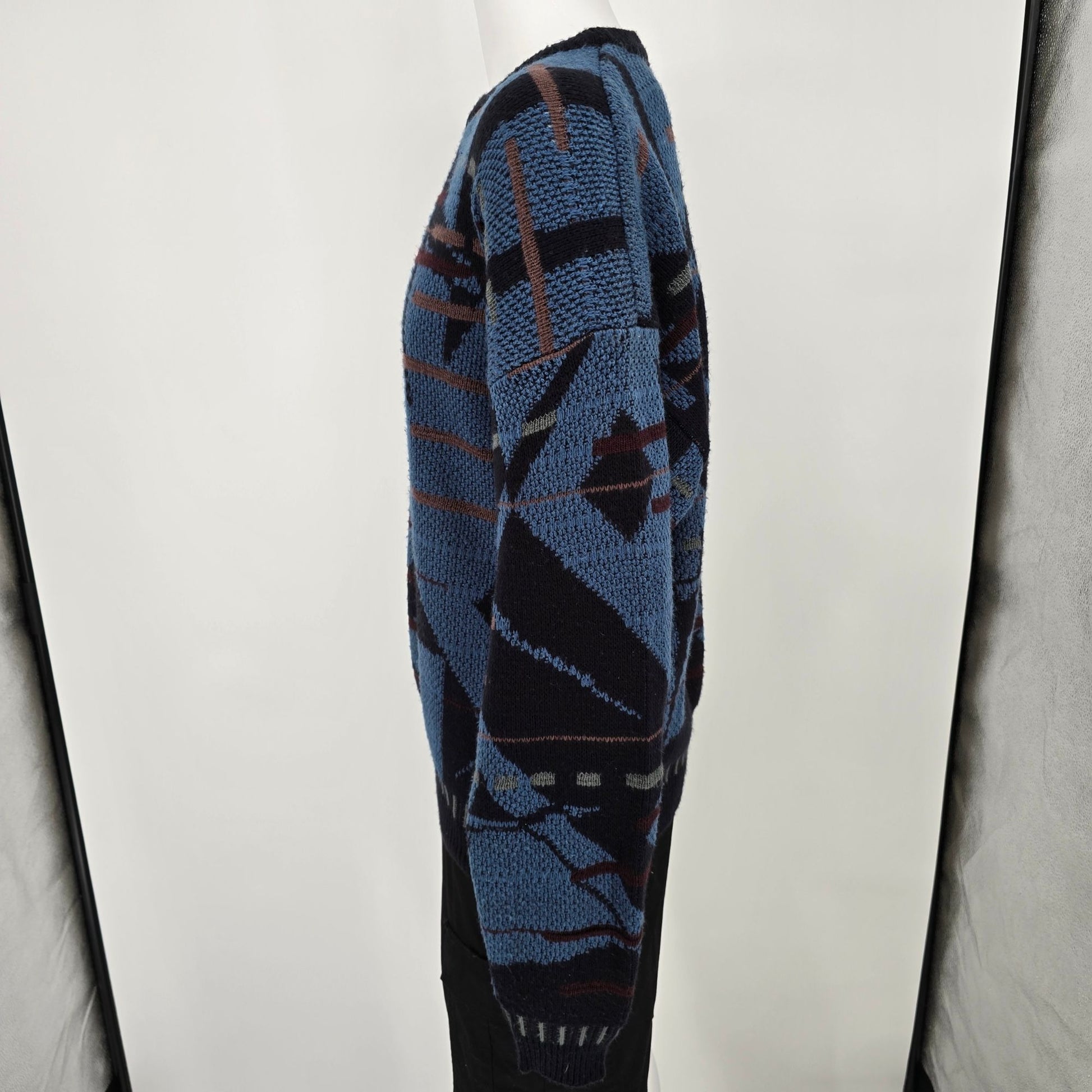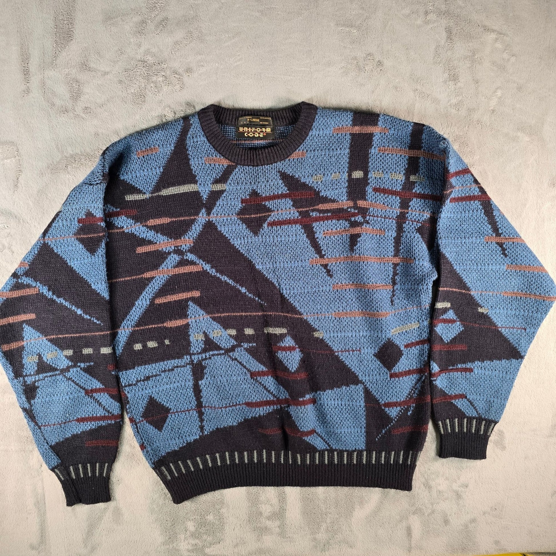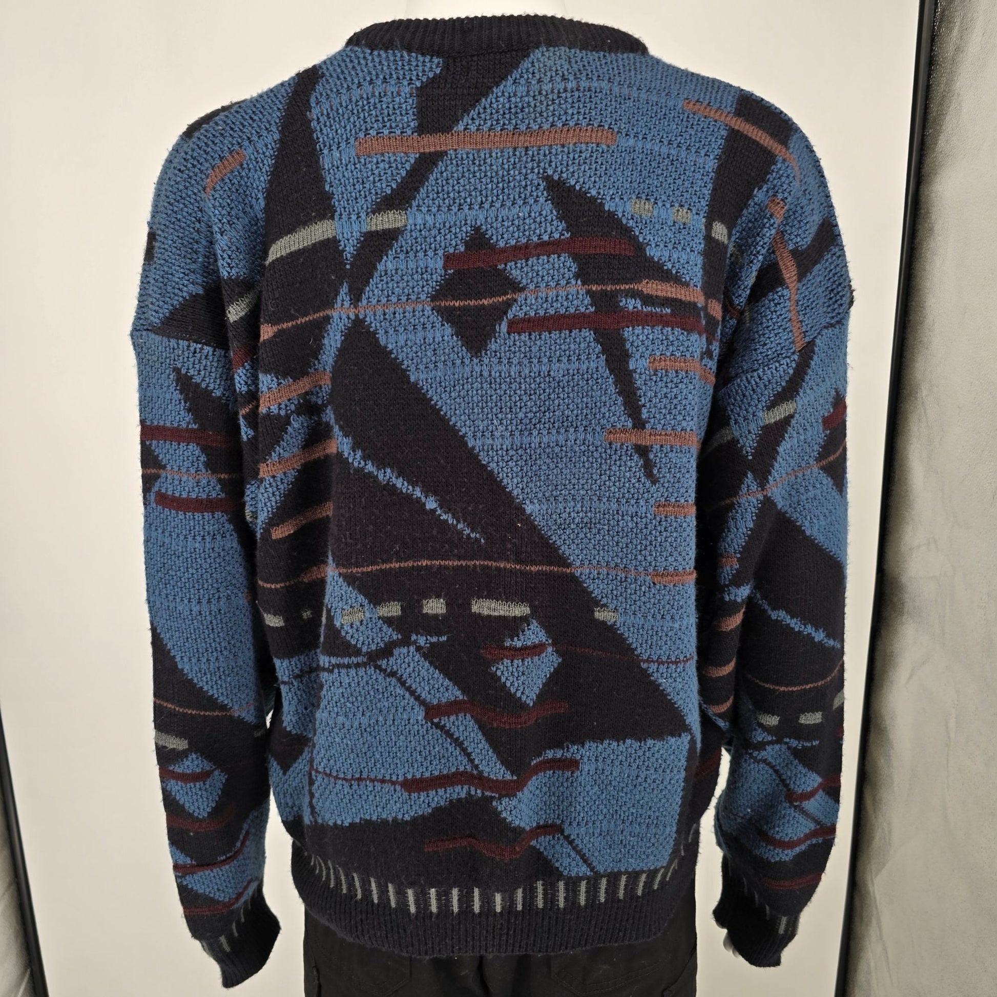 Vintage 1990s Uniform Code Blue/Black Acrylic Abstract Geometric Sweater (XL)